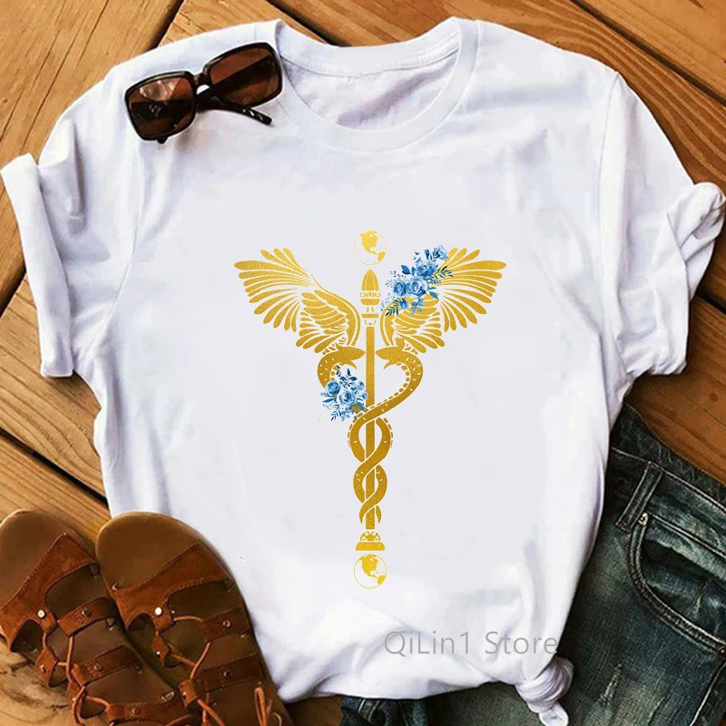 Flowers Caduceus Print Women's Vintage T Shirt Femme Summer Top Female White Short Sleeve Casual Roupas Tumblr Camisas Mujer Tee