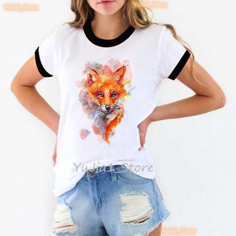Cute Fox With Forest Watercolour Design Print T Shirt Girls Summer Fashion Tops Tee Shirt Femme Harajuku Kawaii Clothes T-Shirt