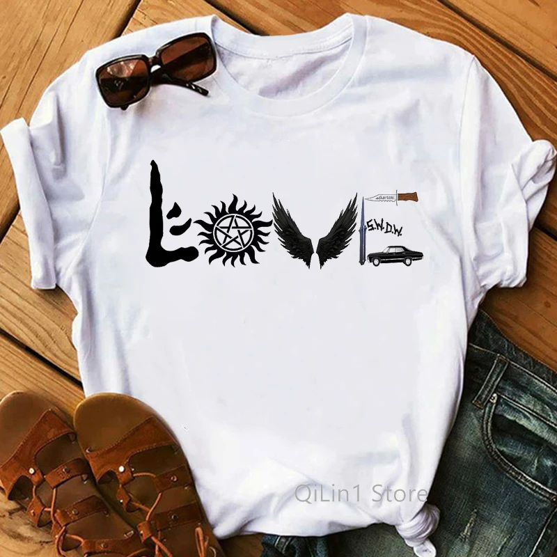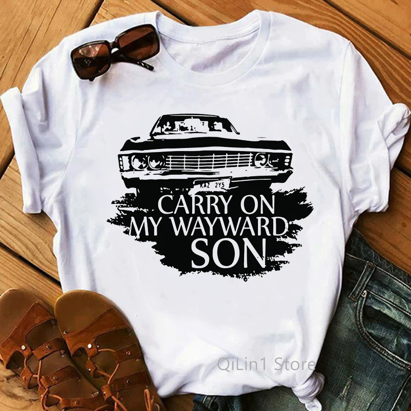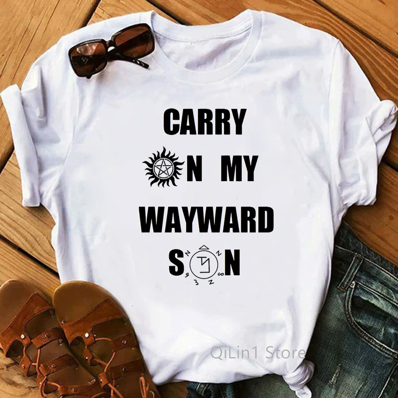 Vintage Supernatural T Shirt Women'S Dean Sam Winchester Castiel In My Wing Man Print Carry On My Wayward Son Tshirts Female Top