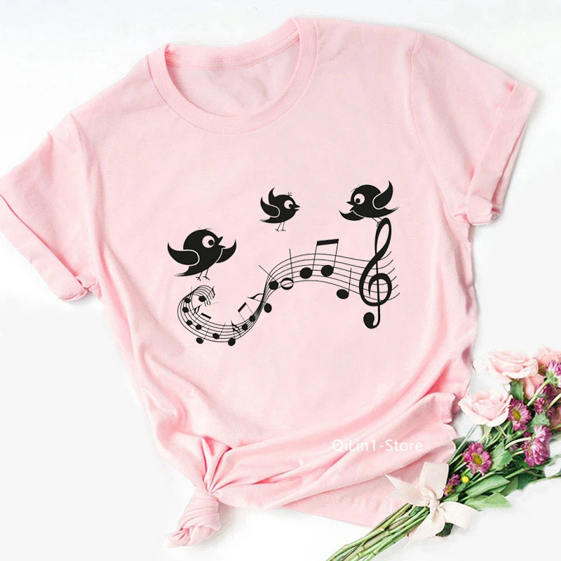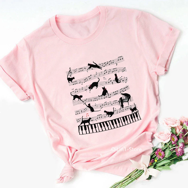 Funny Black Musical Note Cat Tee Shirt Femme Summer Top Female Pink T-Shirt Lovely Kitten Animal Print Tshirt Women T Shirt