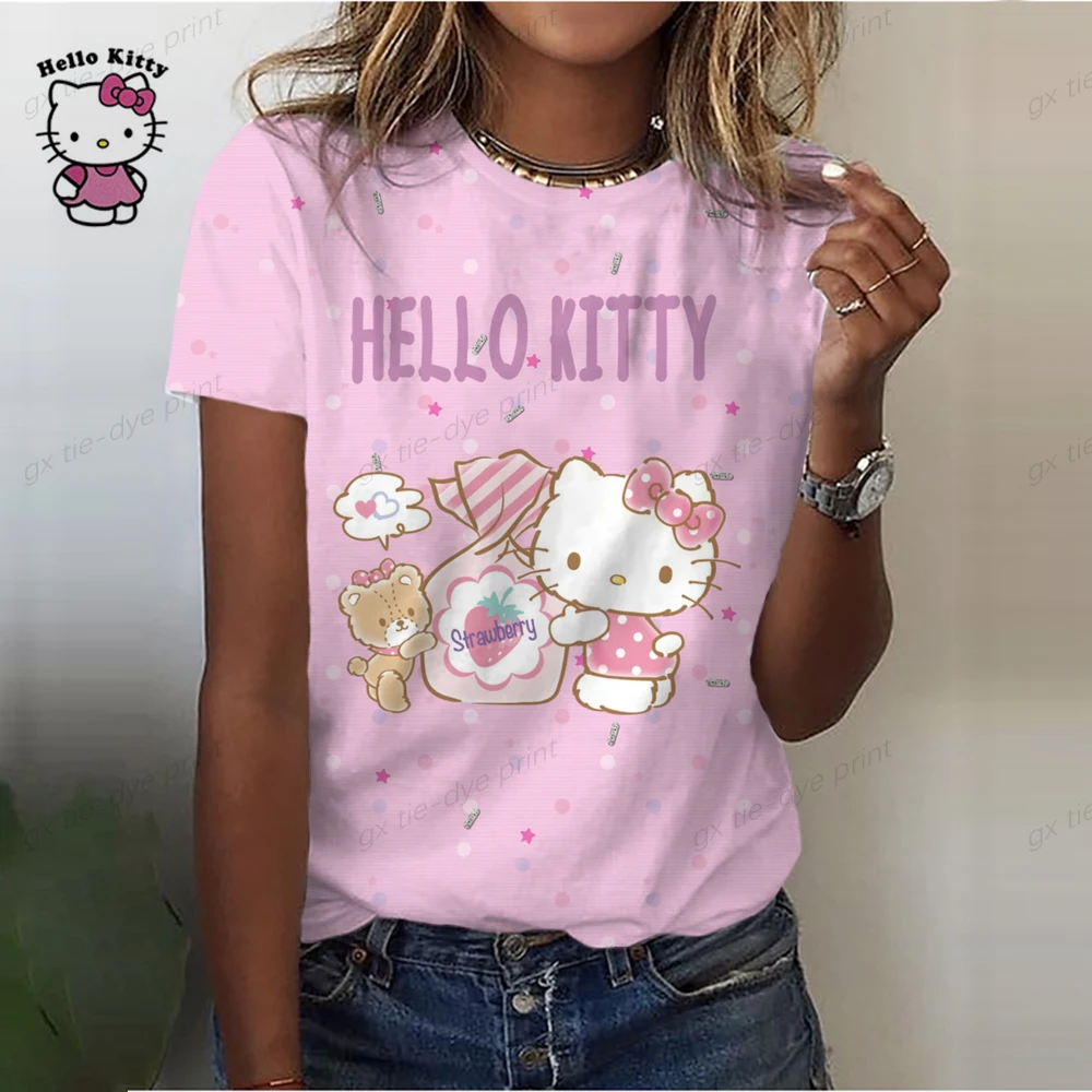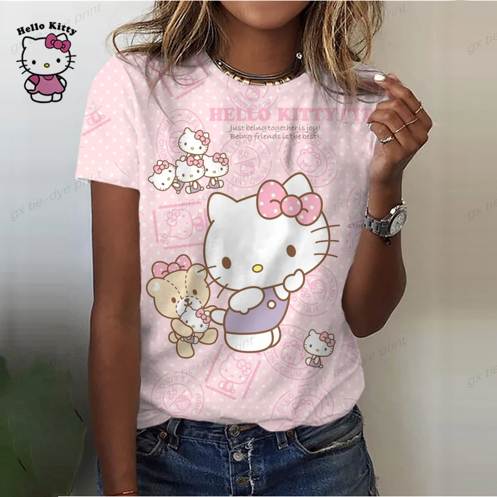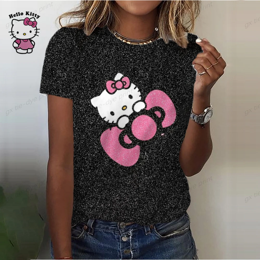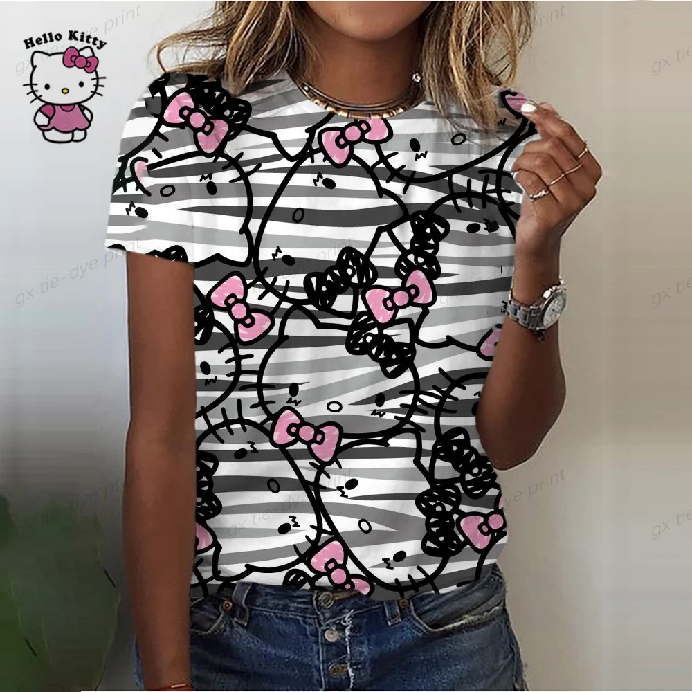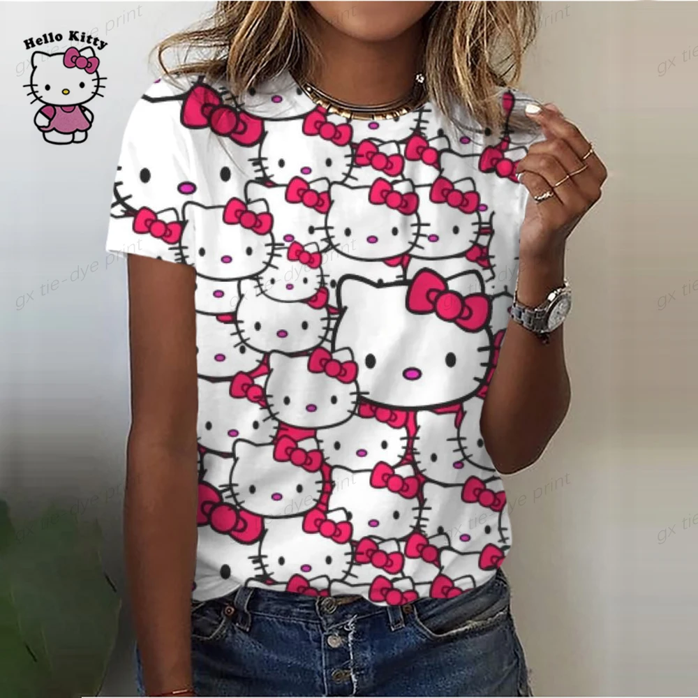 Ladies O-Neck Cartoon Print Tee Top 2023 New Summer Women Hello Kitty Print T Shirt Street Casual Loose T Shirts