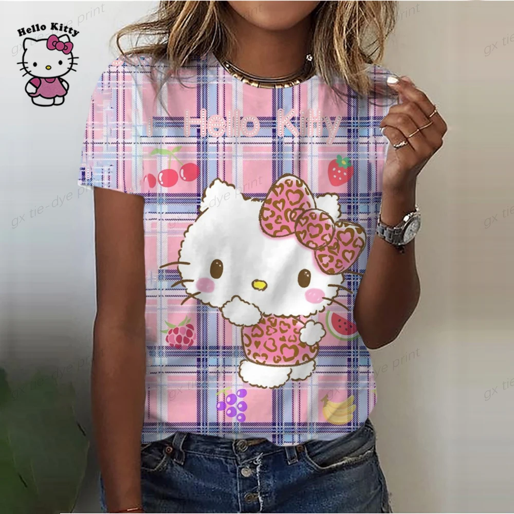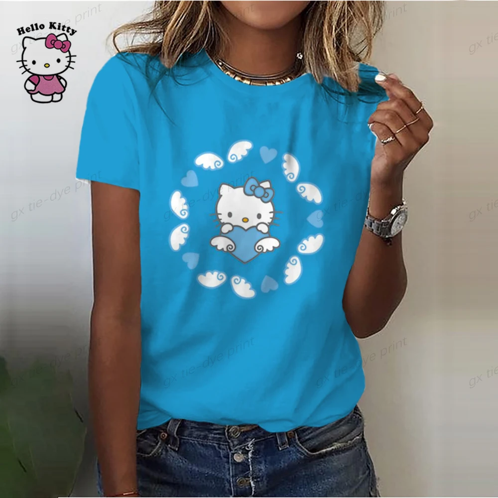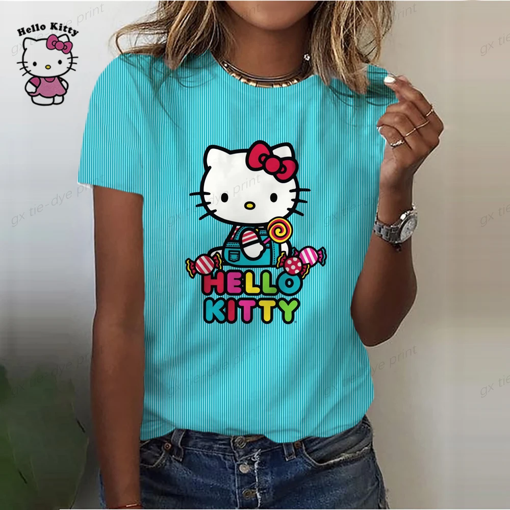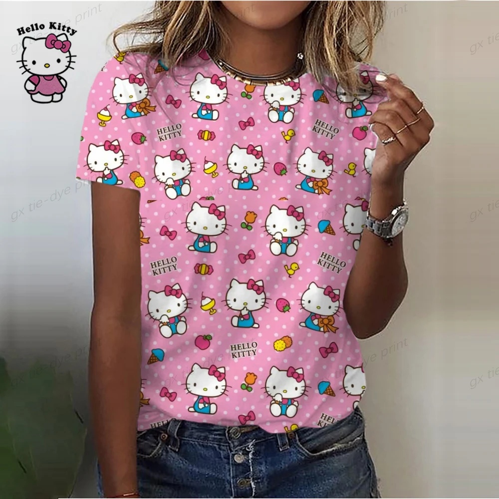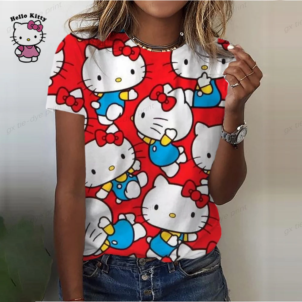 Cartoon Hello Kitty Graphic Print Ladies spring and autumn T-Shirt 90S Summer Loose Blouses Short Sleeve Round Neck Female Top