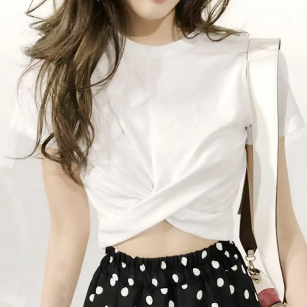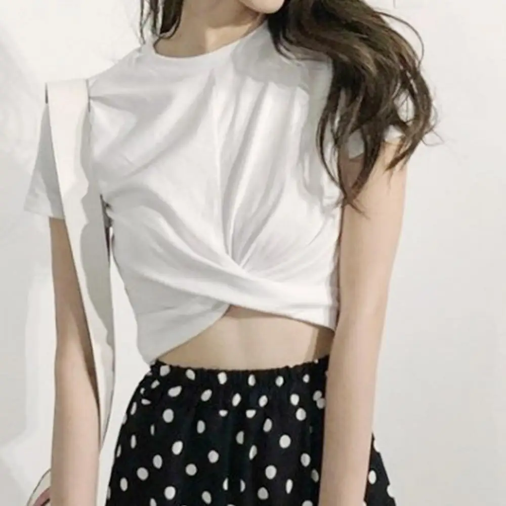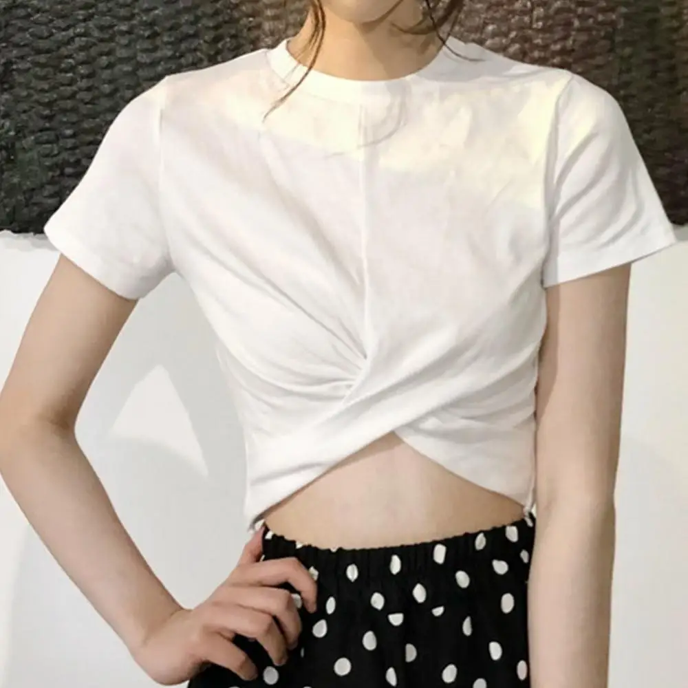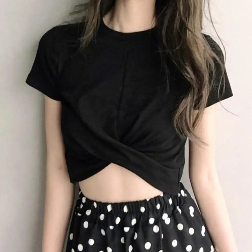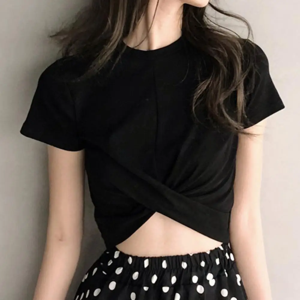 Women T-shirt Summer Casual Top Female Short Sleeve Sexy Solid Color Tops Plus Size Simple Criss-cross Hem Crop O Neck T-shirt