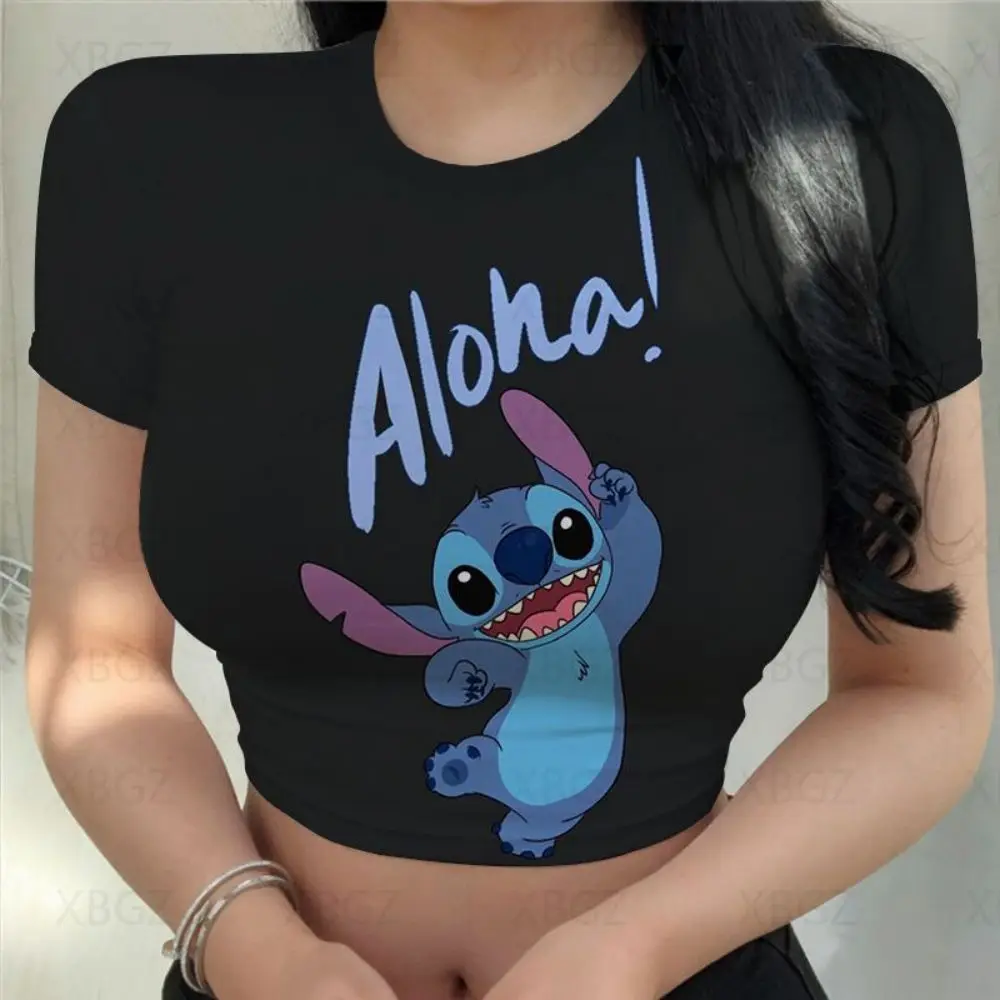 Tight Fashion Woman Blouses 2024 Party Stitch Print Kawaii Cartoon Crop Top Slim Fit Female Clothing T-shirts Disney Shirt Y2k