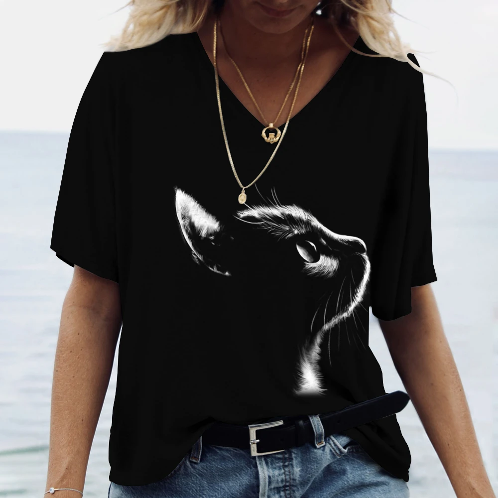 Fashion Woman Blouses 2023 T-Shirt Women's 3d Cats Print Black Kawaii T Shirt Female Clothing Oversized Summer Ladies V-Neck Top