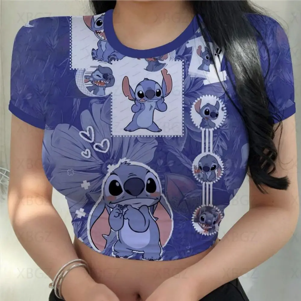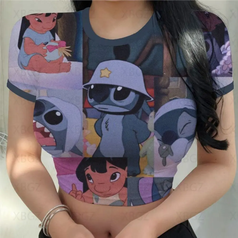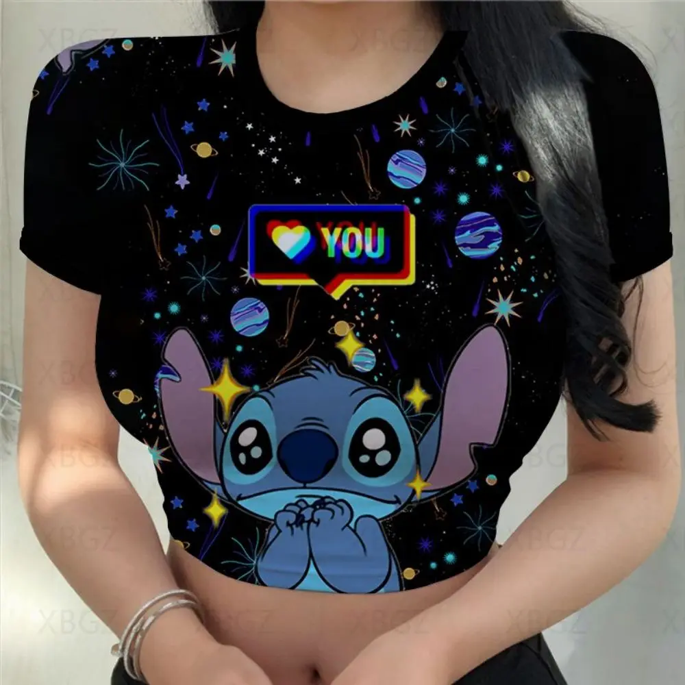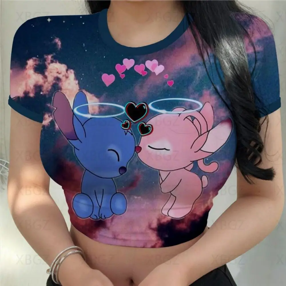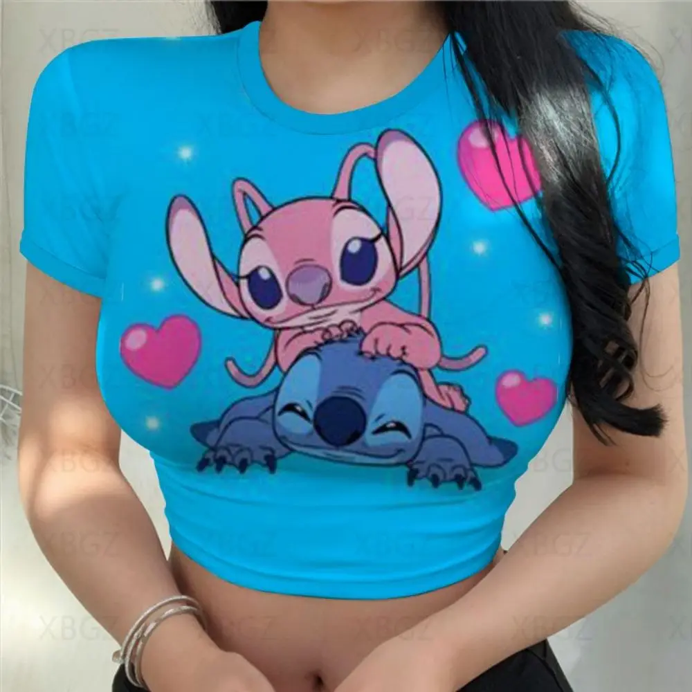 Slim Fit Female Clothing Party Women's T-shirt Print Kawaii Sexy Y2k Fashion T-shirts Cartoon Stitch Summer Tight Disney Tops 3D