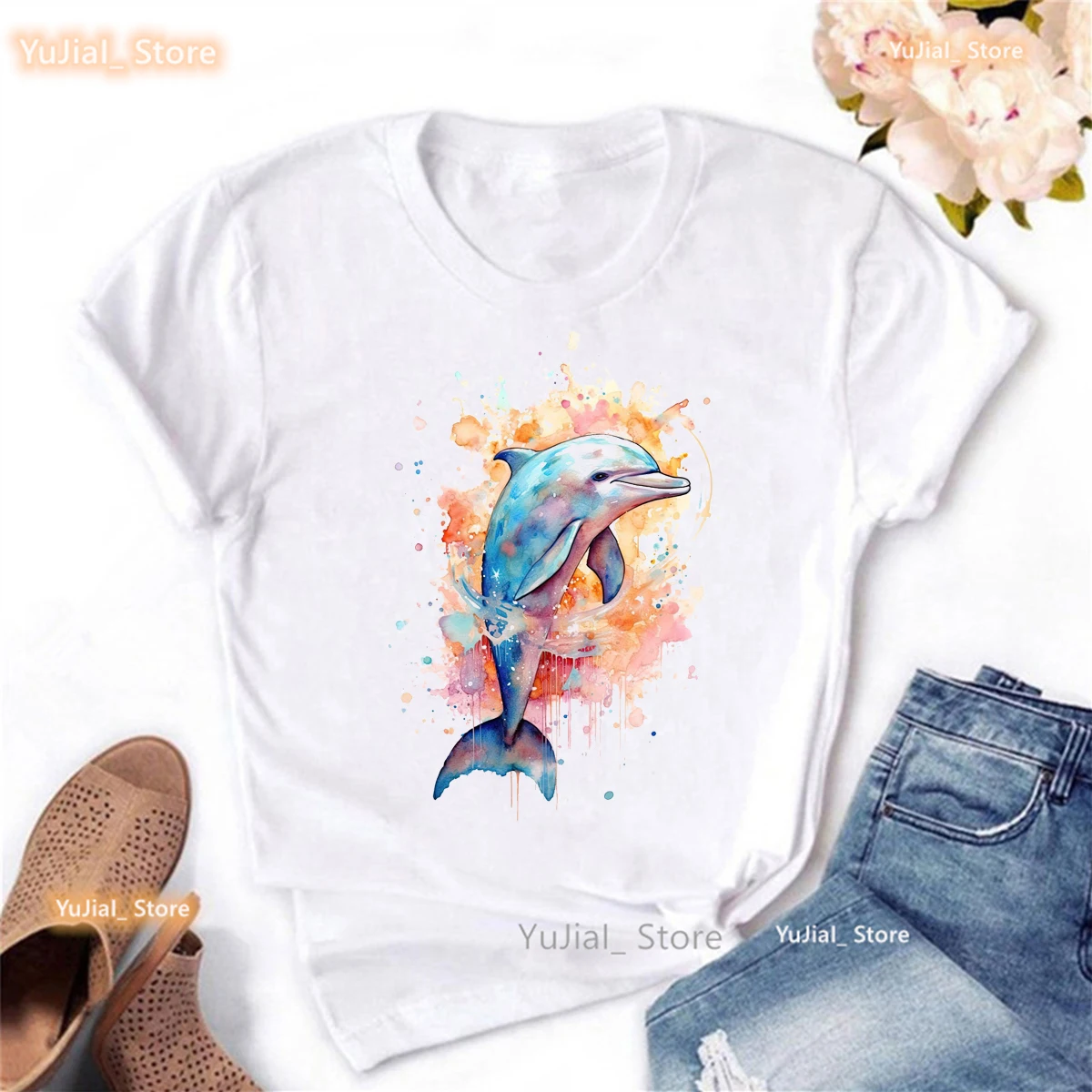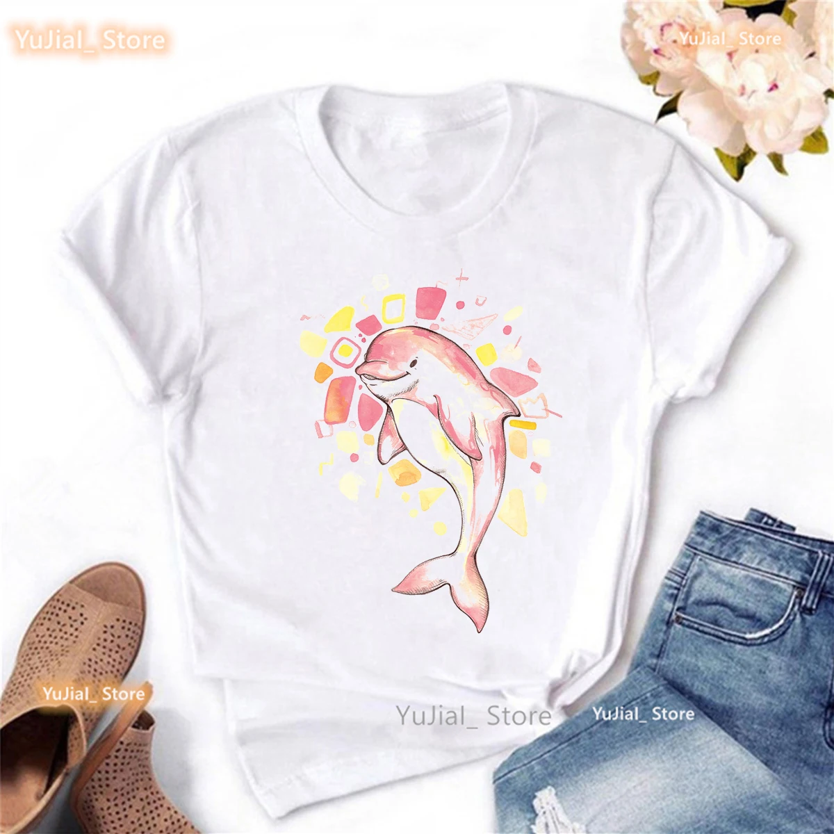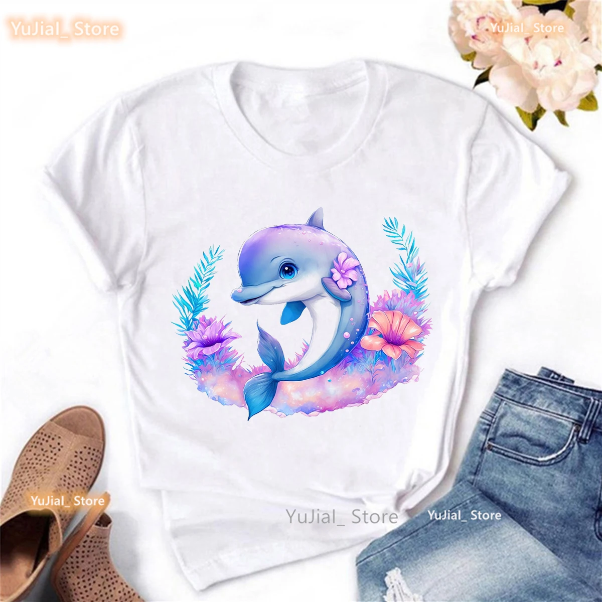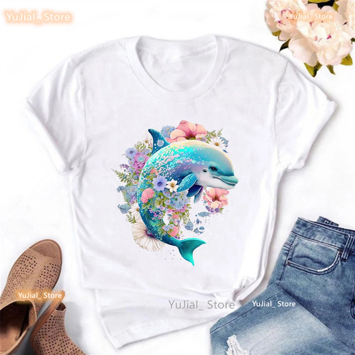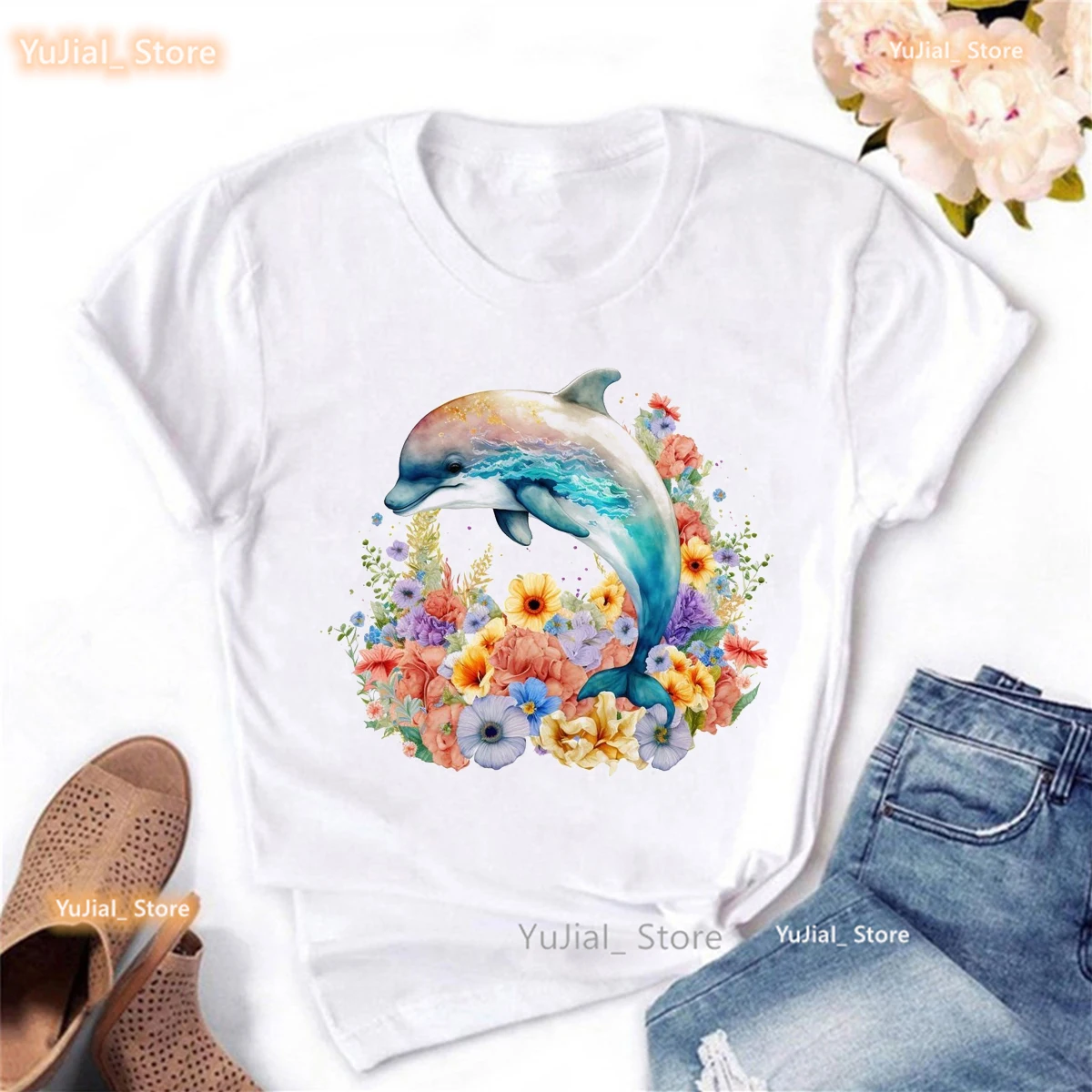Dolphin Flowers Animal Print T Shirt Girls Kawaii Whale Tshirt Women Casual Basic Foundation T-Shirt Femme Summer Tops Tee