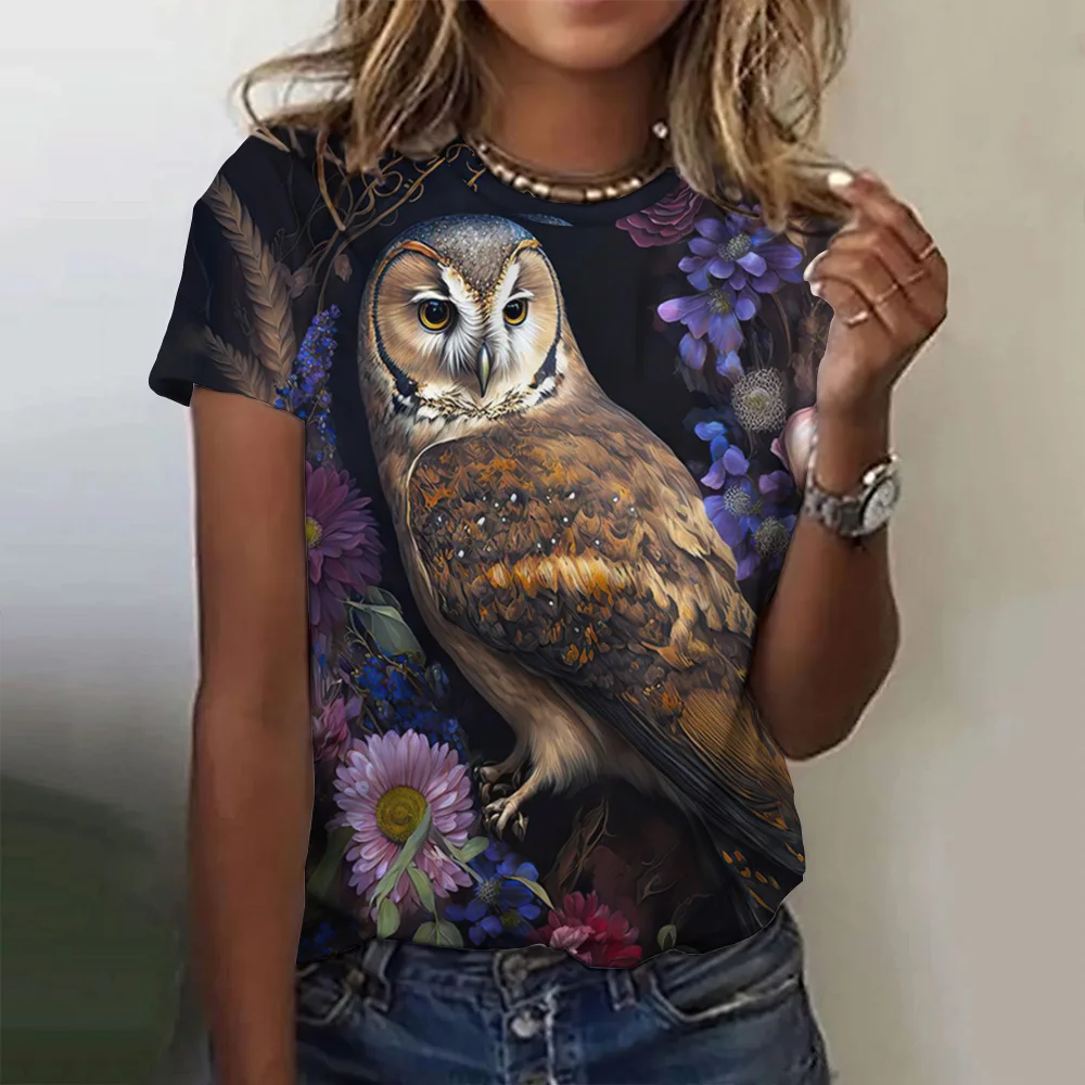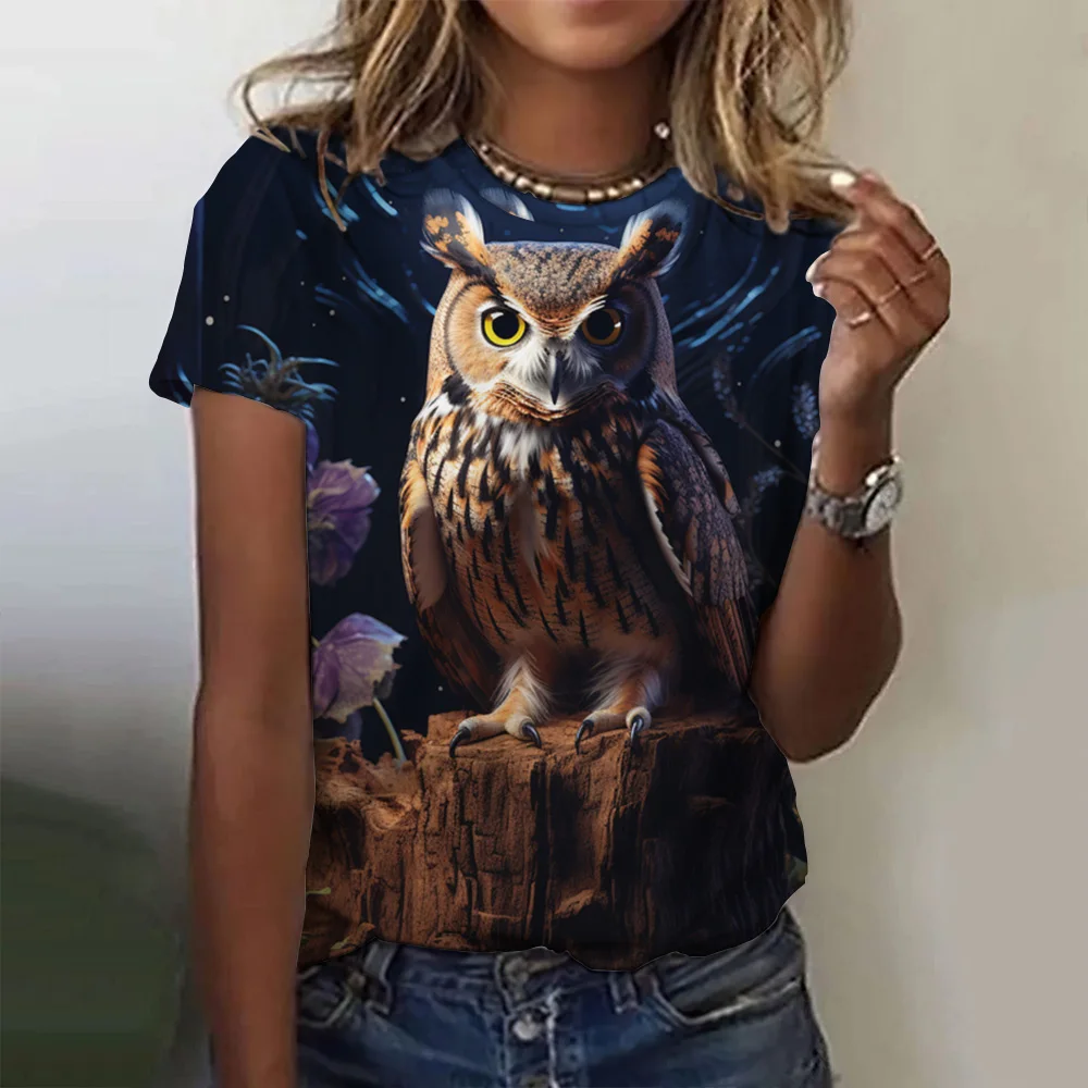 Fashion Women Short Sleeve 3d Cute Owl Graphic Printed Tees Animal Print Round Neck T-Shirt Oversized Female Clothing Ladies Top