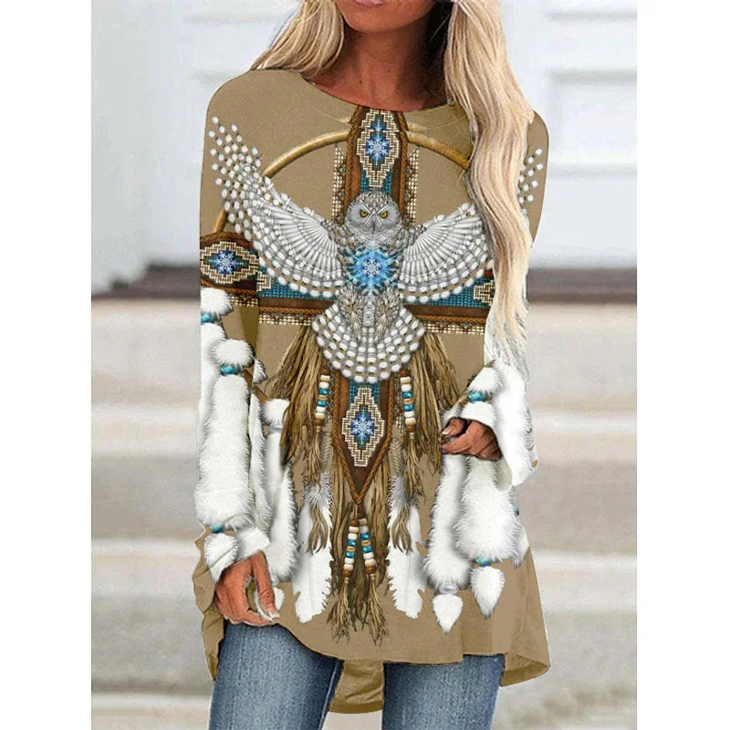 Women's Bohemian Long Sleeve T-Shirts Imitation Cotton Tshirt Harajuku O-Neck Casual Oversize Tops Spring & Autumn Owls Clothing