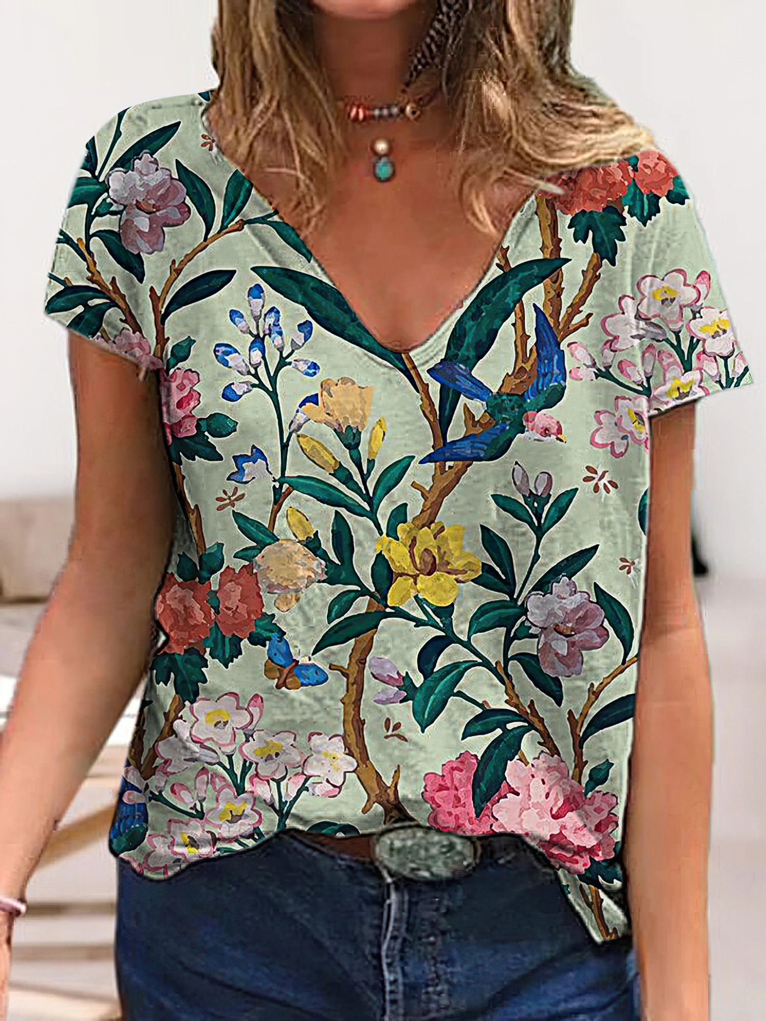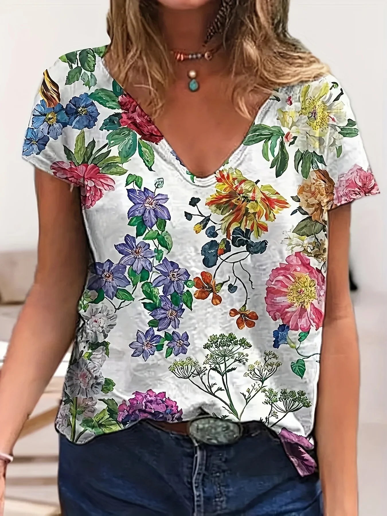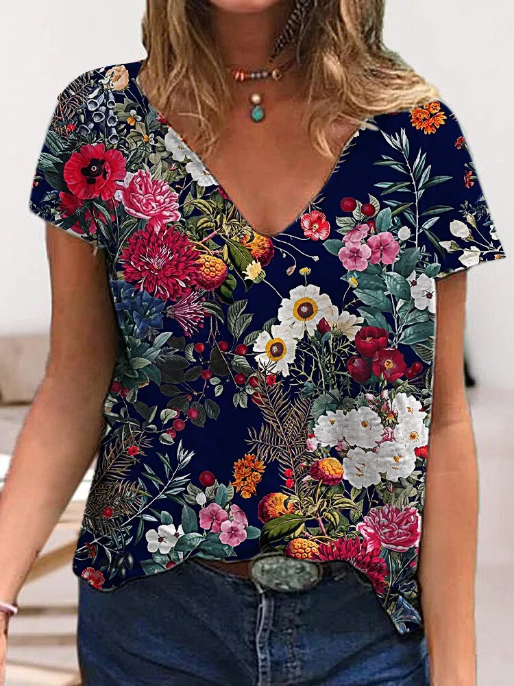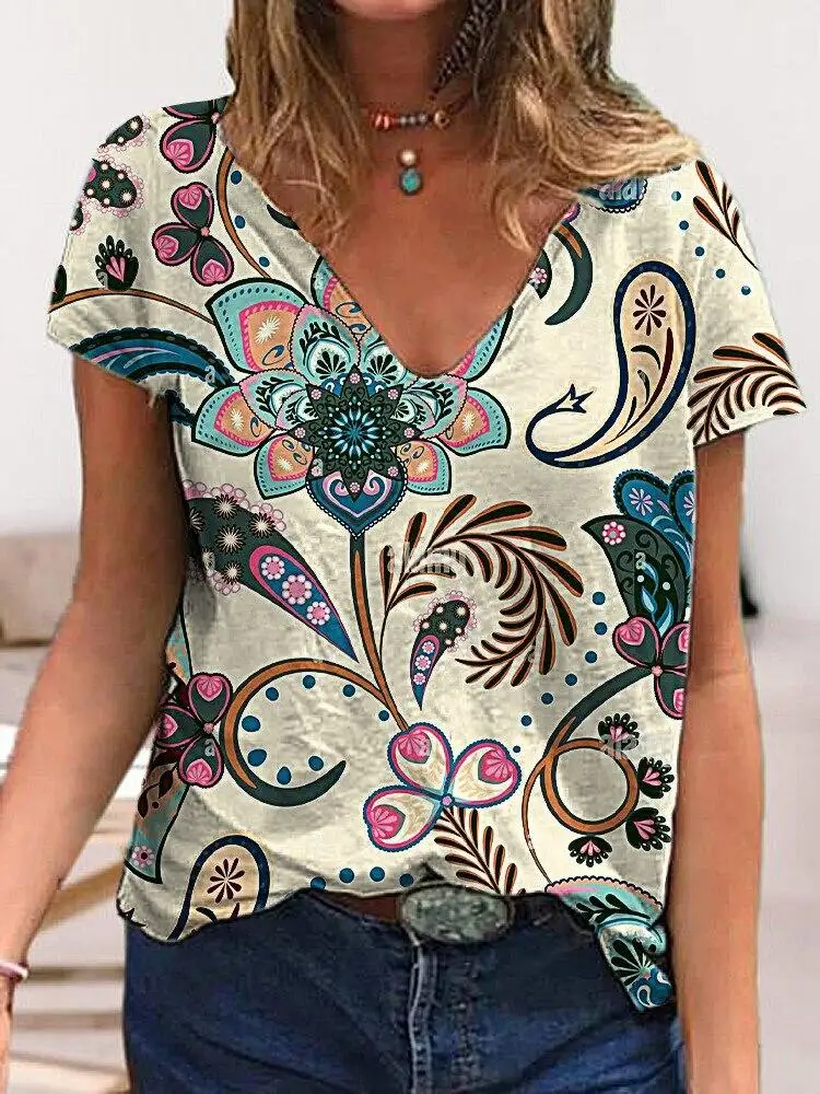 2024 Floral Print T-Shirt For Women V-Neck Blouse Plus Size Top Summer Women's Trend Clothing Short Sleeve Shirt Oversized Tee