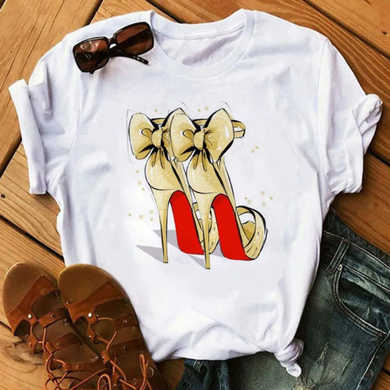 New spring/summer women's short-sleeved T-shirt Fashion red high-heel printed T-shirt