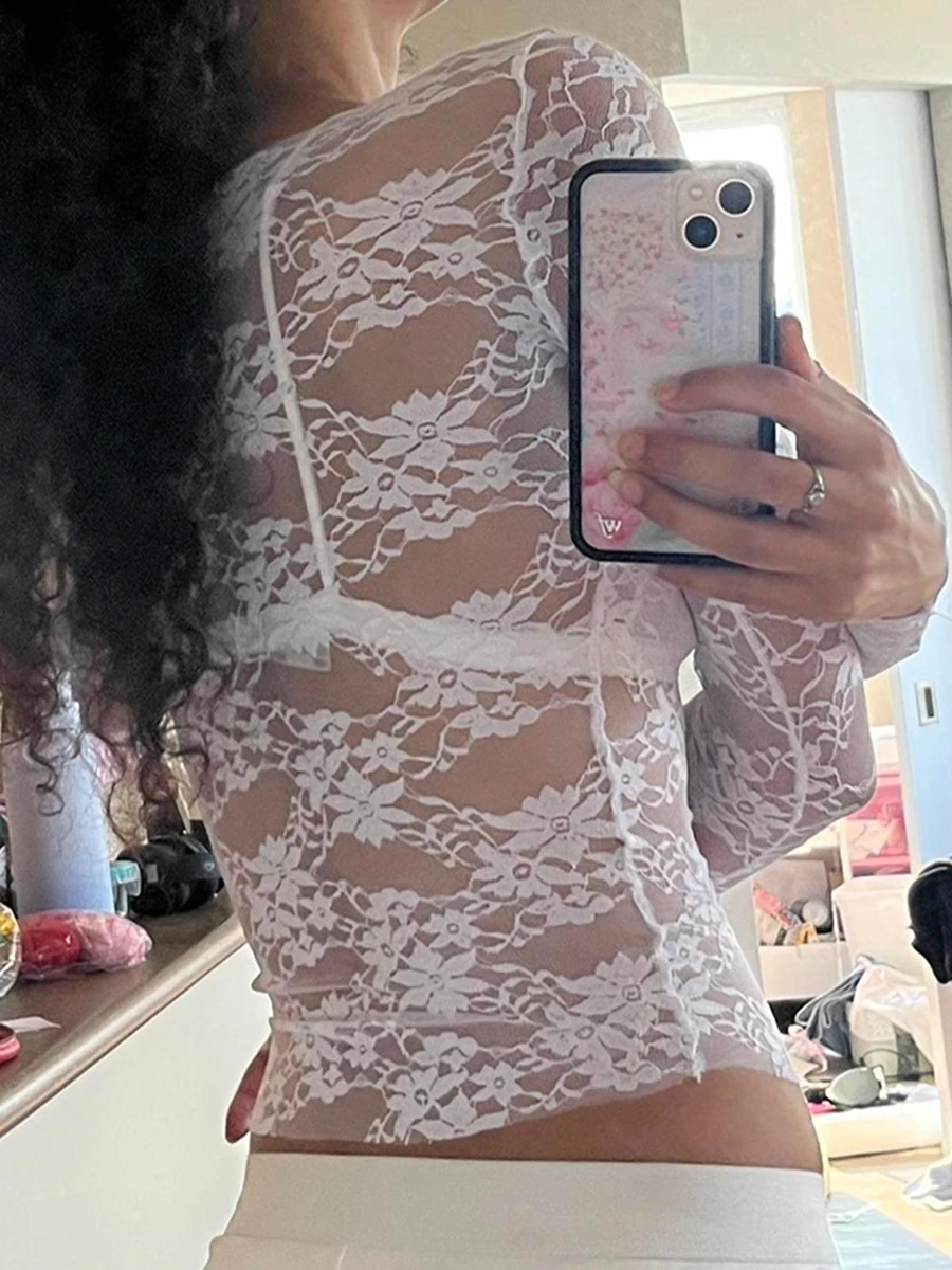 Women Floral Lace Crop Tops Sexy Sheer Long Sleeve Basic Shirt Female Fitted Pullover Club Streetwear Aesthetic Grunge Clothes