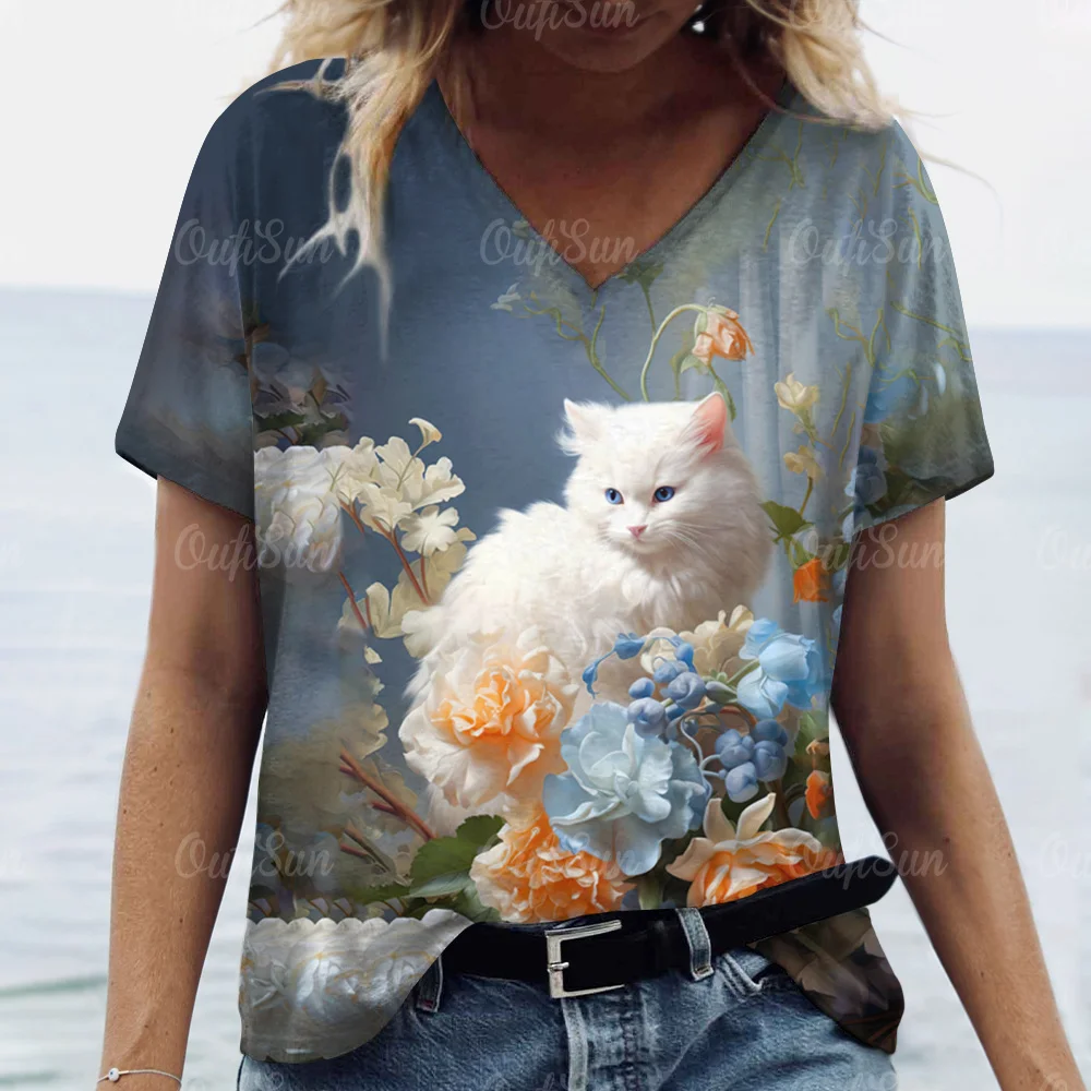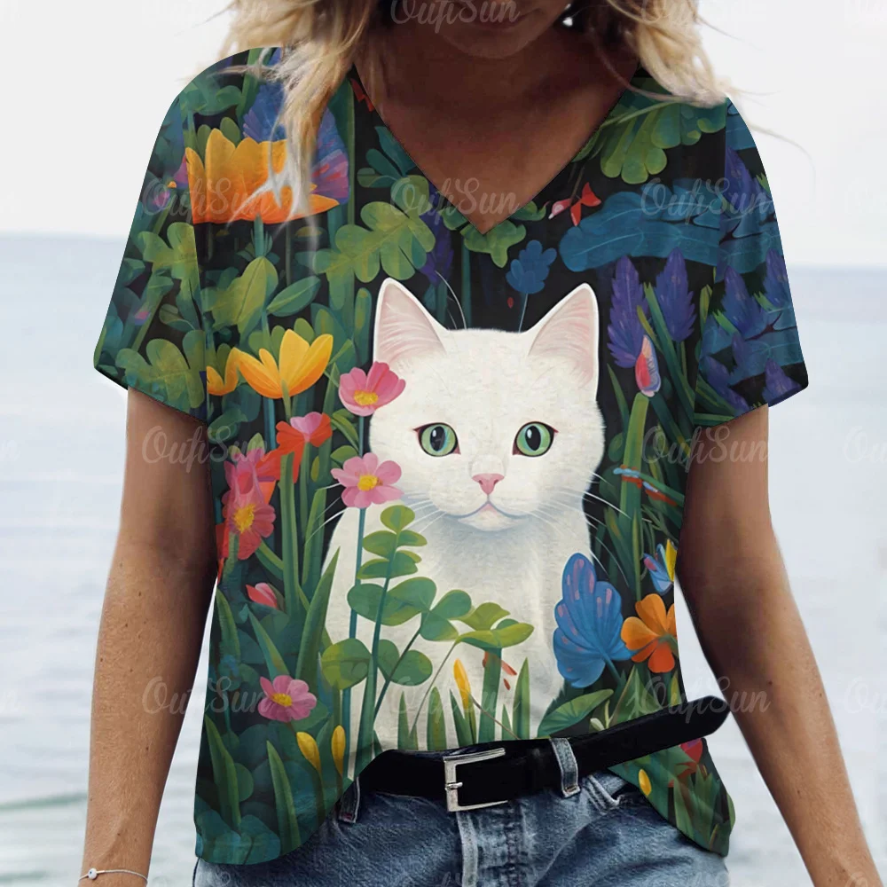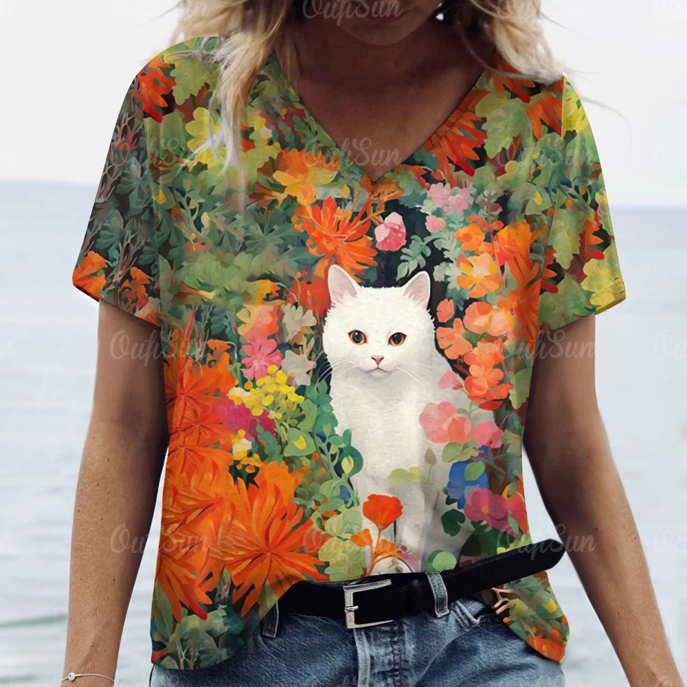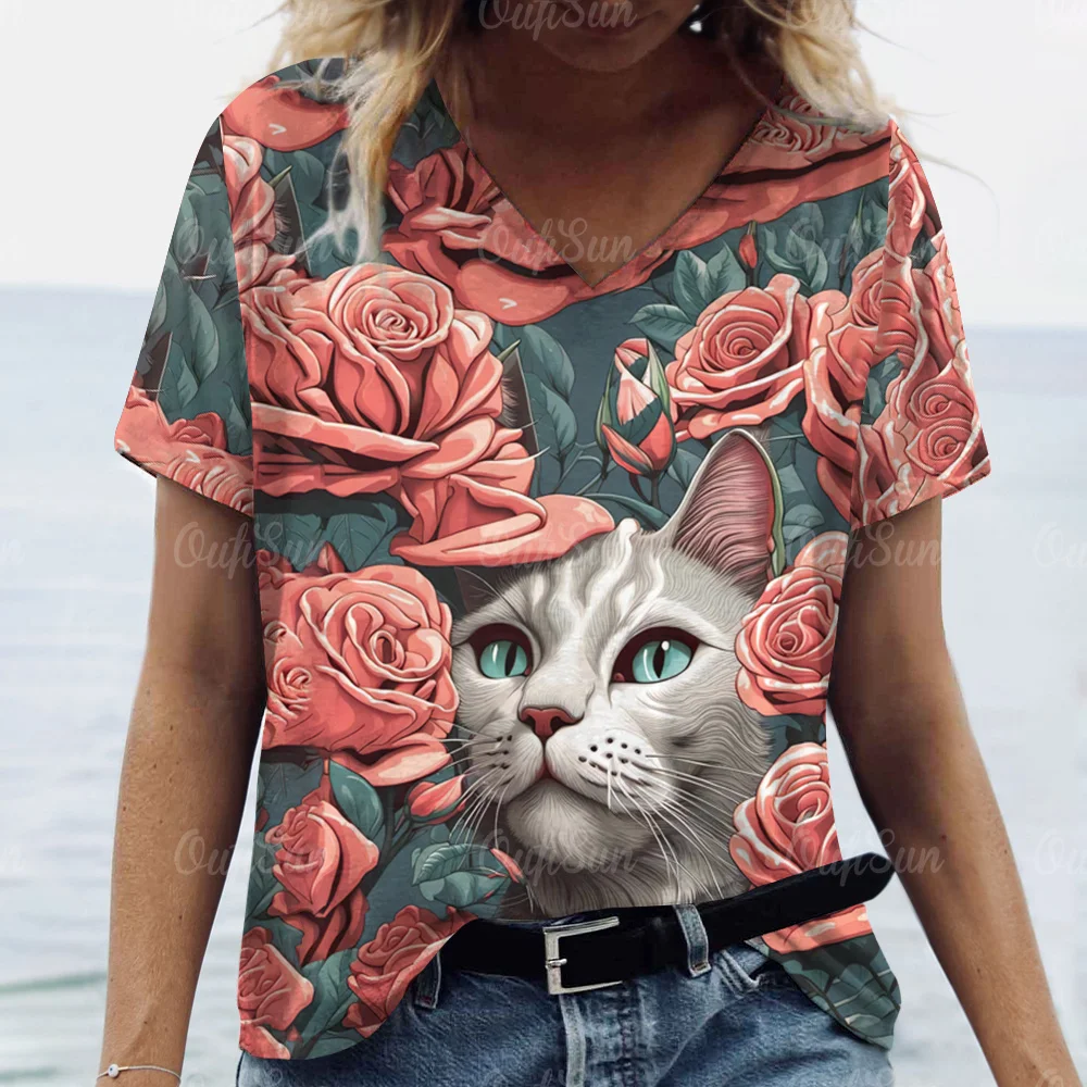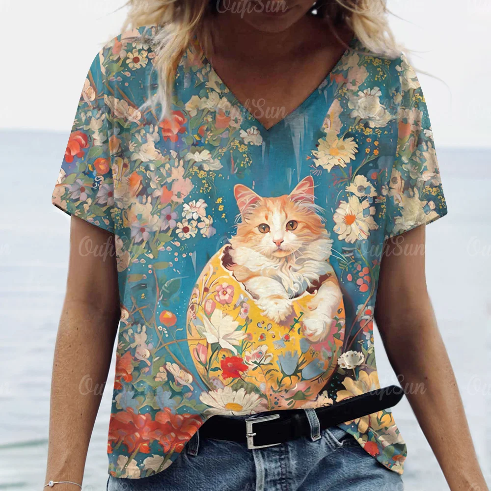 New Women T-shirt Cartoon Cat Print Oversized Women's Trending Clothing Fashion Short Sleeve Shirt Women V-Neck Blouse 2024