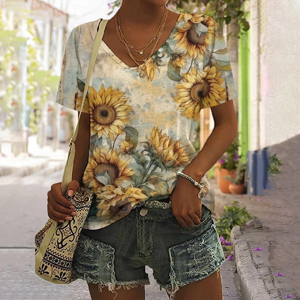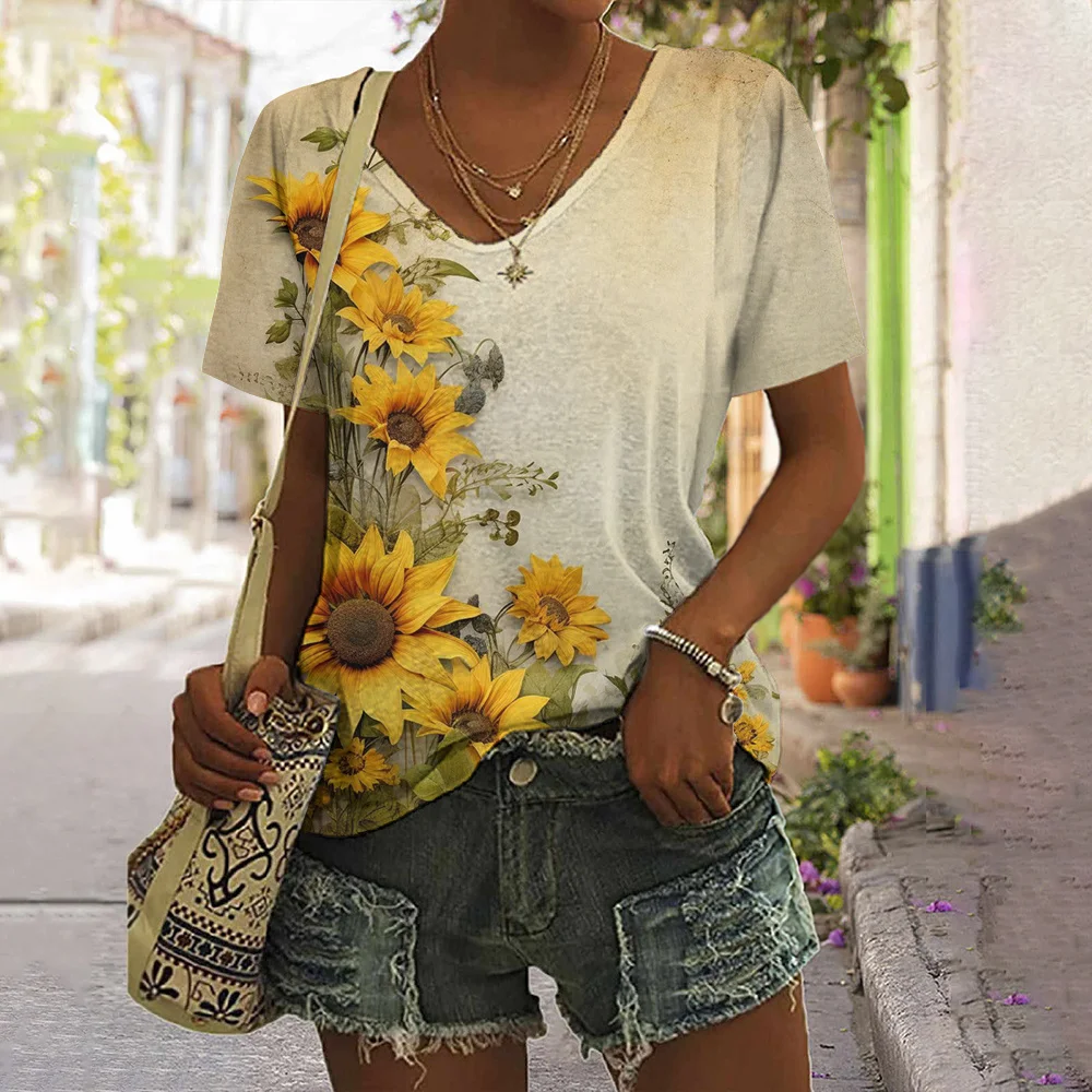 New Sunflower Print Women's T-shirts Plus Size Floral Graphic T-shirt Female Shirt Women's Clothing Oversized Tee Crop Top