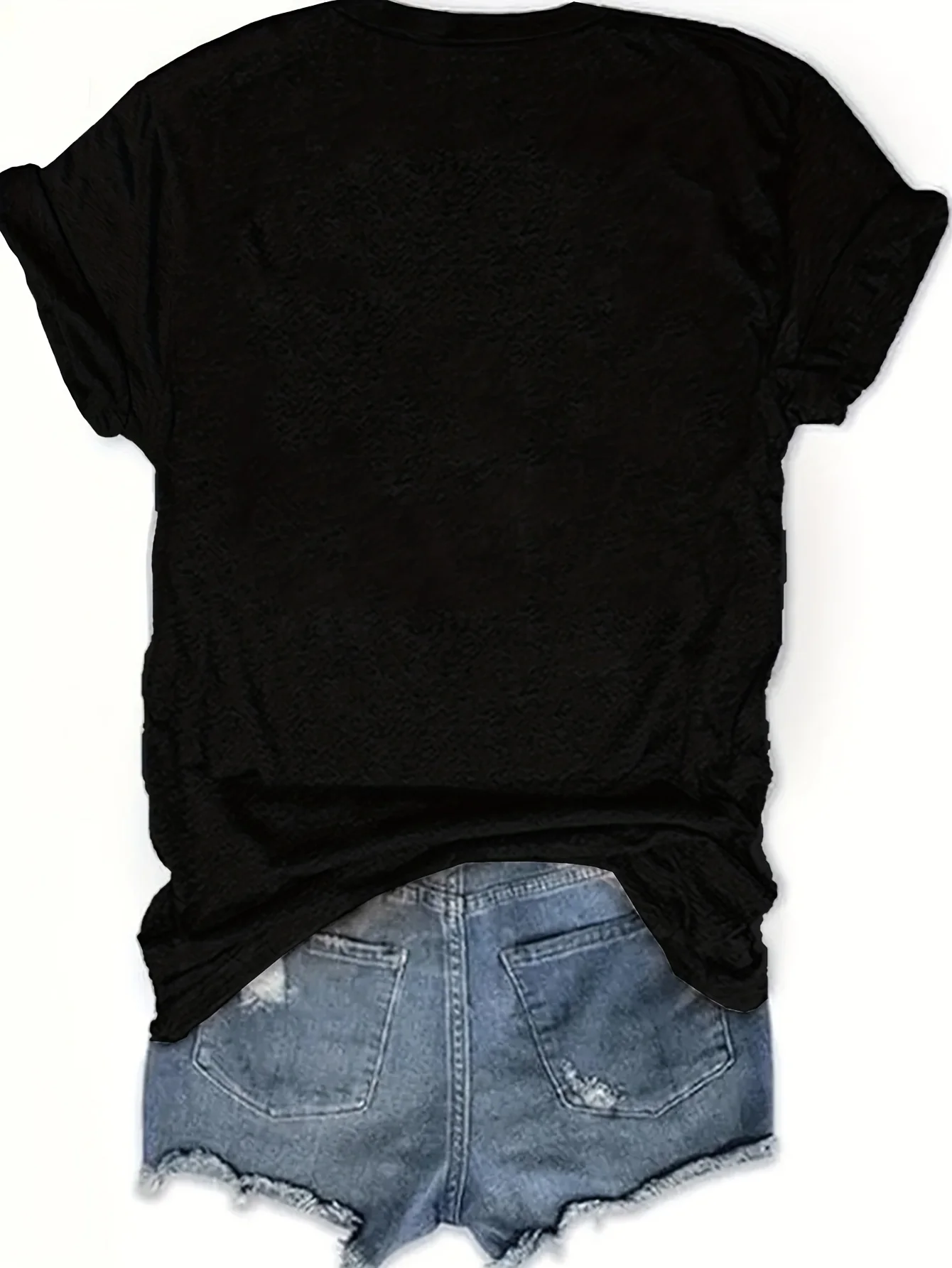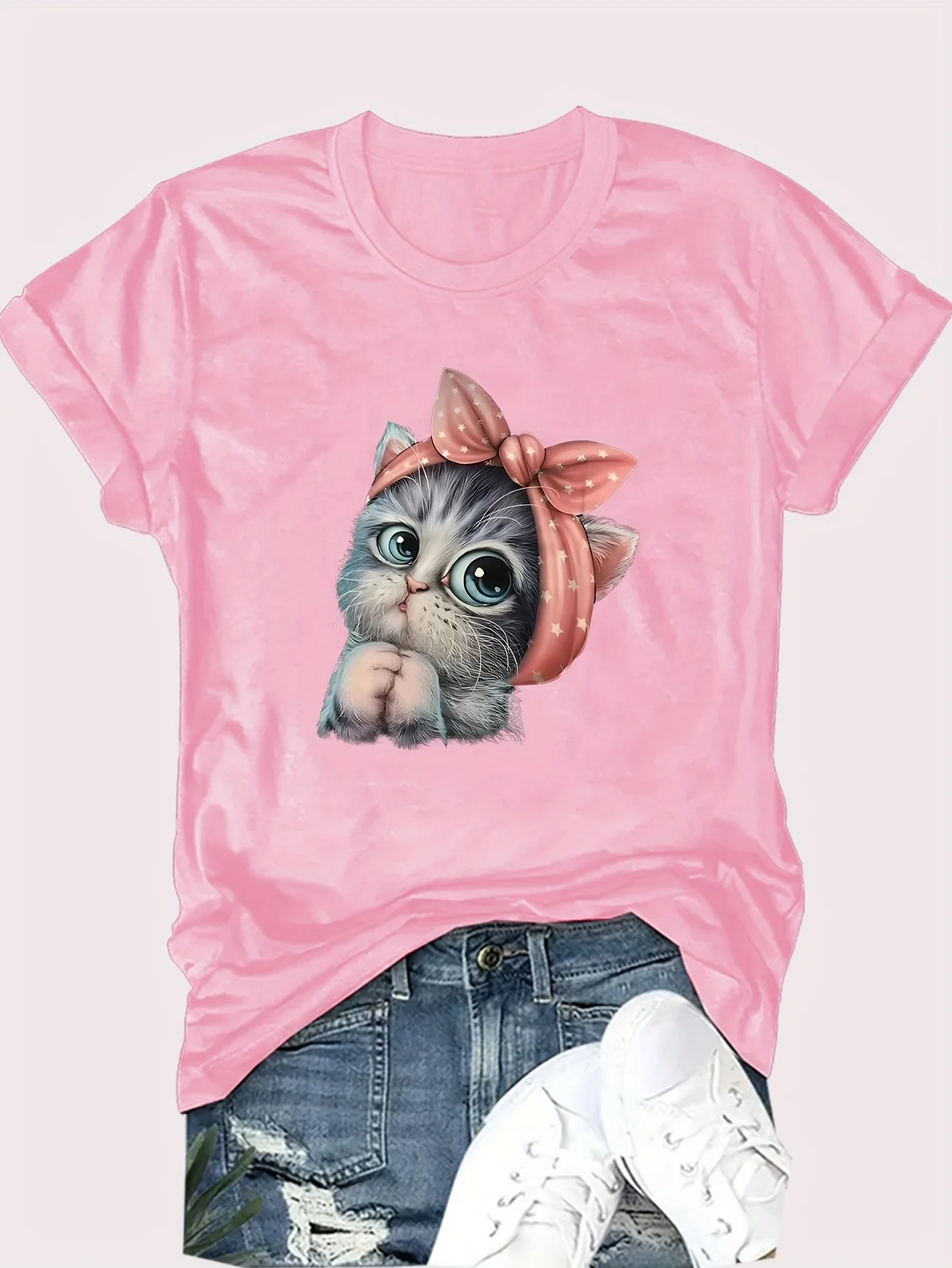 Cat Print Crew Neck T-Shirt, Casual Short Sleeve T-Shirt For Spring & Summer, Women's Clothing