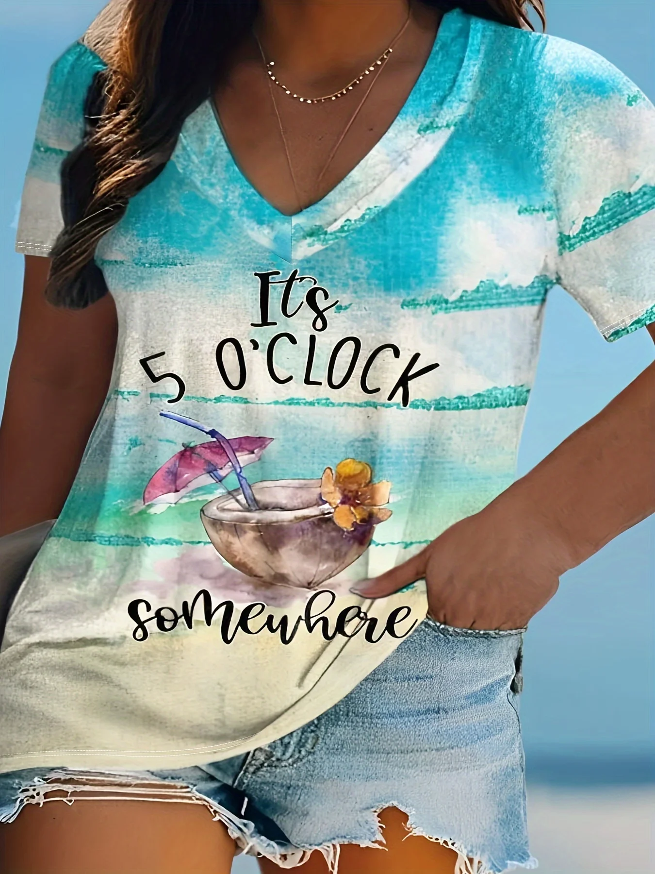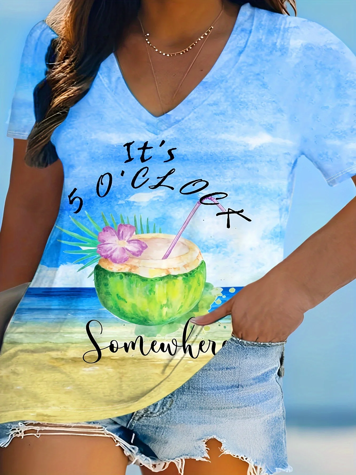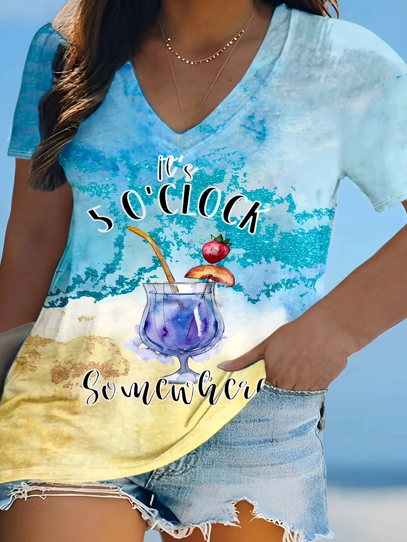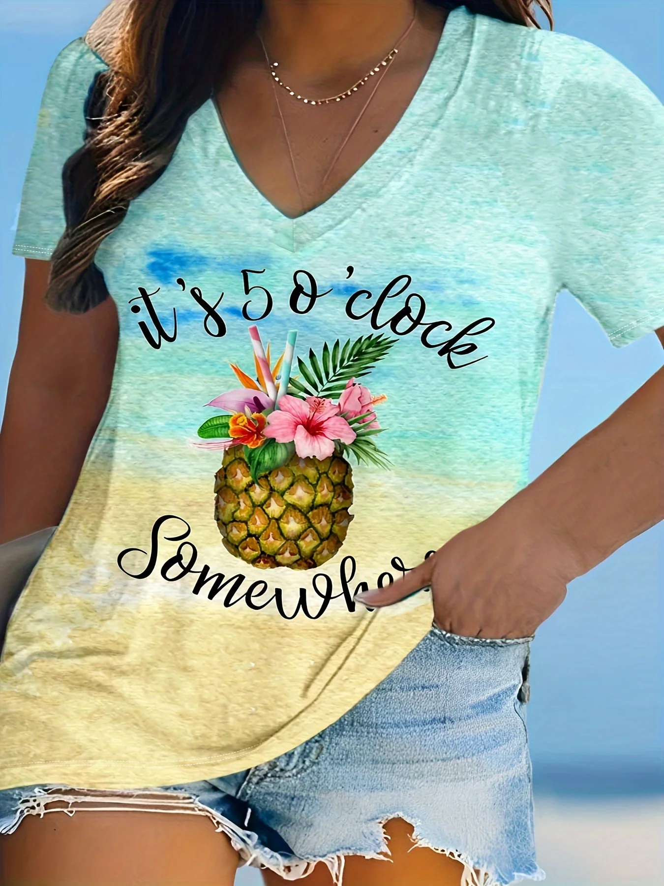 New Letter 50 Clock Print T-shirt For Women Plus Size Top Summer Tees Women's Trend Clothing Short Sleeve Shirt V-Neck Blouse