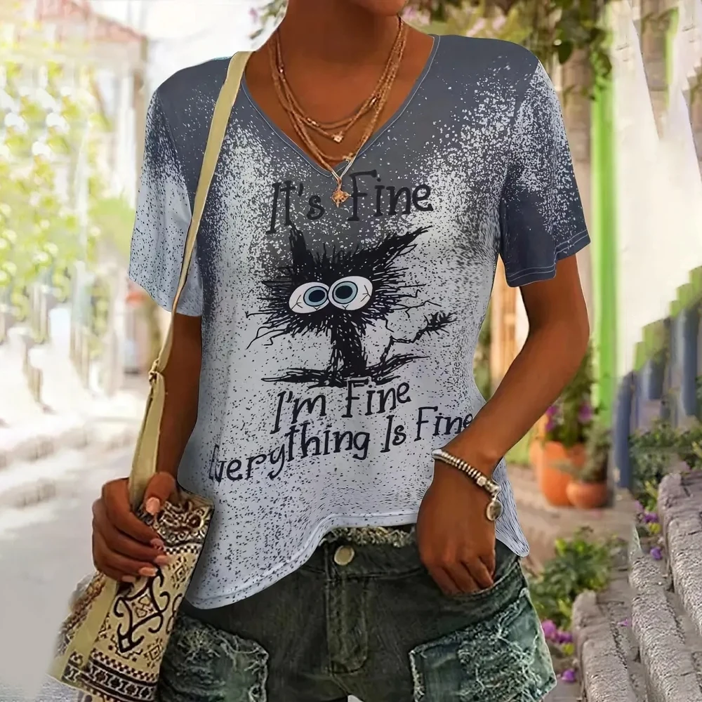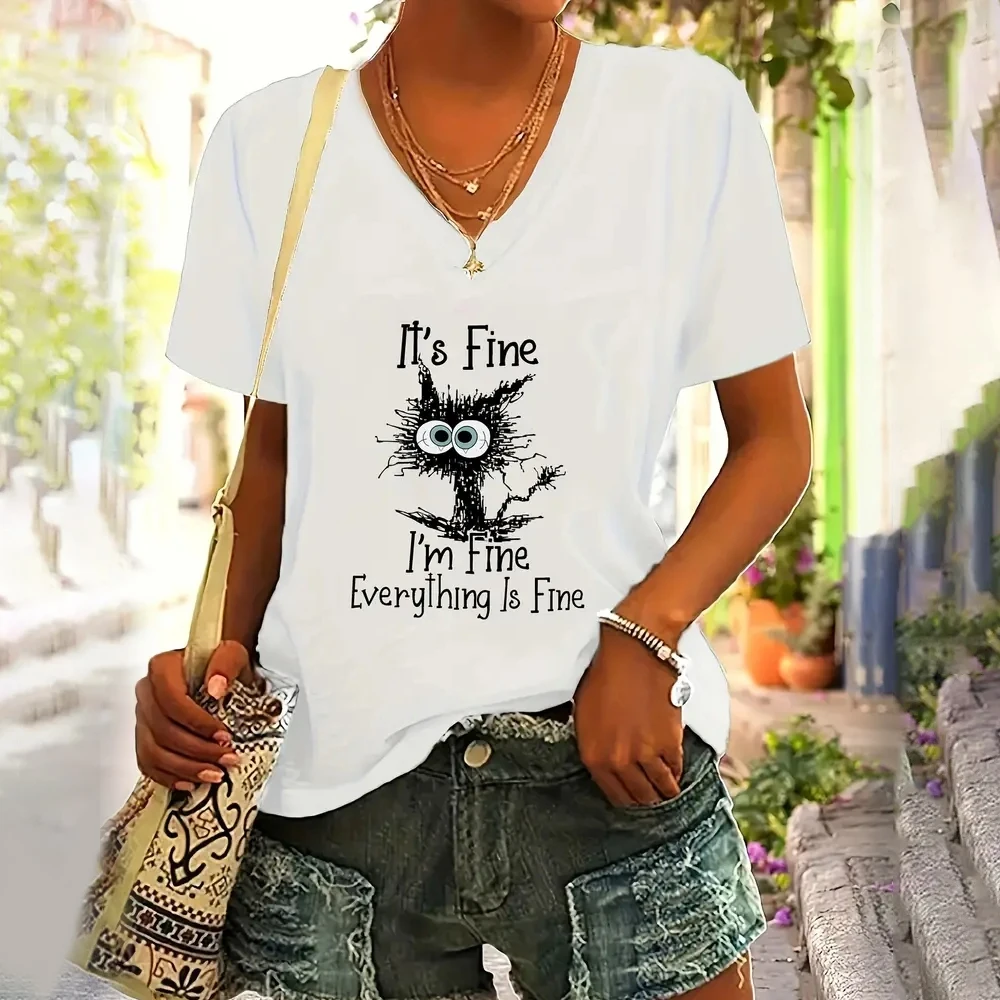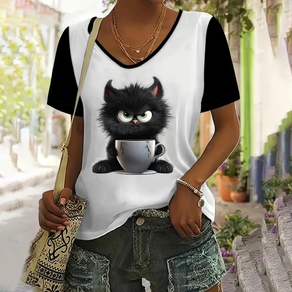2024 Women T shirt Summer Cartoon Cat Print Tshirt Plus Size Women's Clothing Oversized Designer Short Sleeve Shirt Women V-neck