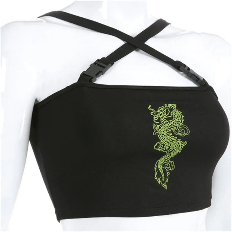 Fashion Women Sexy Hot Summer Buckle Vest Boob Tube Crop Top Bralet Sheer Dragon Embroidery Stylish Cami Tank Top