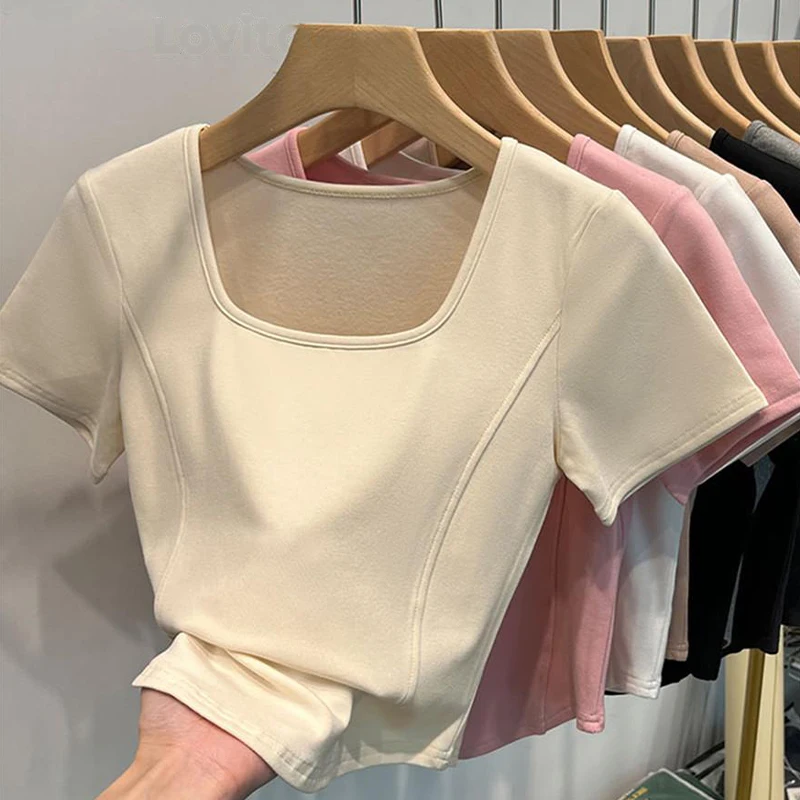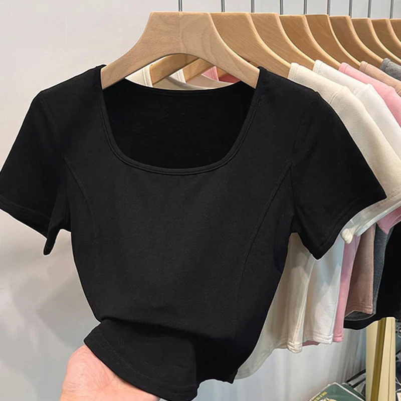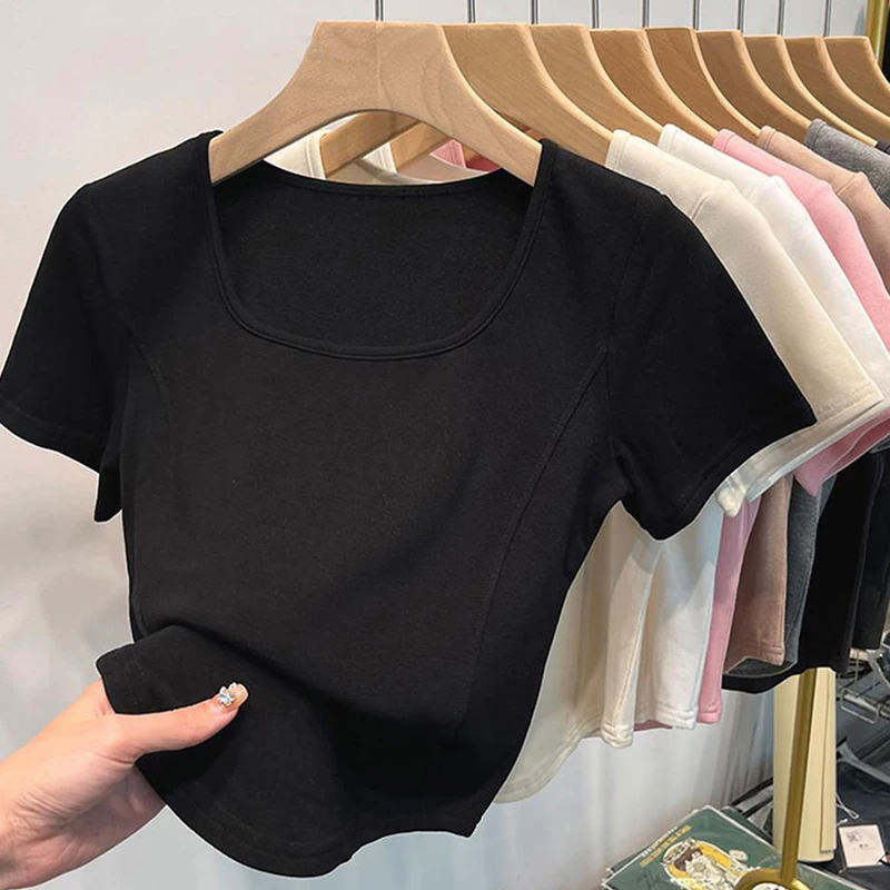 Summer Korean Square Neck Short Sleeve Irregular T-shirt Women Solid Color Slim Crop Top