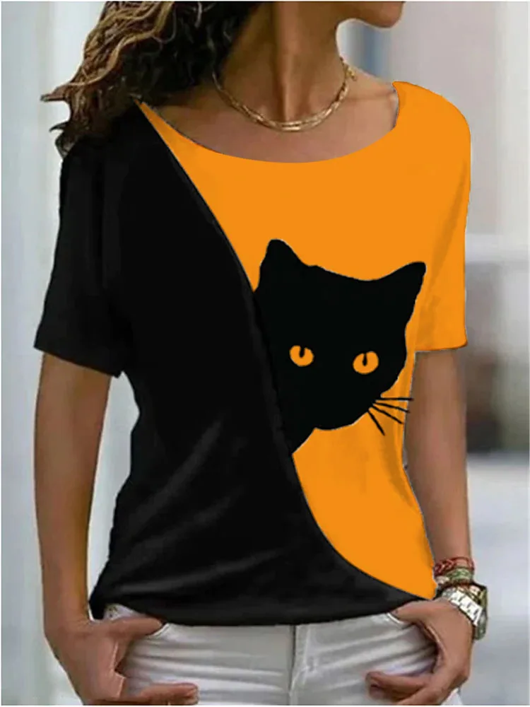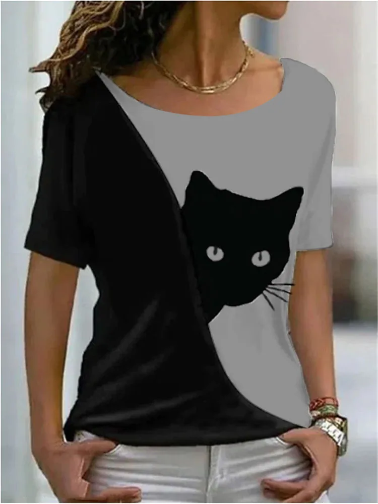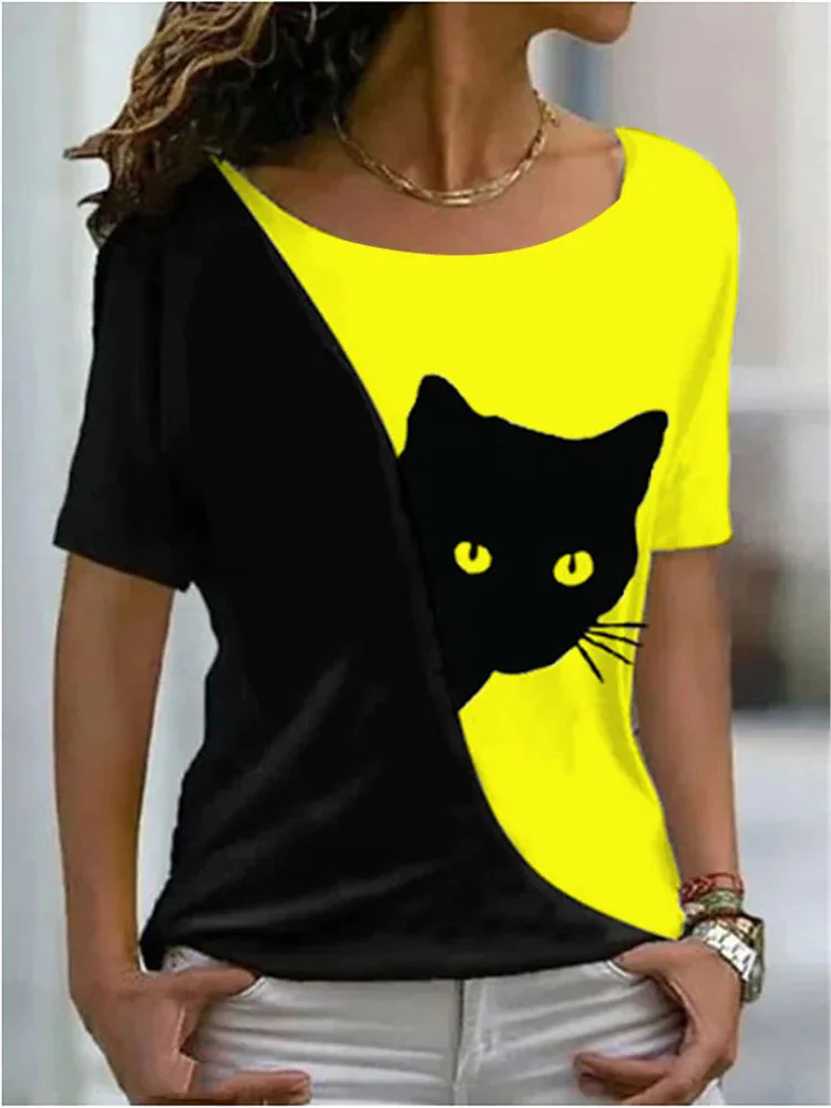 2024 Summer Women's Cat Theme Printed Painting Tee Shirts O-Neck Casual Female Tops Daily Pullover New T Shirt Design Streetwear