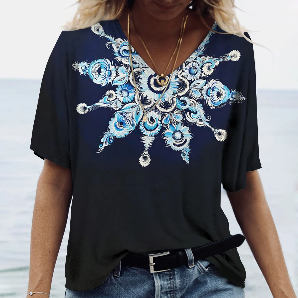 Mandala Gradient Printed Women's T-shirt 2023 New Fashion Short Sleeve Shirt Female Oversized Harajuku Clothes V Neck Loose Tees
