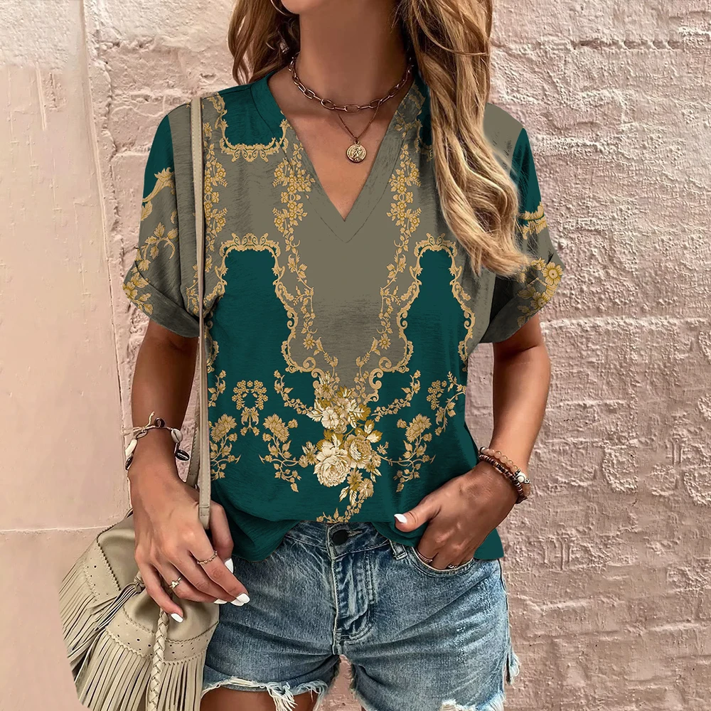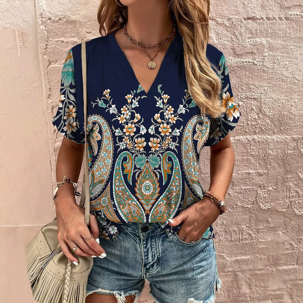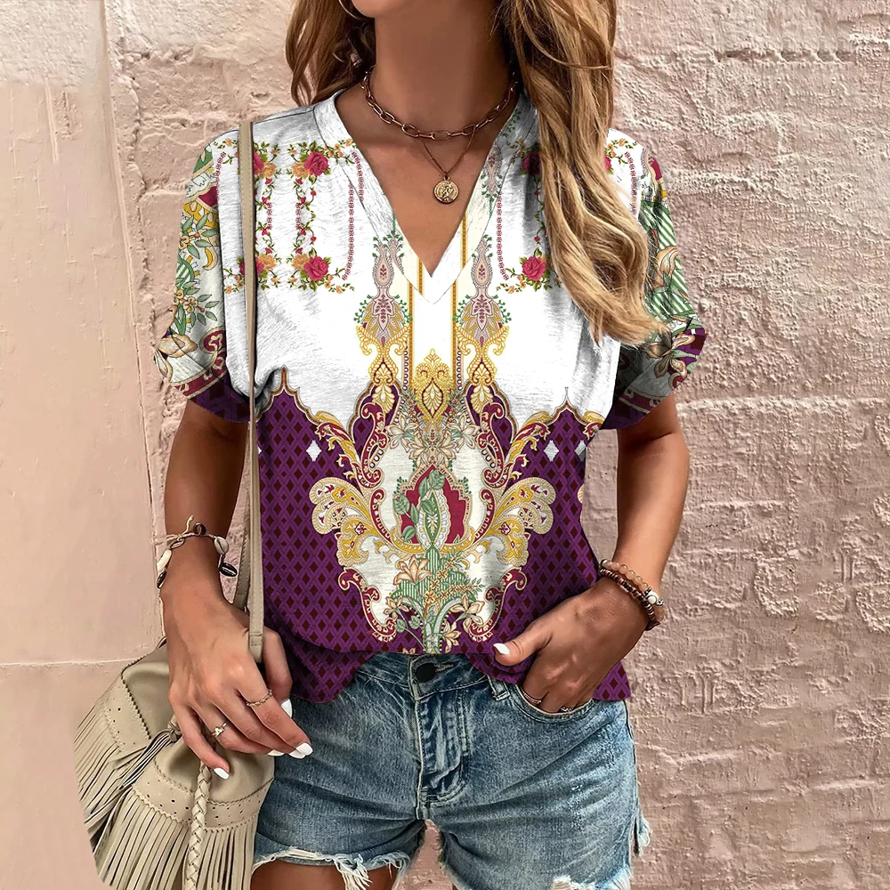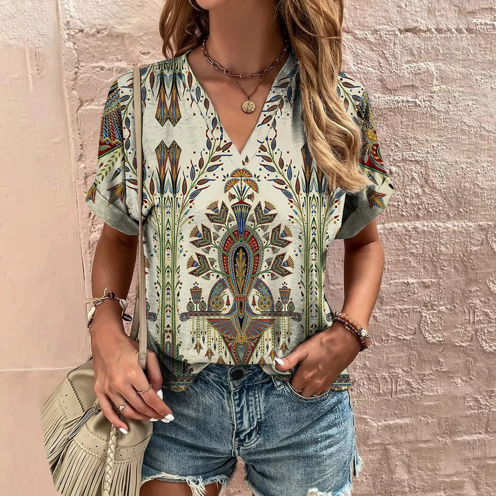 New Women's T-Shirt Summer V-Neck Clothes Ethnic Short Sleeve Top Casual Harajuku Streetwear T Shirt for Women Pullover Hip Hop