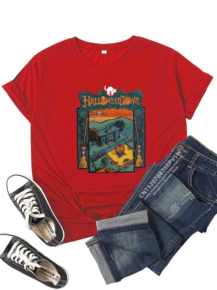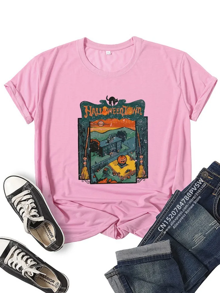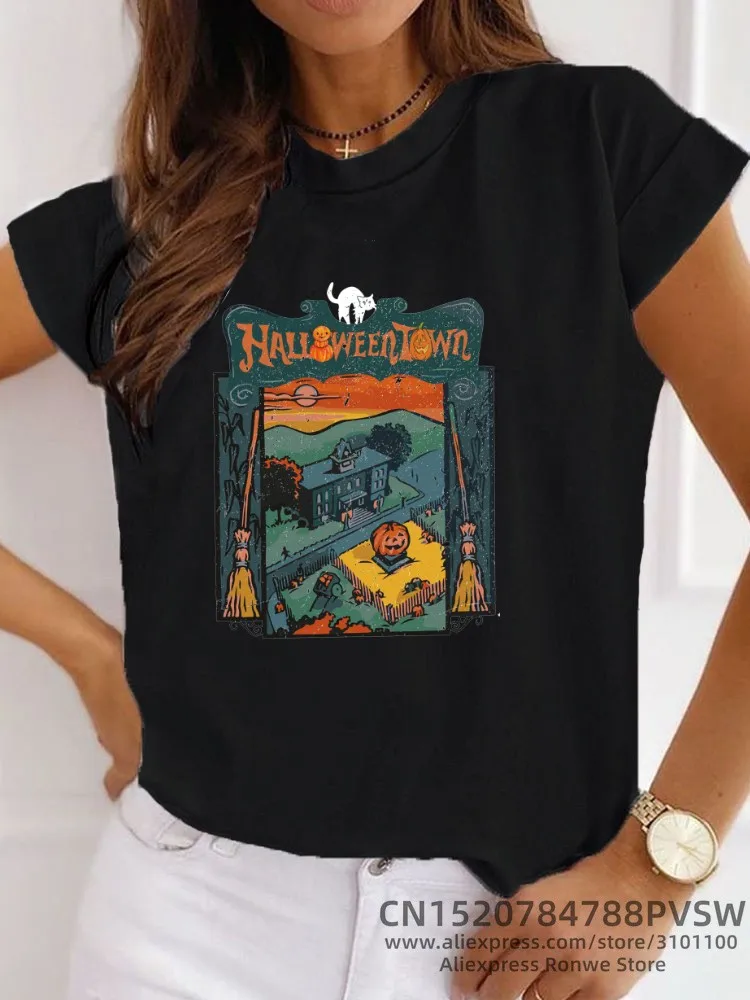 Halloween Town Storybook Vintage Pumpkin Women Graphic T-shirt Daily Girl Y2K Harajuku Tee Tops Female Sreewear Clothes