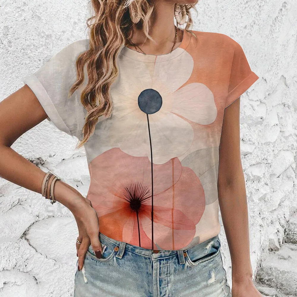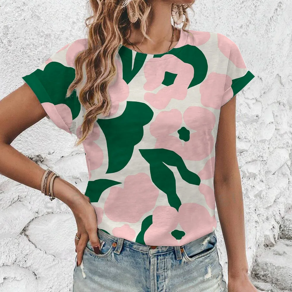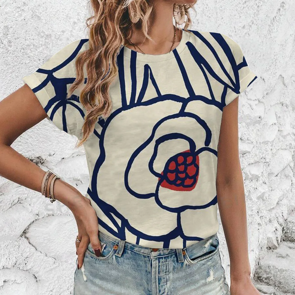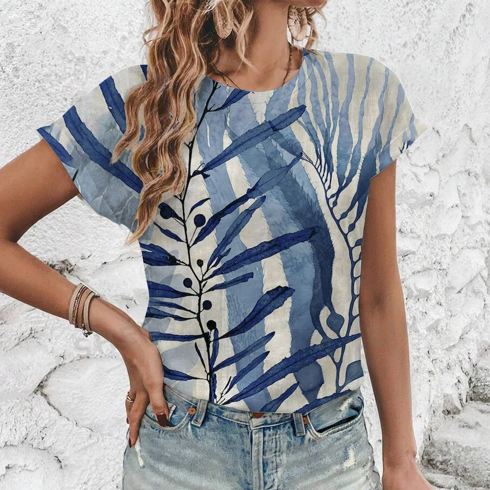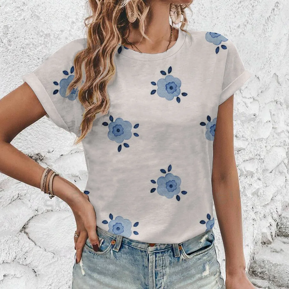 2024 Women's Short sleeved T-shirt Fashion small floral blue print retro fashion casual summer new designer style