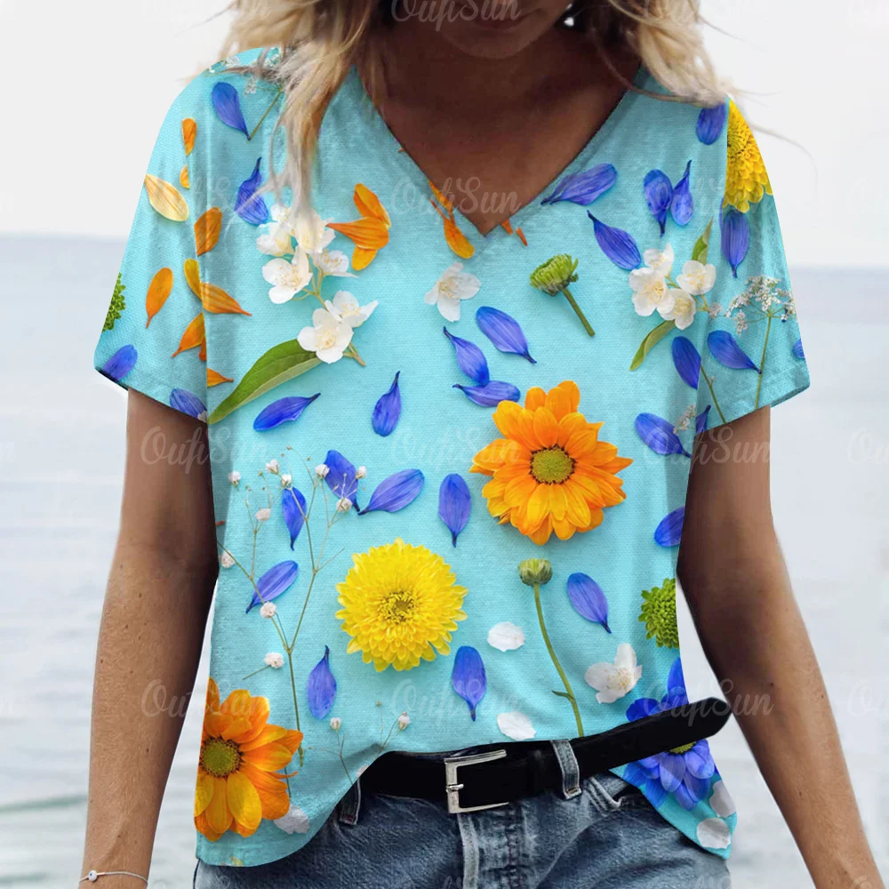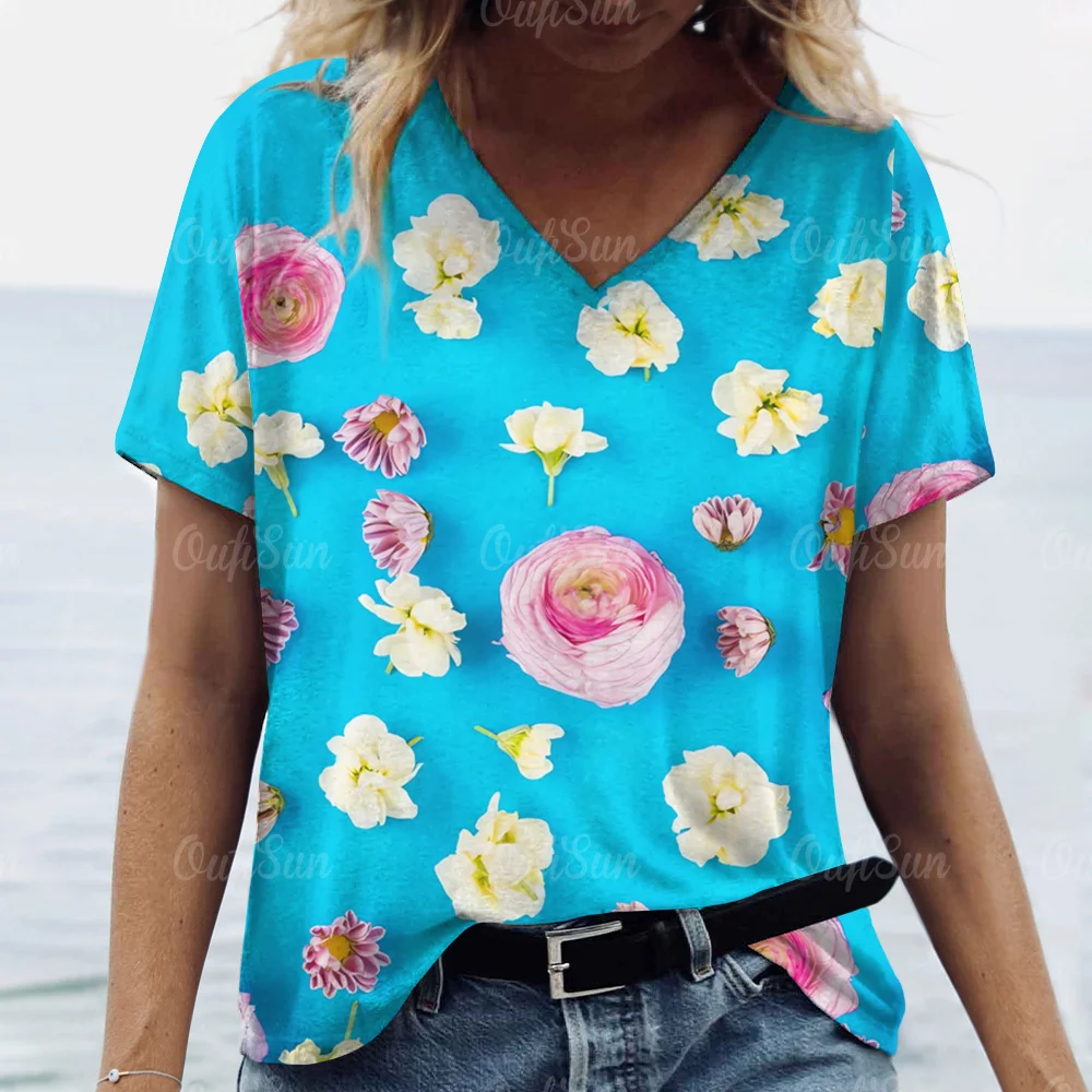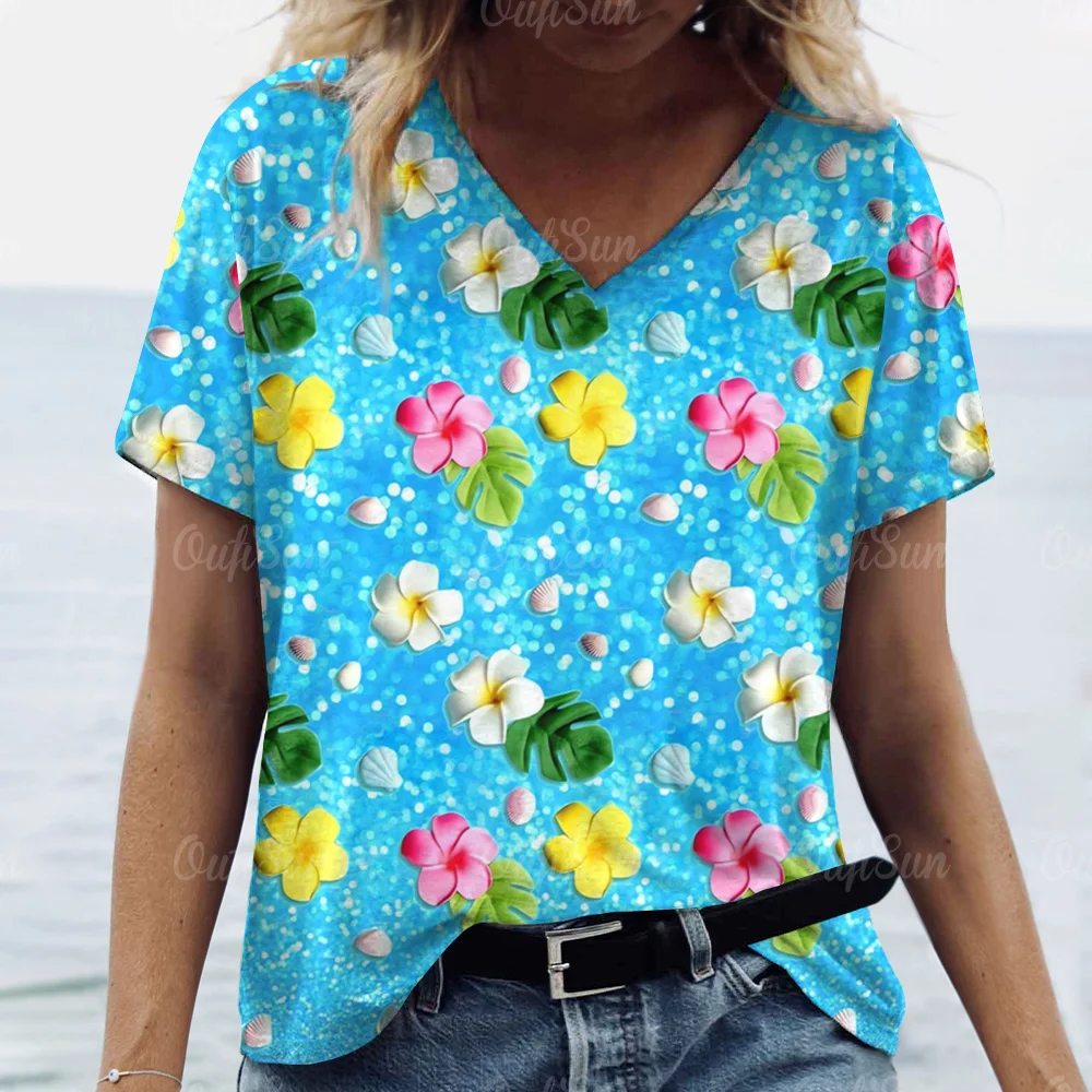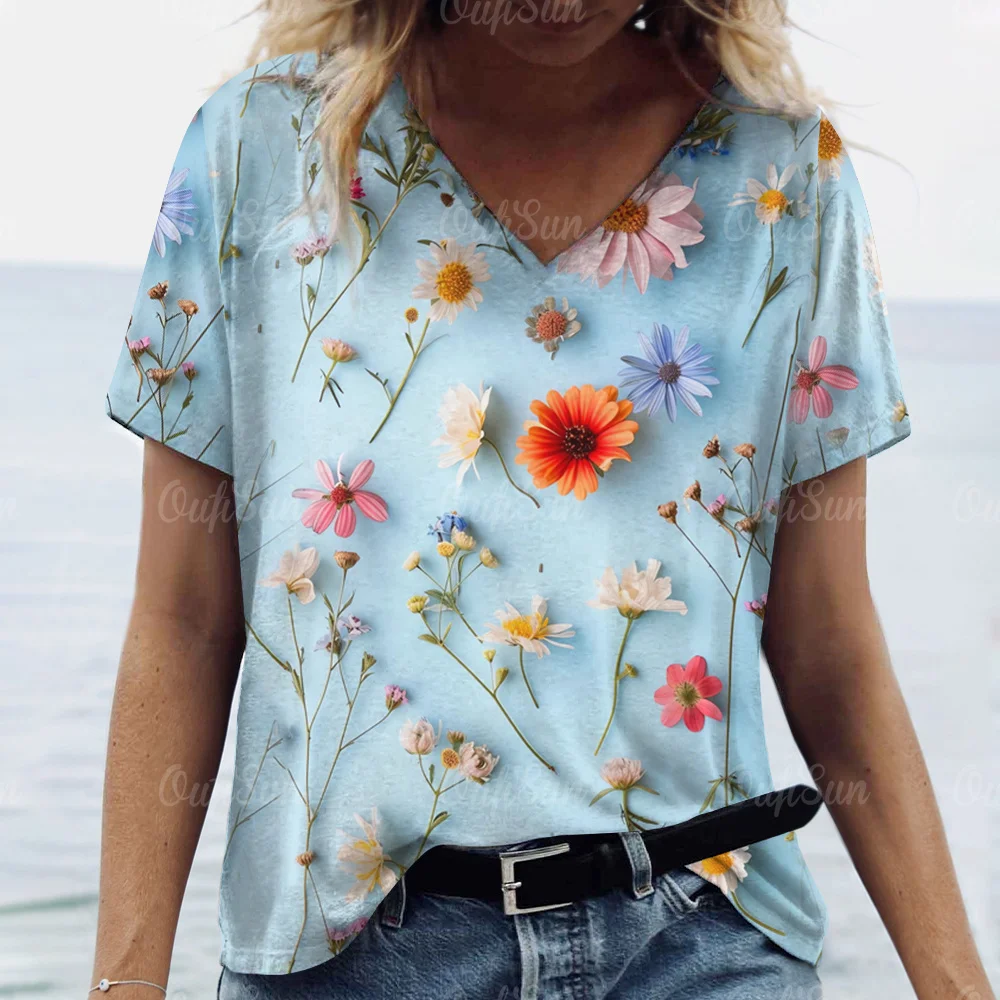 2024 Top Women Blue Floral Printed Women's T-Shirt Oversized T-Shirt Popular Clothes Women Clothing Short Sleeve Tees Blouse 5XL