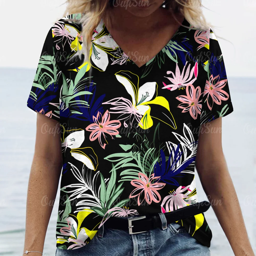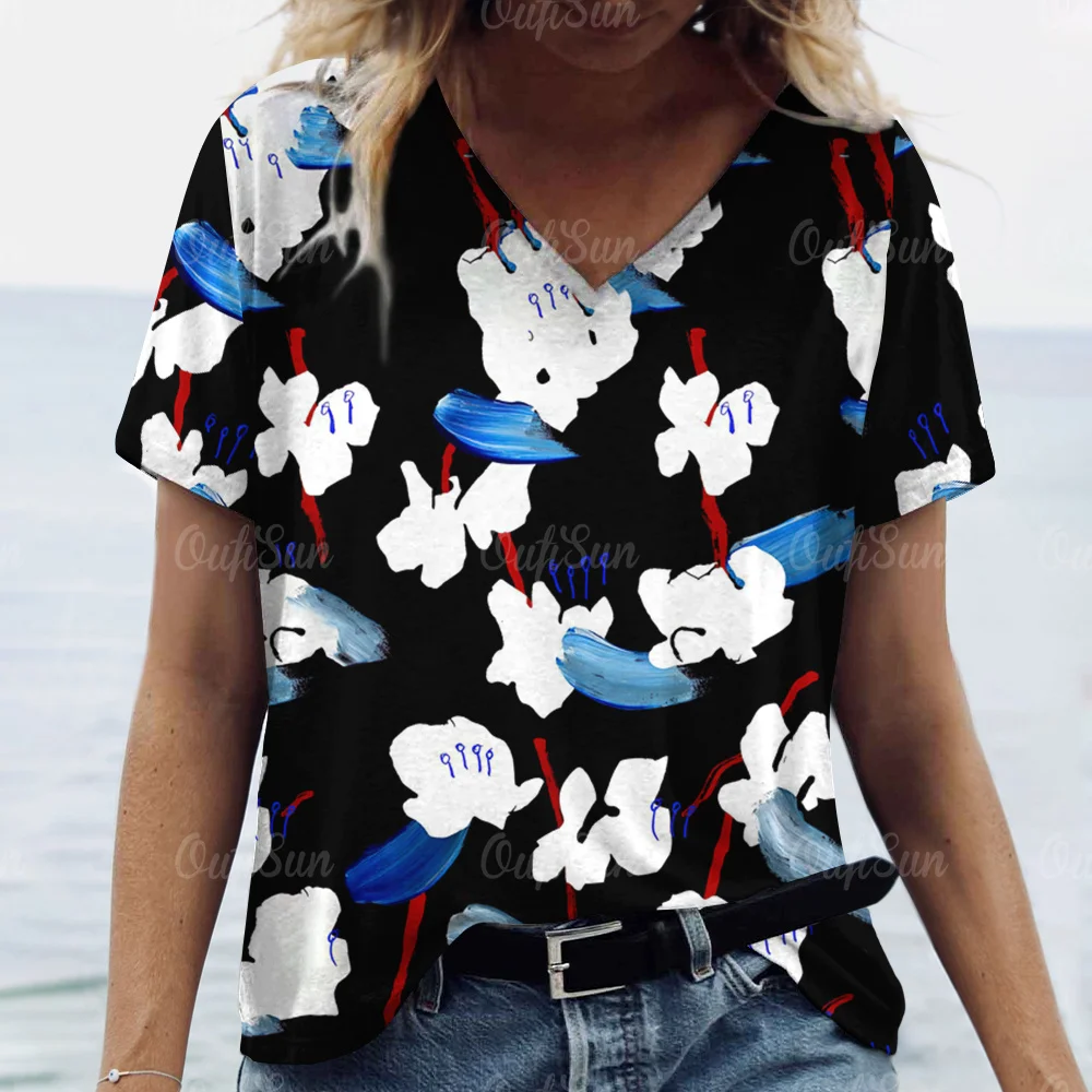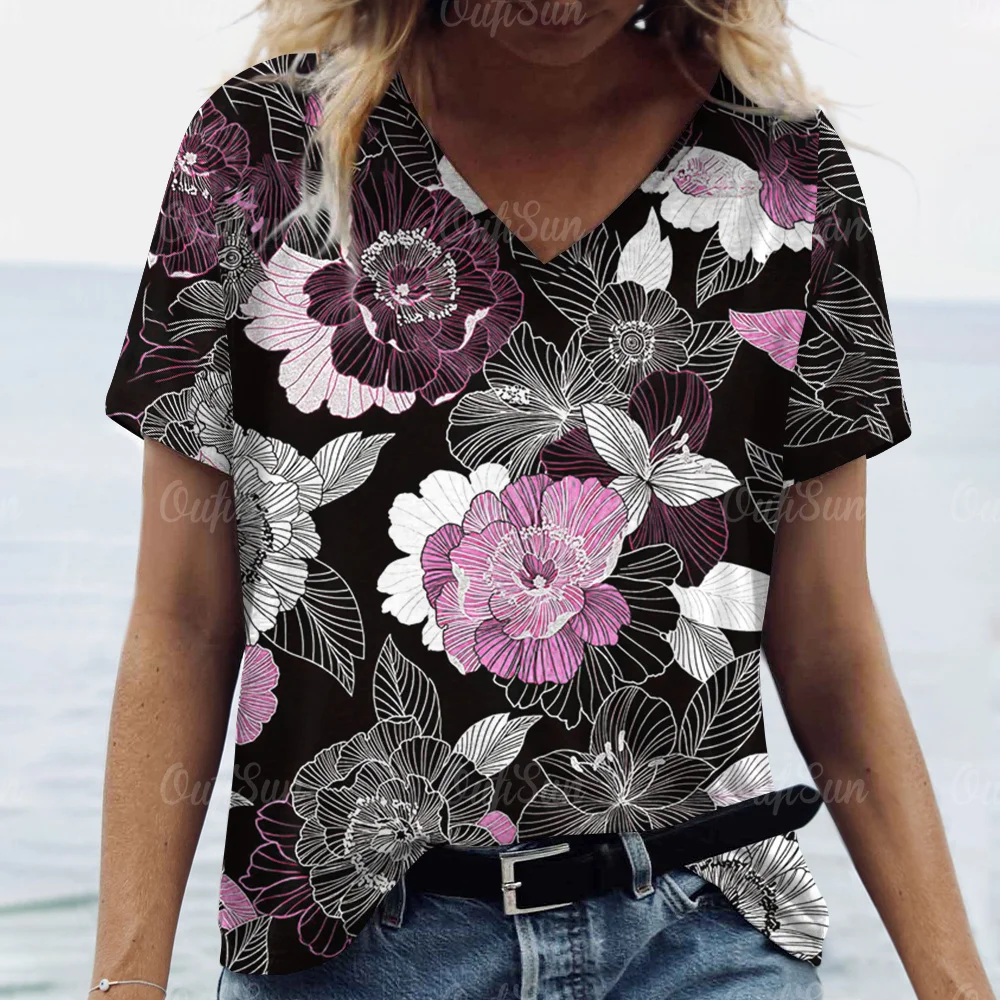 2024 T-Shirt For Women Floral Printed Tops Women's Oversized Clothes Tees Summer V-Neck Tops Shirt Original Design T-Shirts