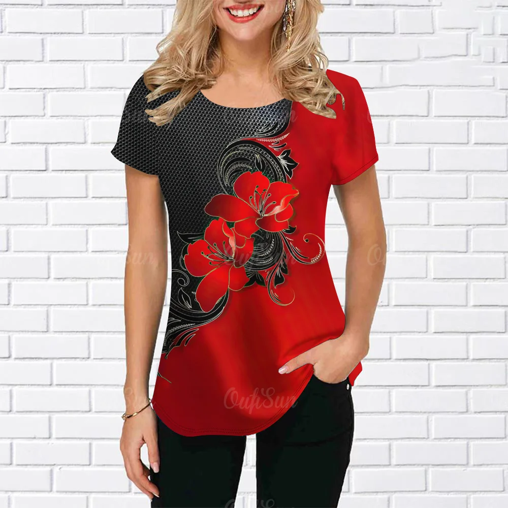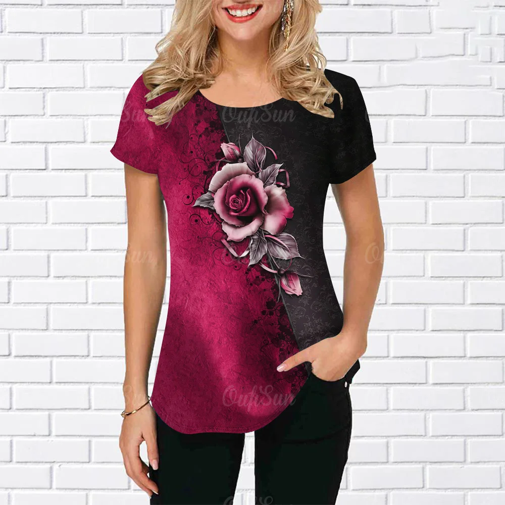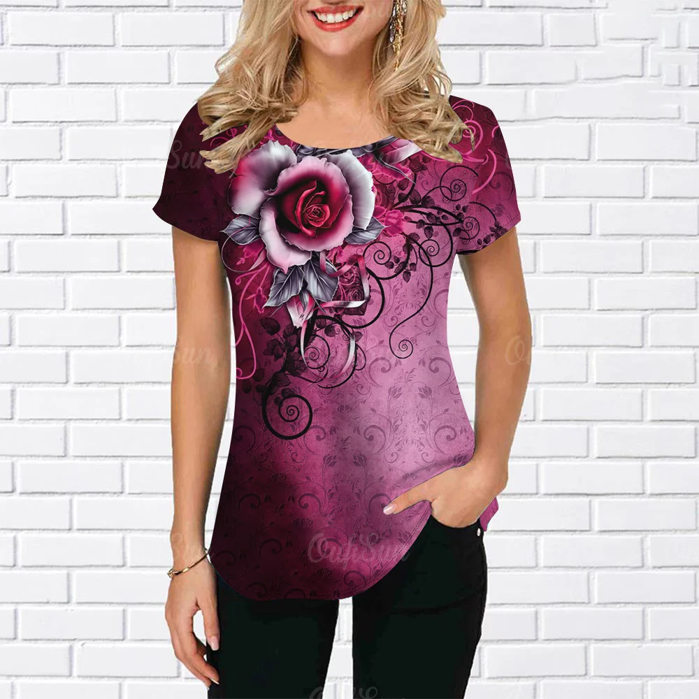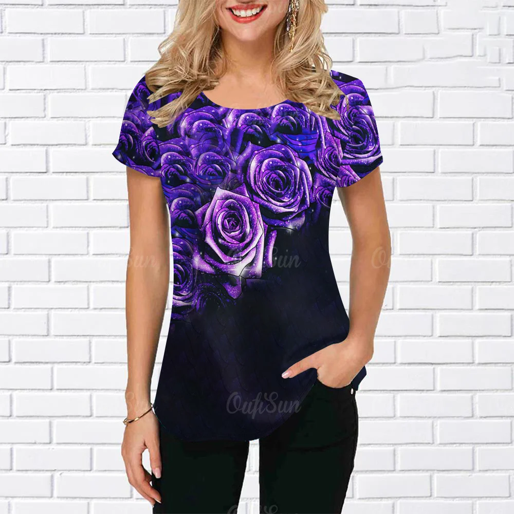 Floral Print Women's T-shirt Purple Clothing For Ladies Fashion Casual Short Sleeve Tees Female Oversized Sweatshirt O Neck Tops