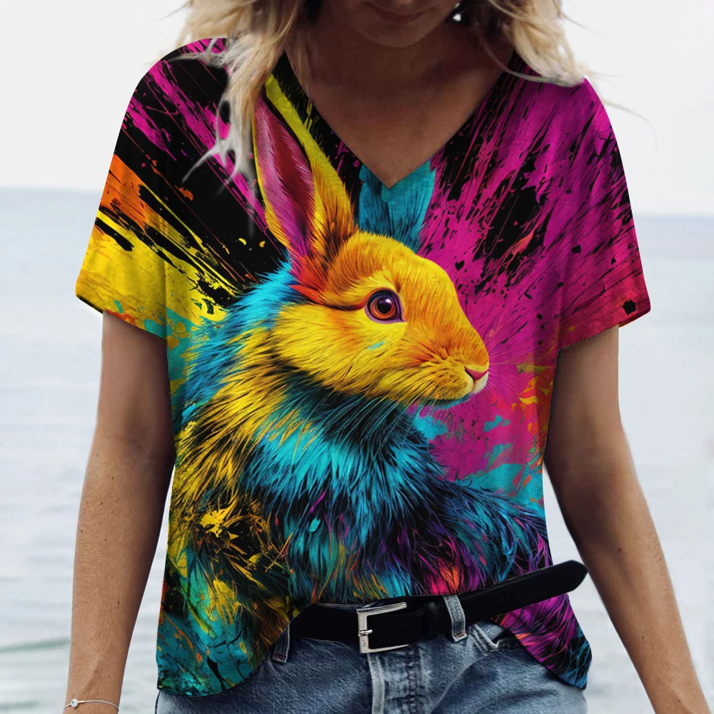 Women's T-Shirt Summer Colorful Cat Print Female Clothing V-Neck Short Sleeve Animal Graphic Tops Streetwear Oversized Tops