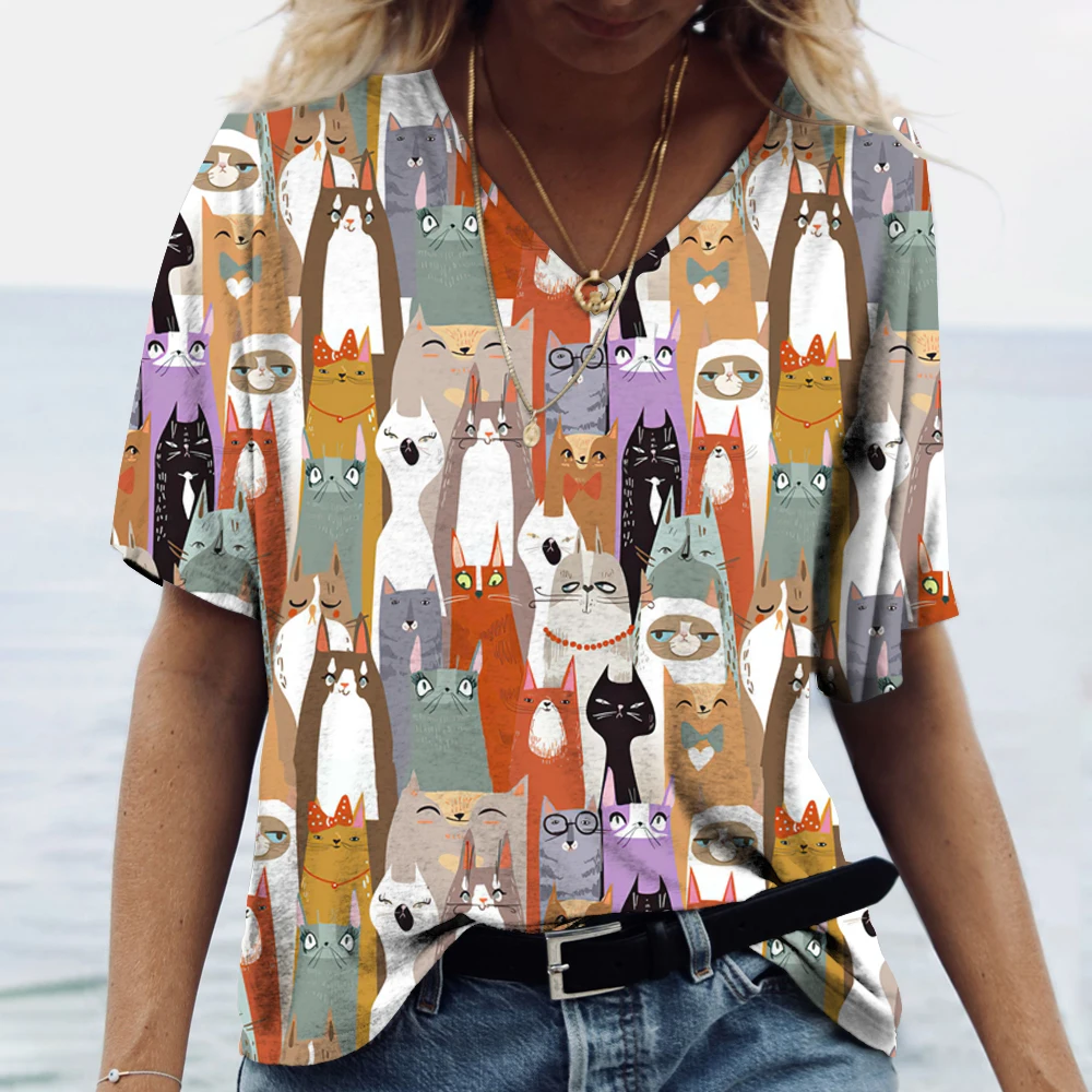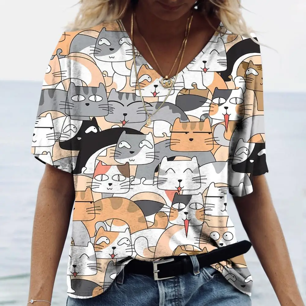 Cartoon Kitten Women's T Shirt Harajuku Clothing Summer V-neck Girls Pullover Cotton Short Sleeve Tees Female Casual Streetwear