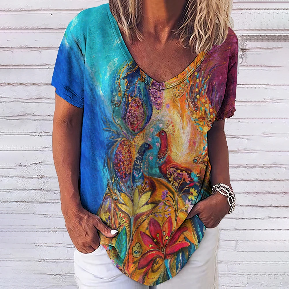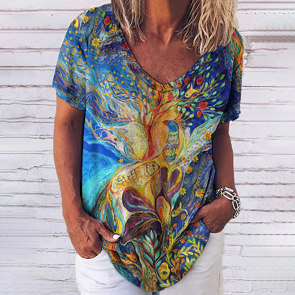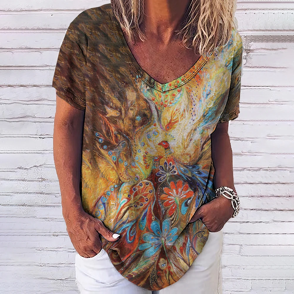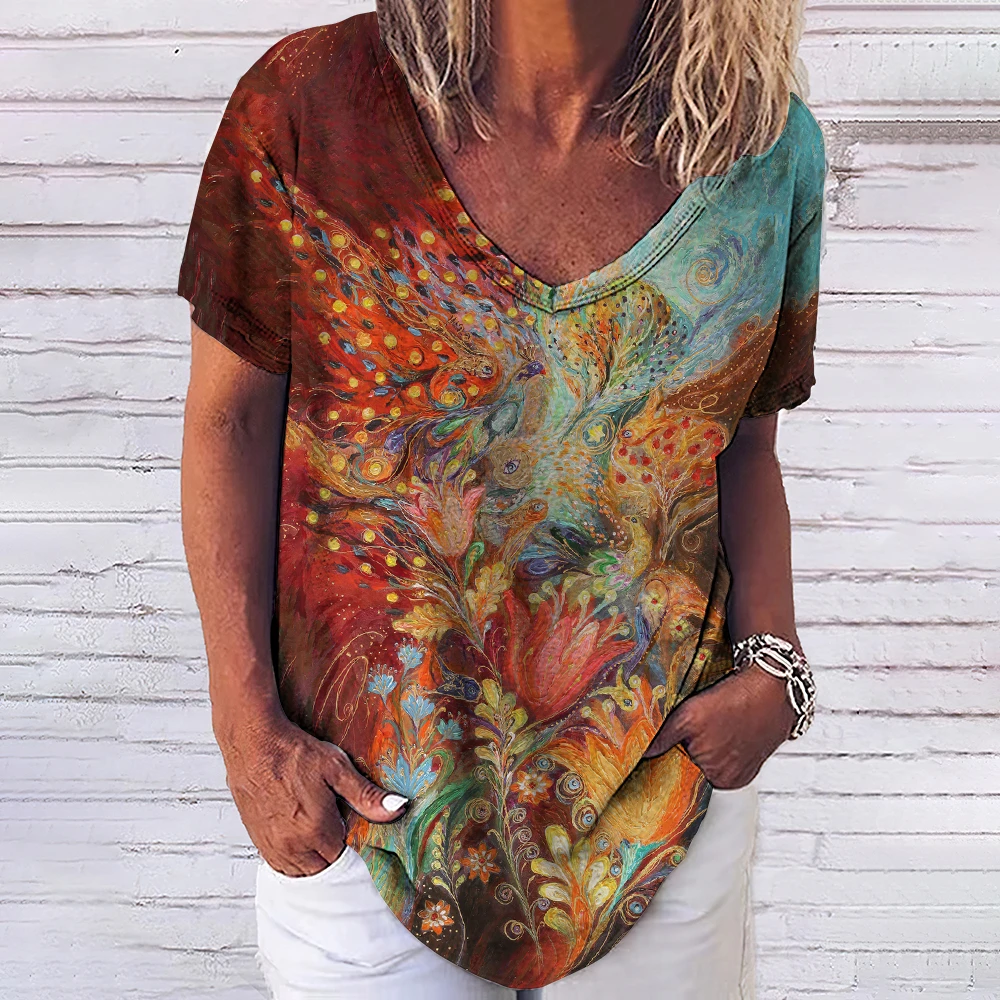 3D Phoenix Print Women's T-shirt Summer V-neck Short Sleeve Tees Female Fashion Ladies Clothes Cool Streetwear Harajuku Pullover