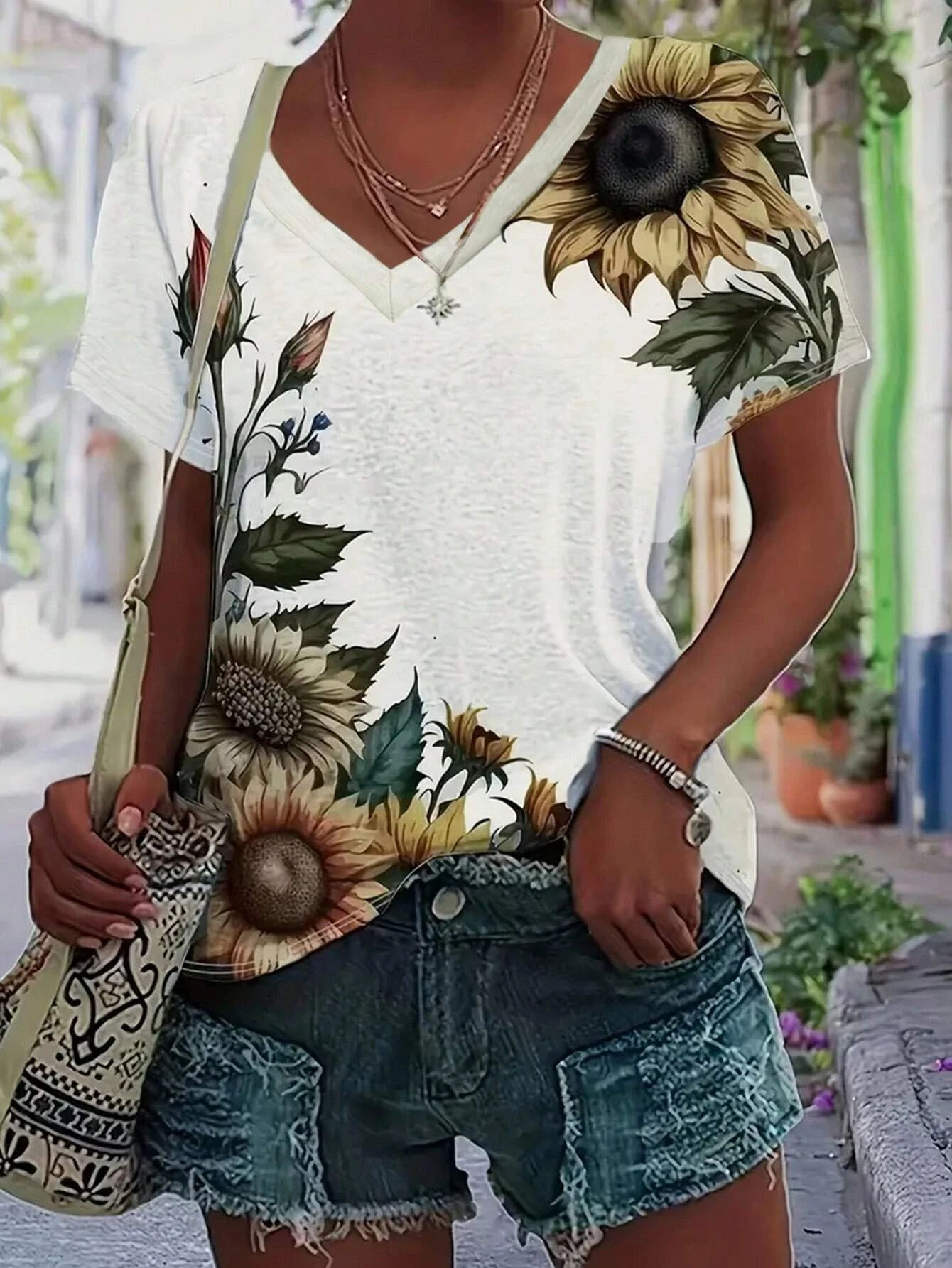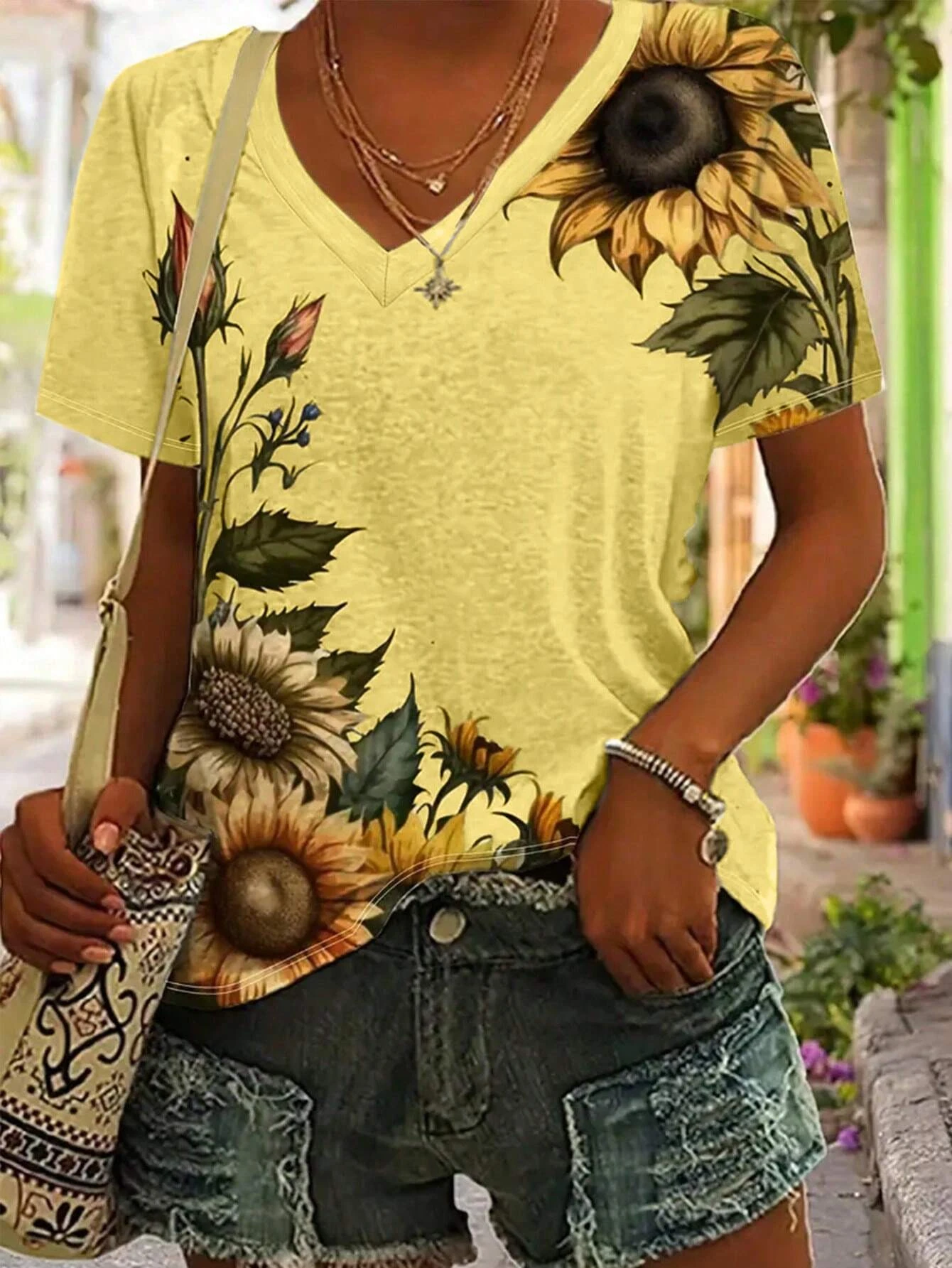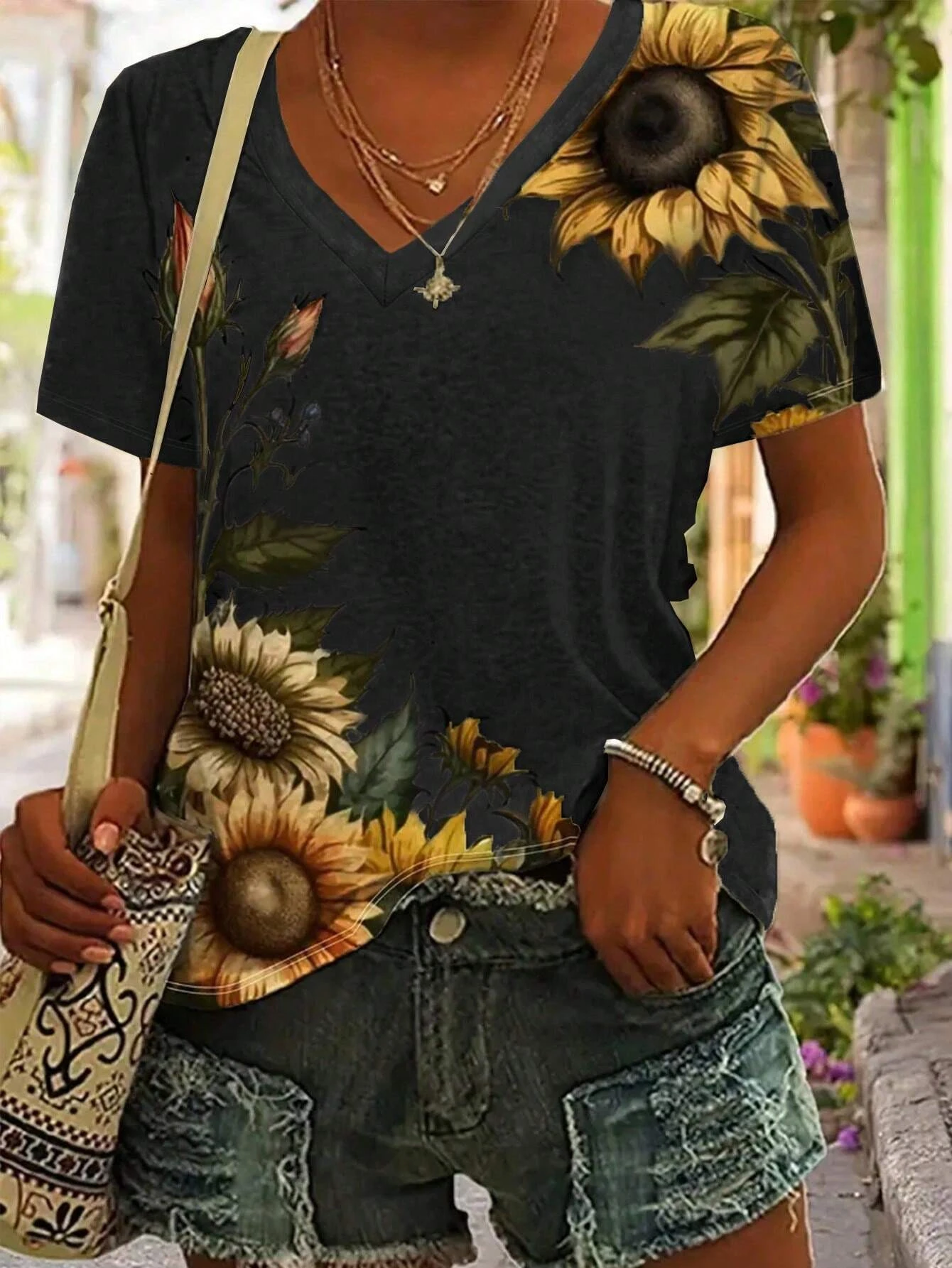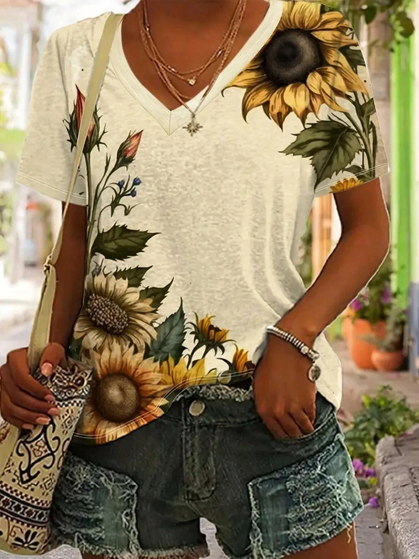 Fashion V-neck Women's T-shirt Summer Outdoor Trend 3D Sunflower Print Short Top New Casual Loose Plus Size Women's T-shirt