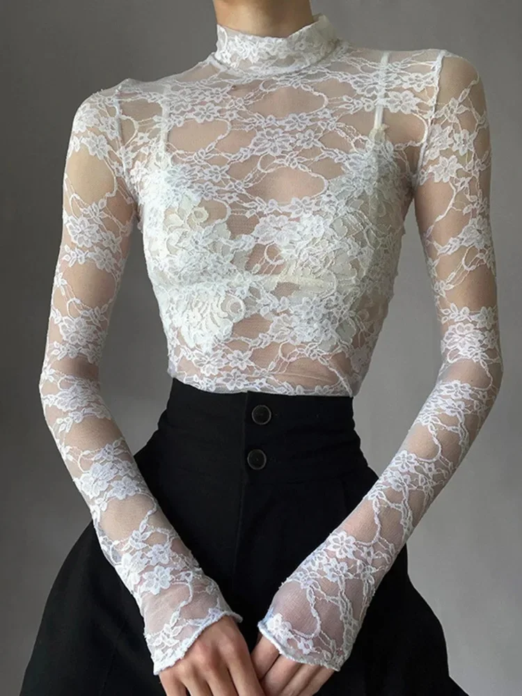 y2k White Lace Crop Top Turtleneck Full Sleeev See Through T Shirt Women Vintage Fairycore French Tee Smock Tops Chic