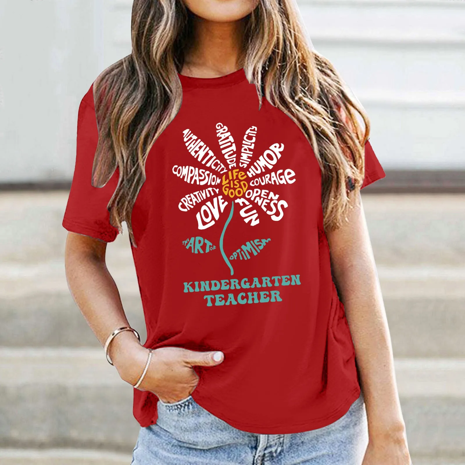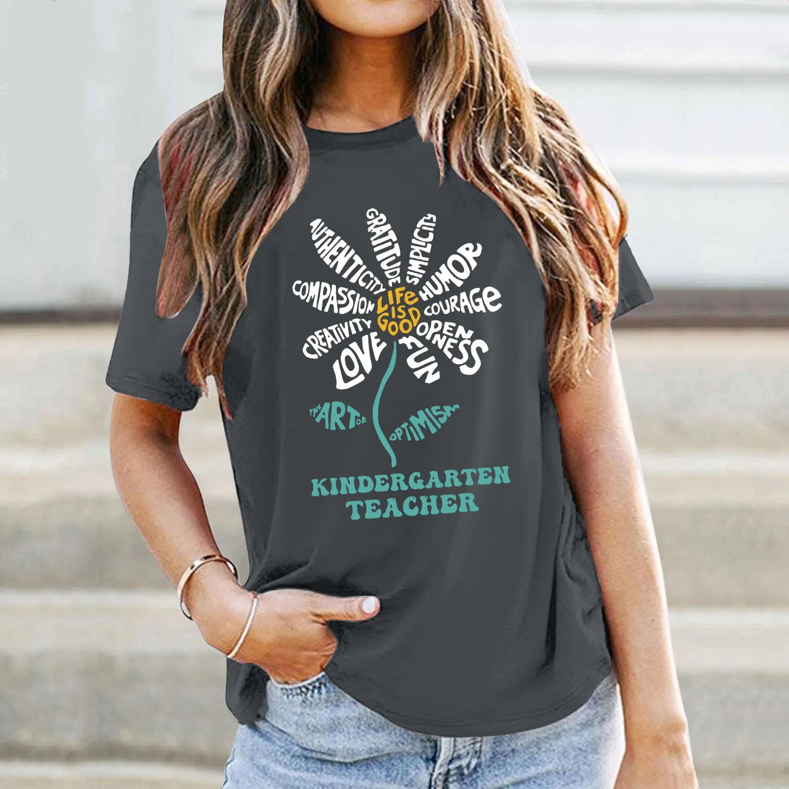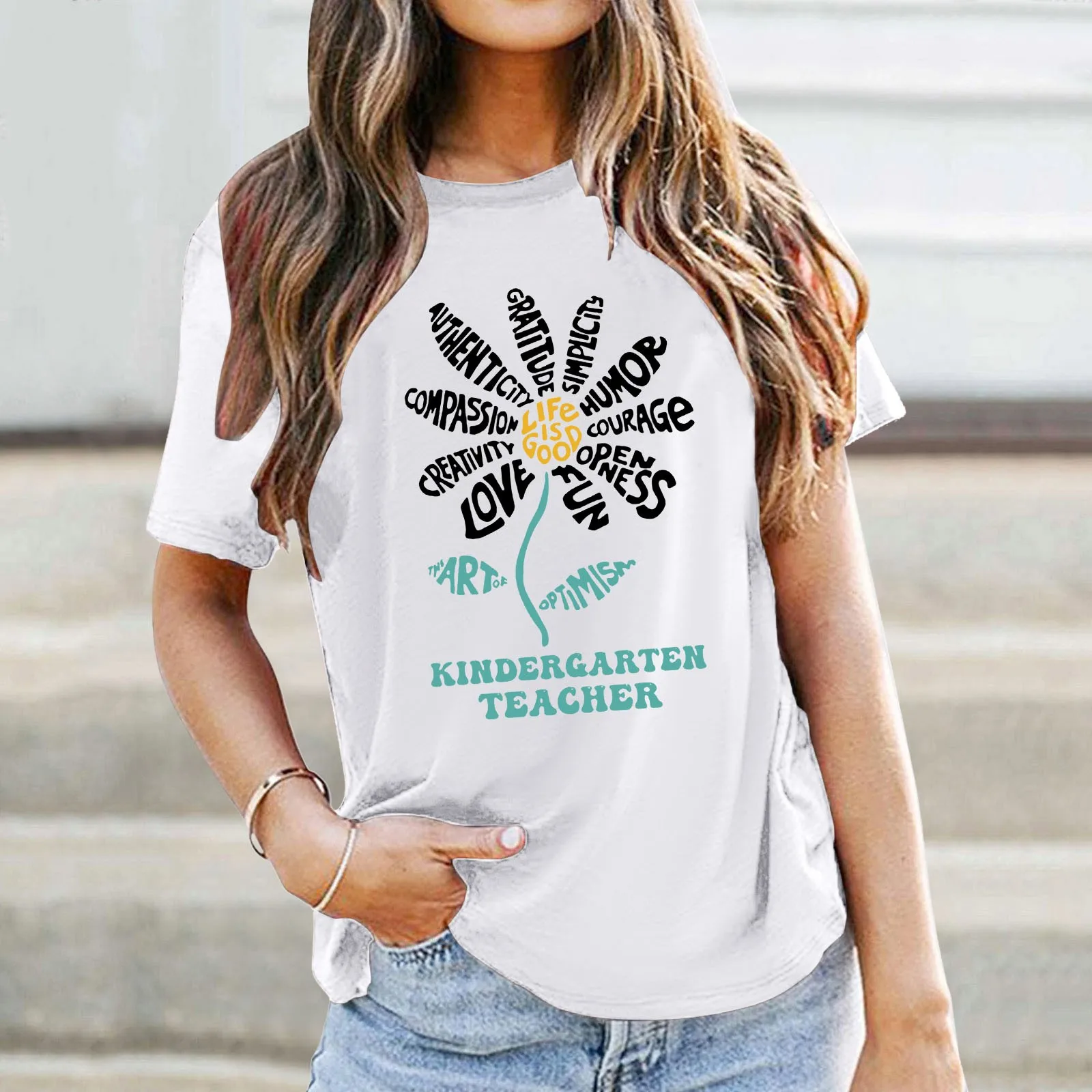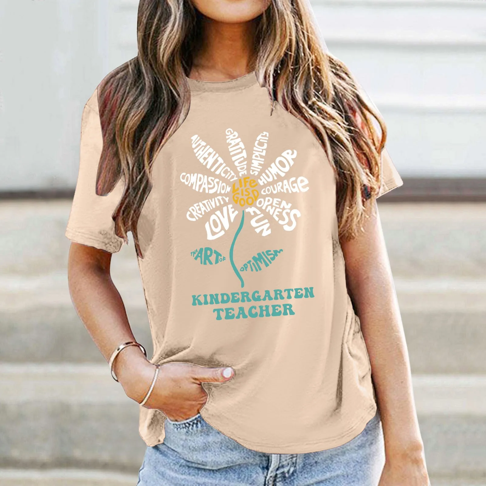School Season Teacher's Day Women's Casual Versatile KINDERGARTEN Flower Letter Printed Solid Color Round Neck Summer T Shirt