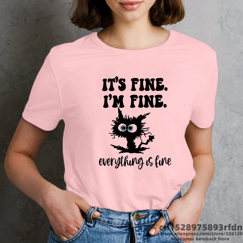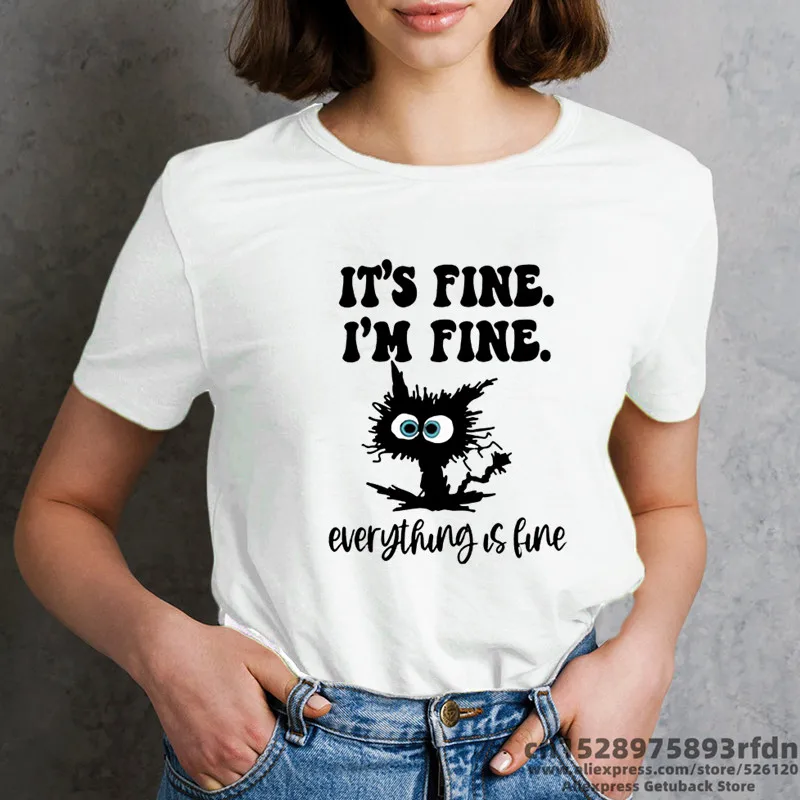 Women's Fashion Cat It's Fine I'm Fine Everything Is Fine Print T-shirt Summer Casual Loose O-Neck Creative Personalized T-shirt