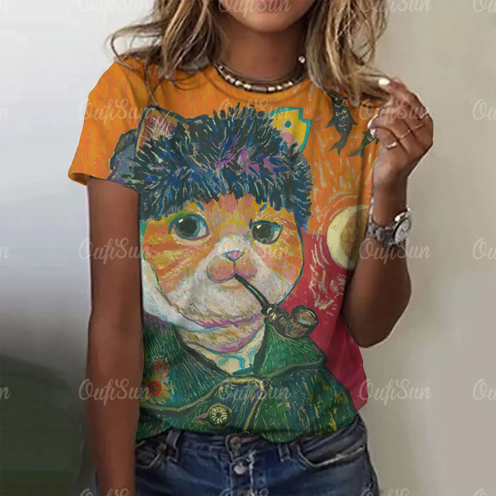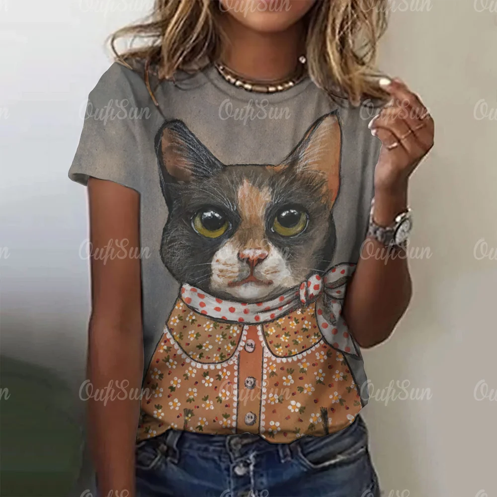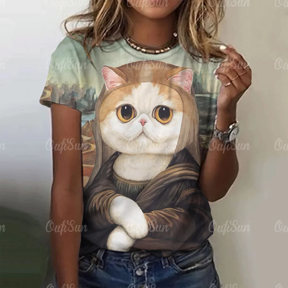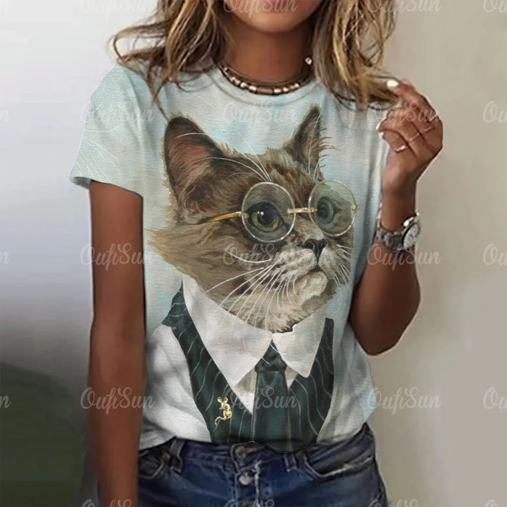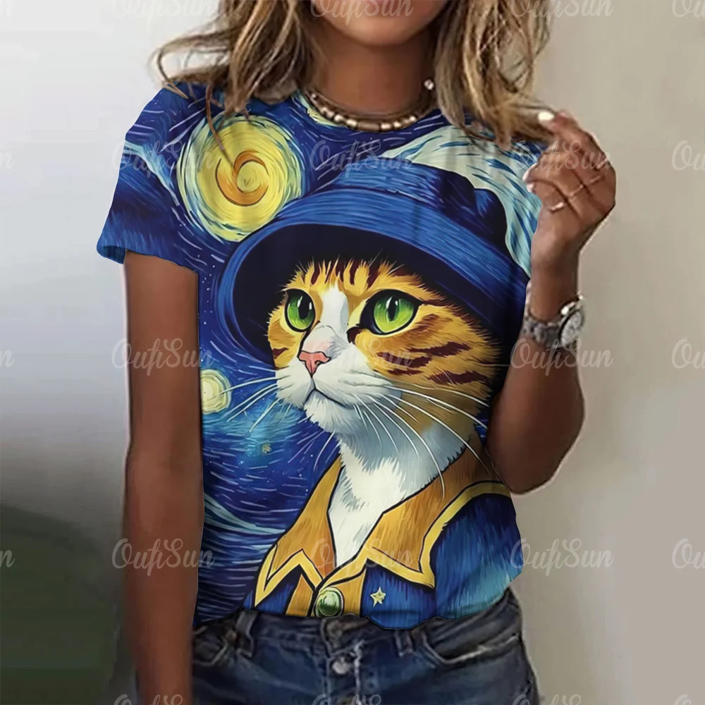 Cartoon Cat Print T-shirt For Women Harajuku Ladies Clothing O-neck Hand-painted Pullover Tops Loose Summer Short Sleeve Tees
