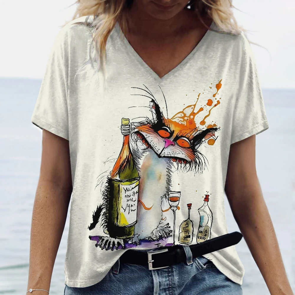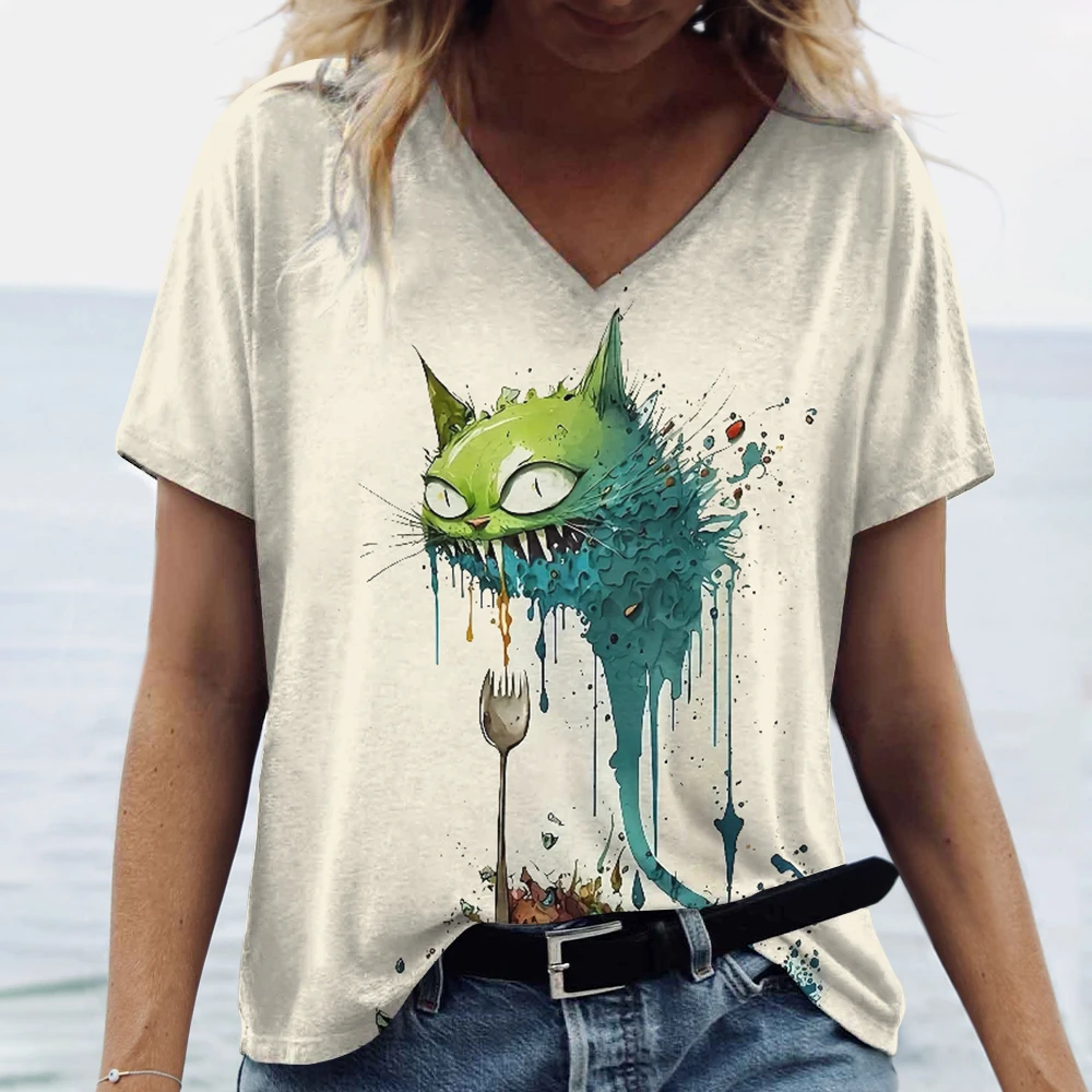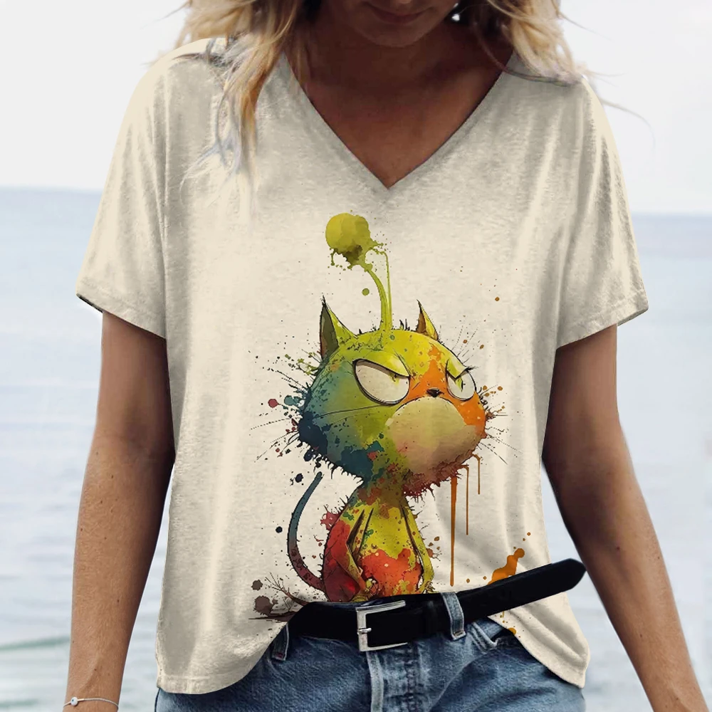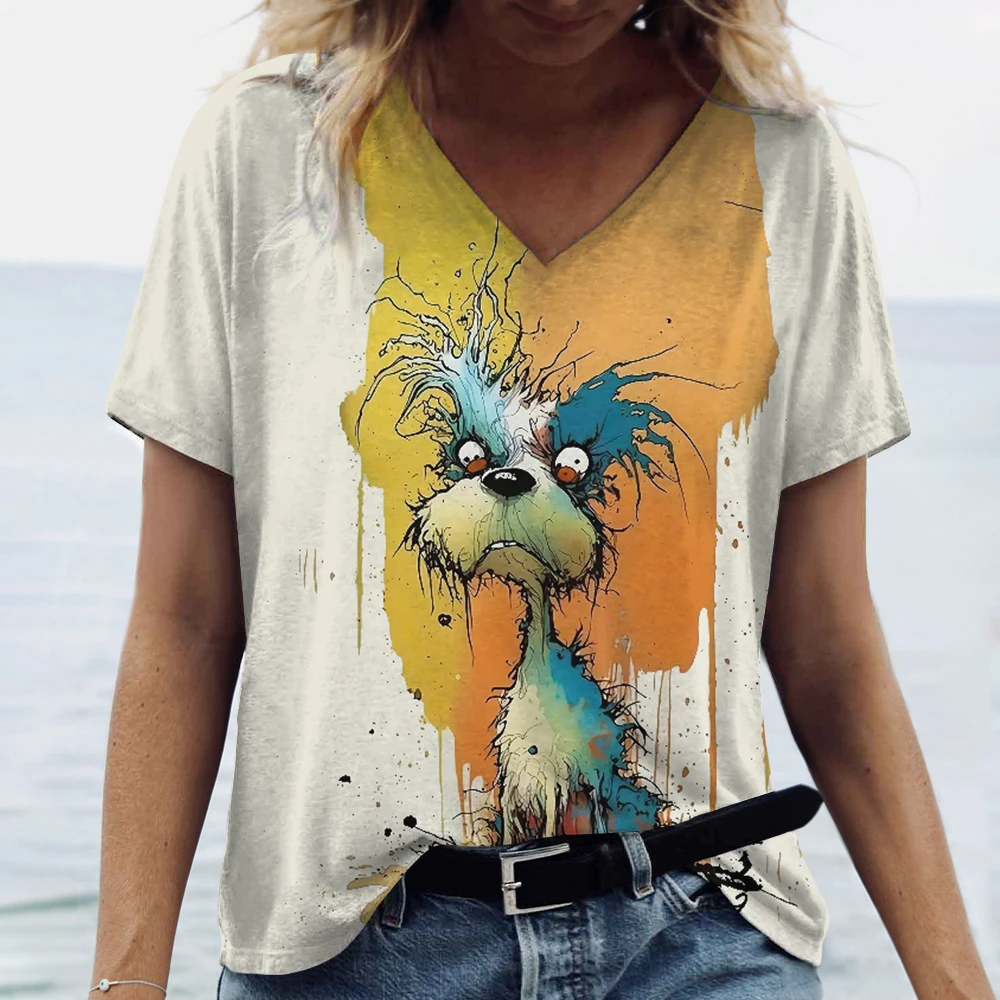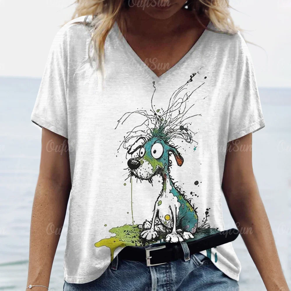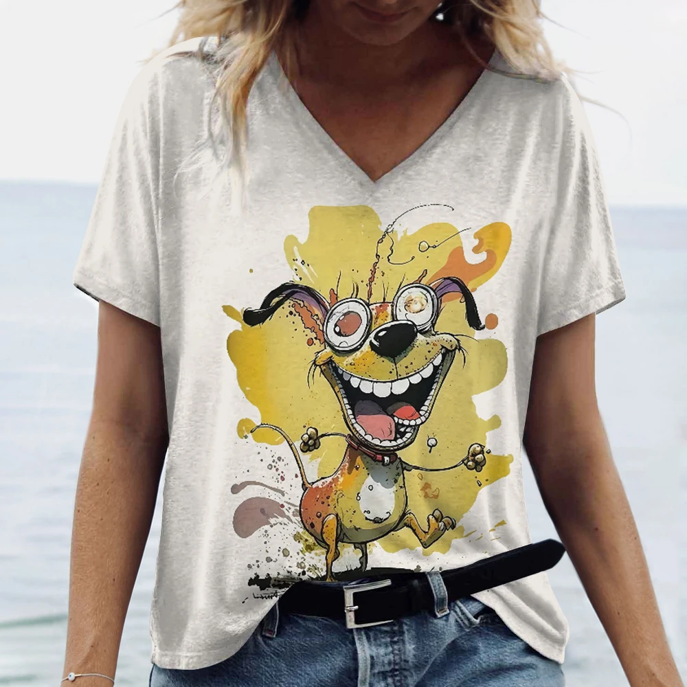 Women's Animals Printed T-Shirts Wacky Casual Short Sleeve Tshirt V-Neck Tie-Dye Oversize Woman Tops Pullover 2024 Streetwear