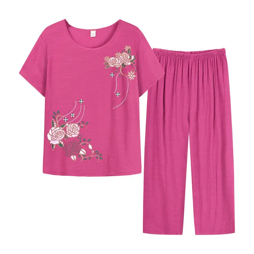 Summer Women Pants Pajama Set Short Sleeve Floral Print Suits T-shirt Pants Loose Two Pieces Pant Sets Outfit Middle-aged