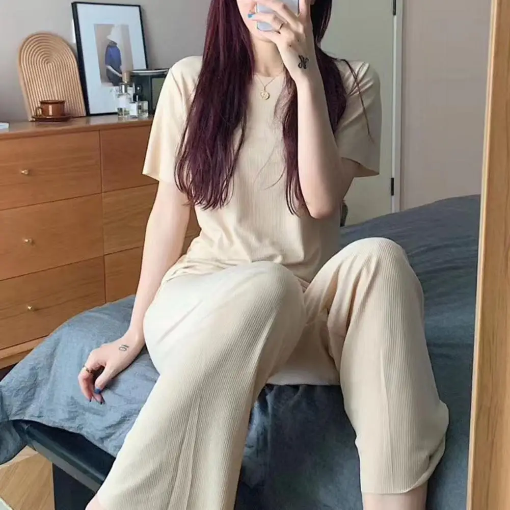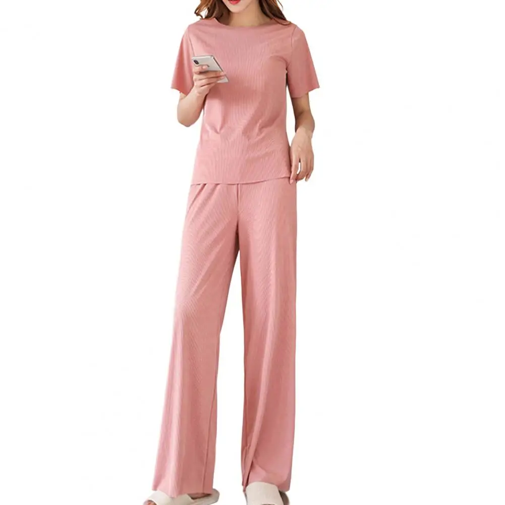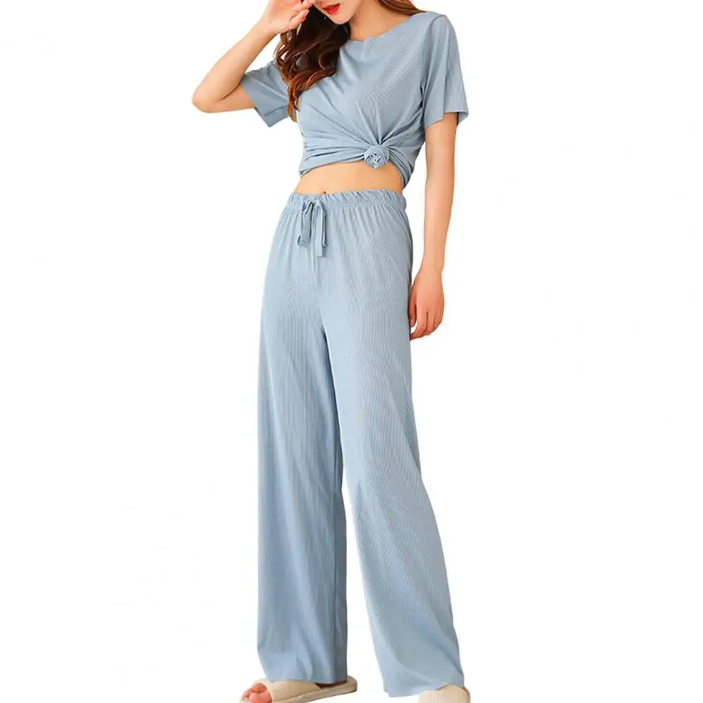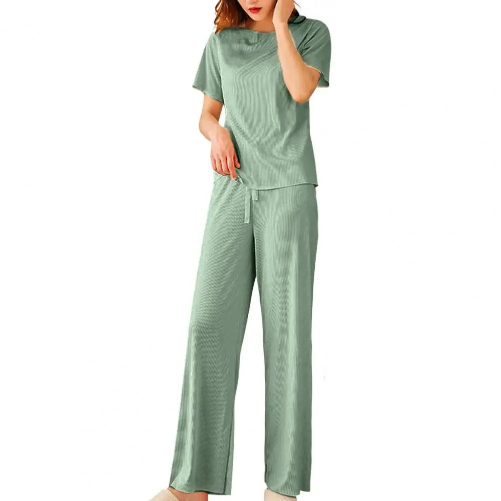Women 2Pcs/Set O-neck Short Sleeve Outfit Drawstring Straight Wide Leg Ice Silk T-shirt Pants Loungewear Set