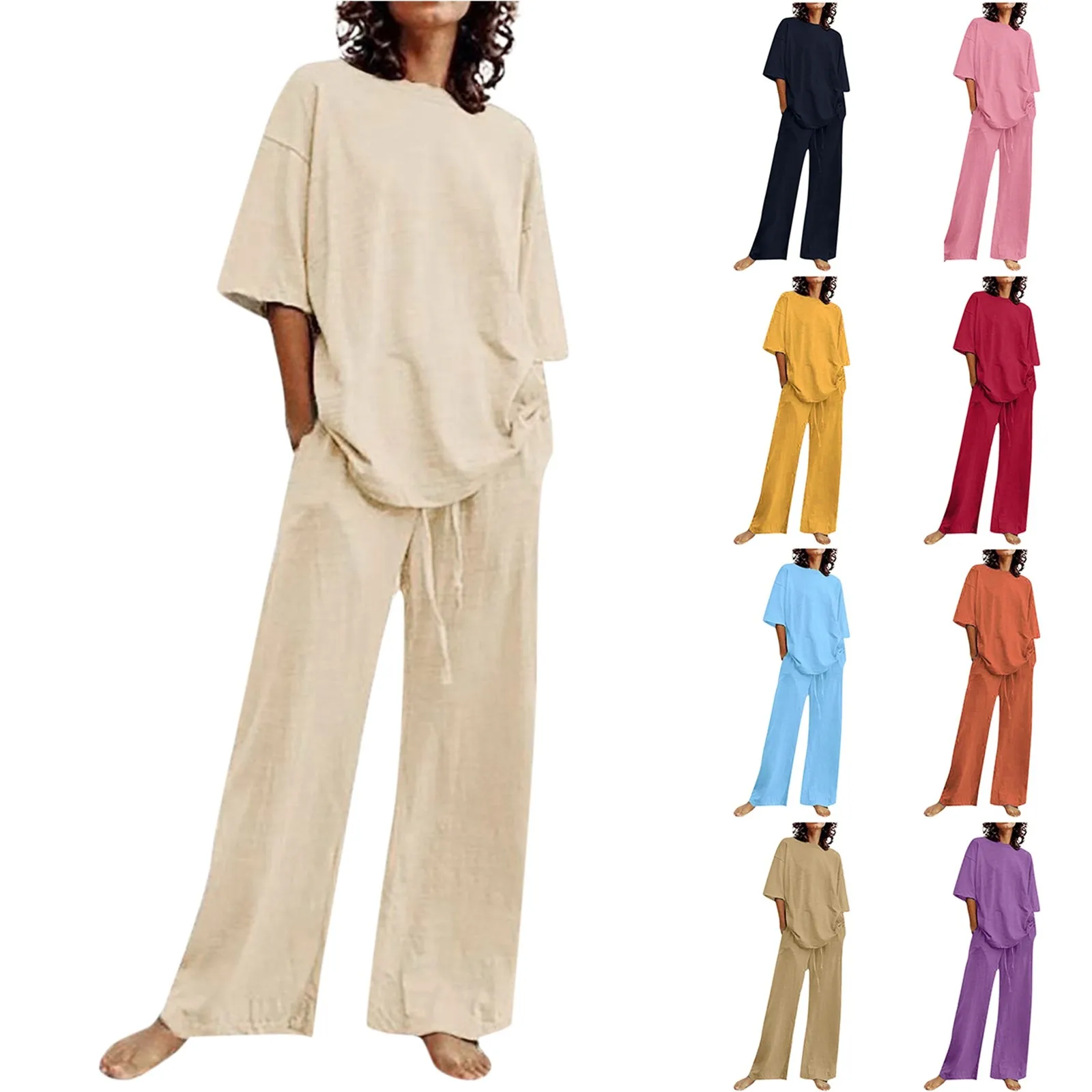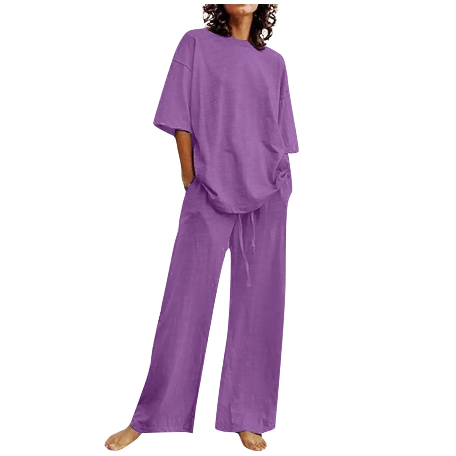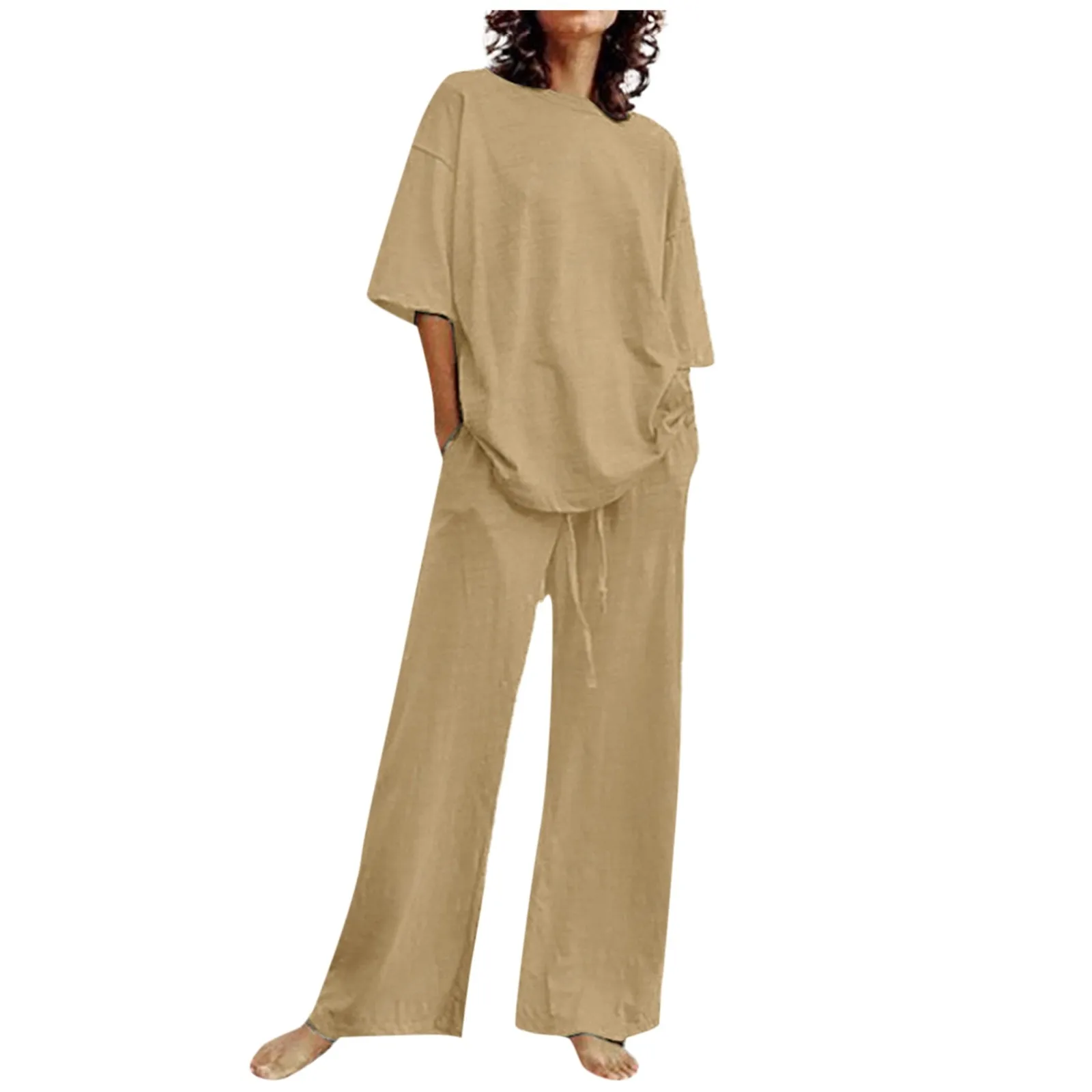 Women Summer Casual Fashion Set Solid Color Half Sleeve Elastic Waist Drawstring Pocket Wide Leg Pants 2 Pieces Suit 2024