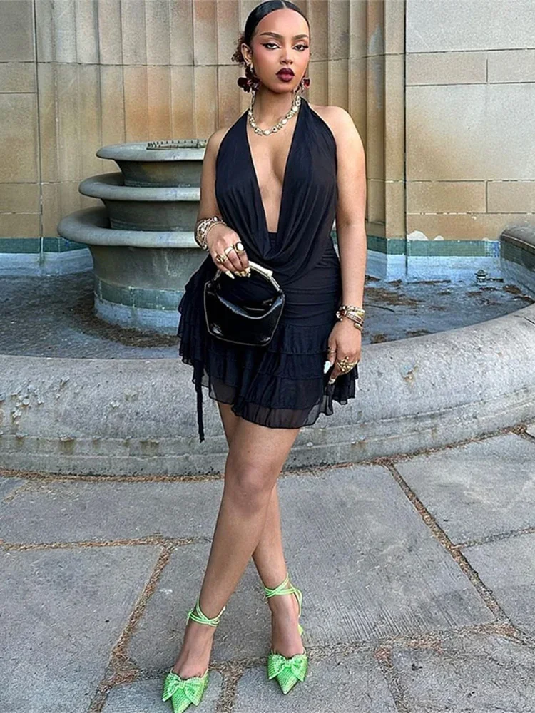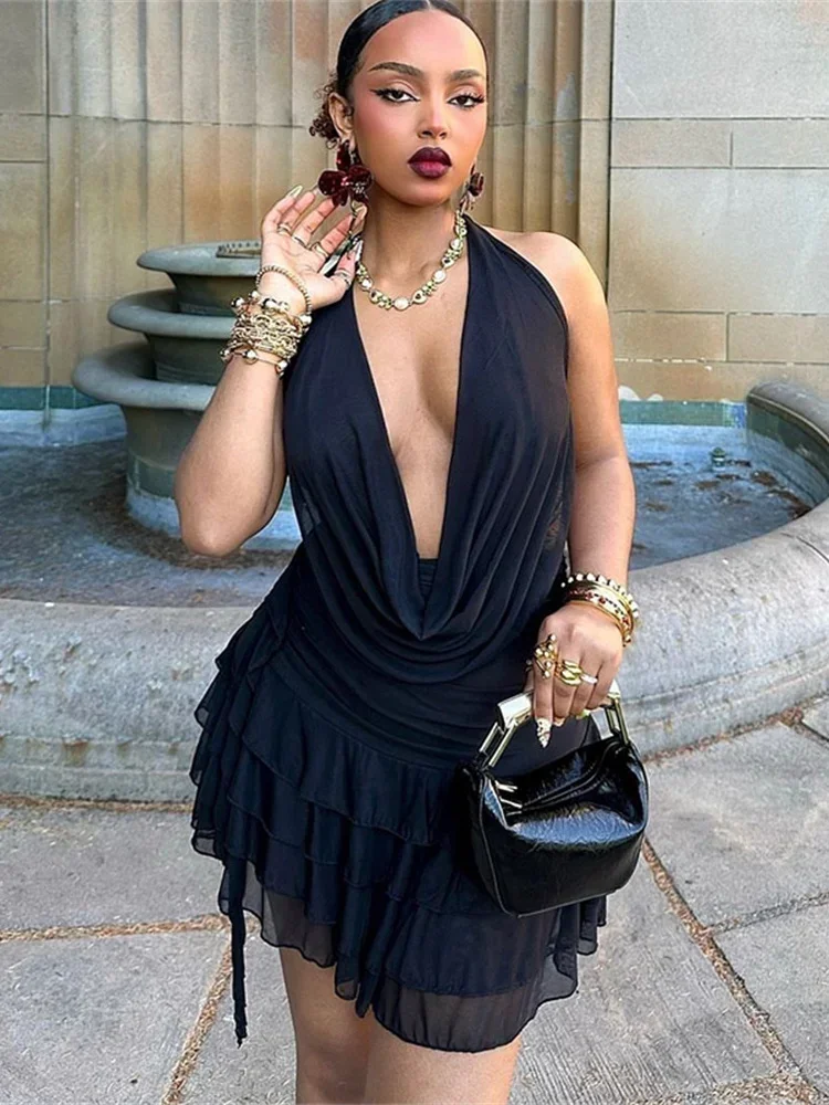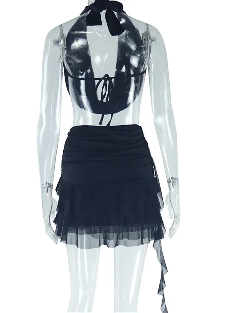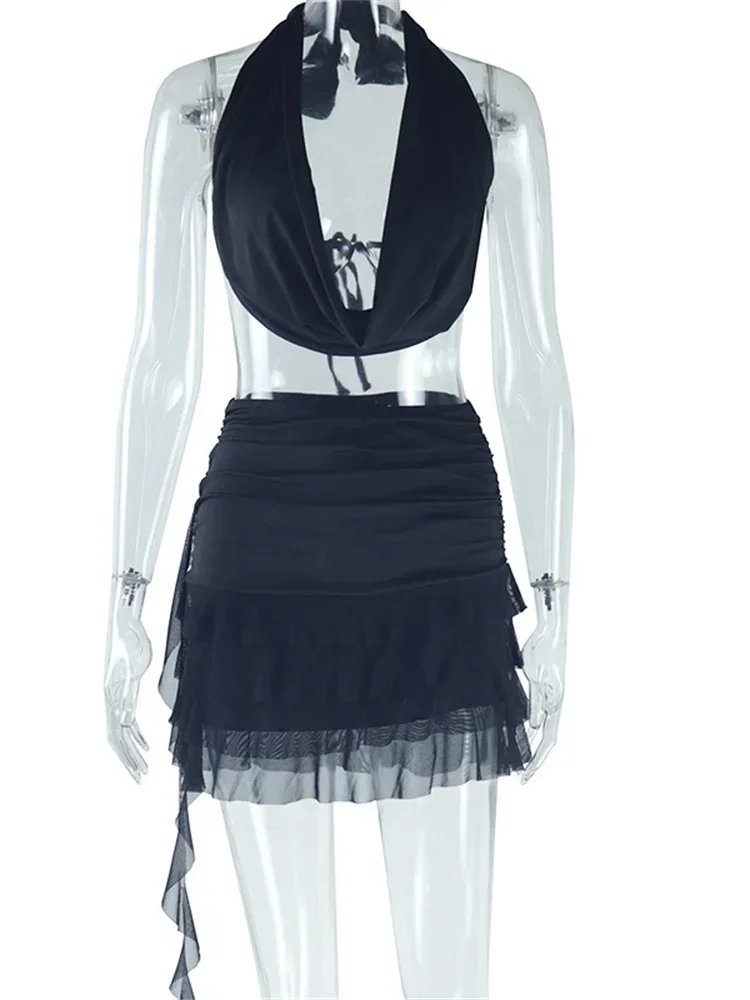 Leosoxs Sexy Elegant Women 2 Piece Set Halter Backless Swing Collar Tank Tops+Ruched Tierred Peach Hip Skirts Matching Outfit