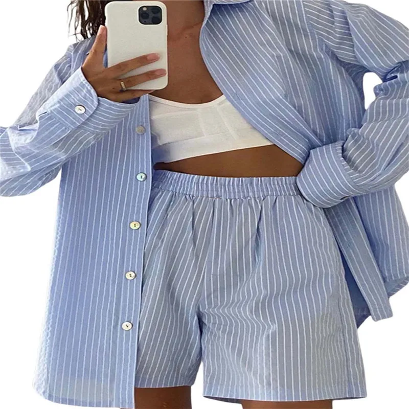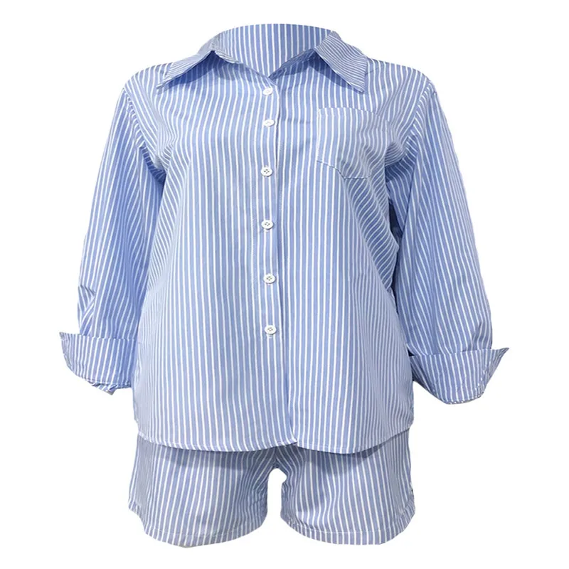 Women Casual Shorts Pieces Outfits Female Striped/ Plaid Turn-Down Collar Long Sleeve Shirt+ Short Pants for Summer Loungewear