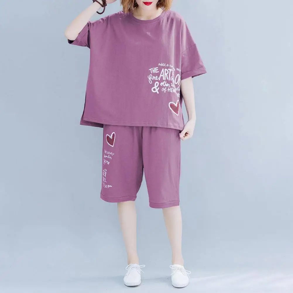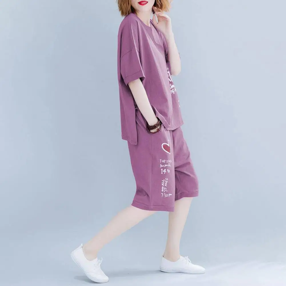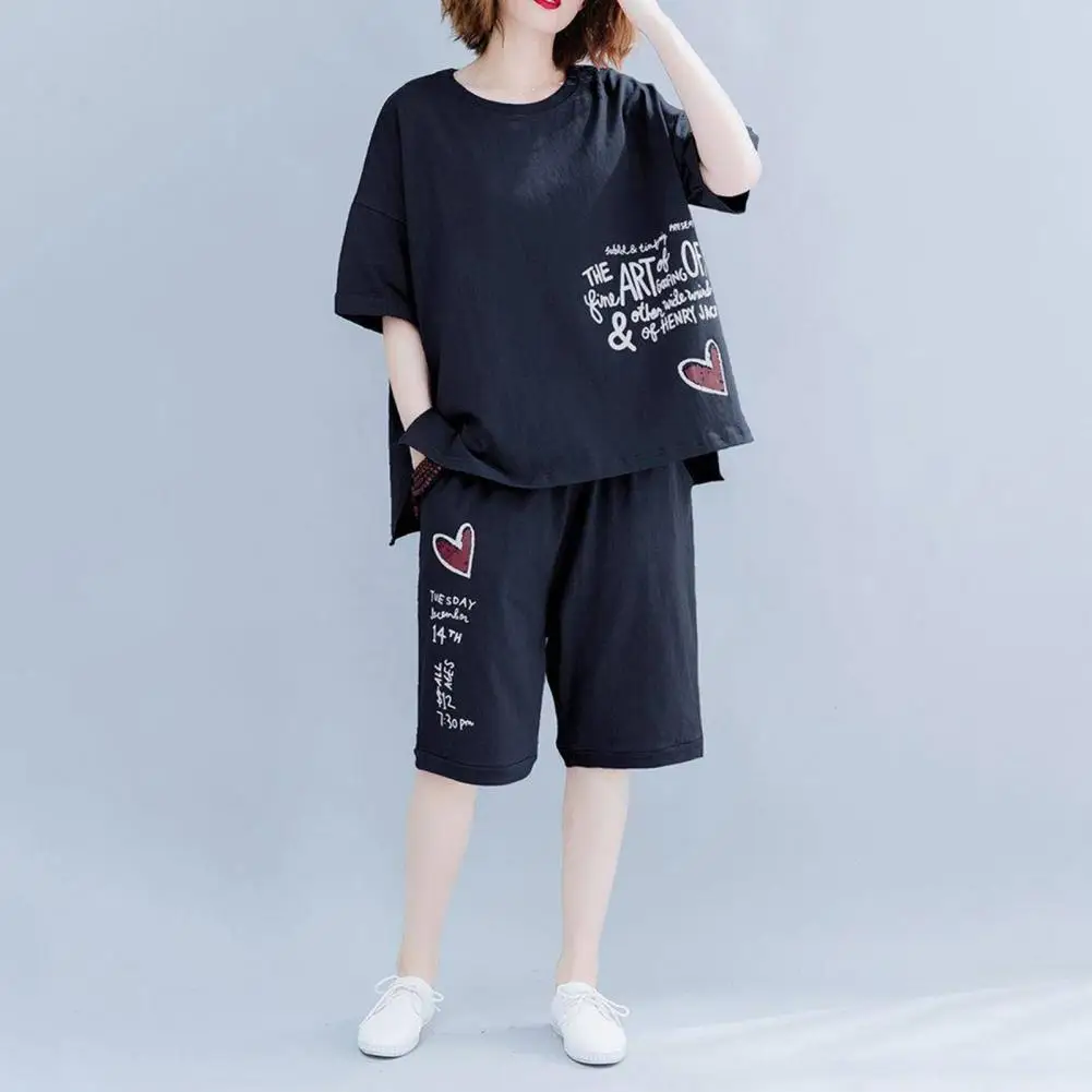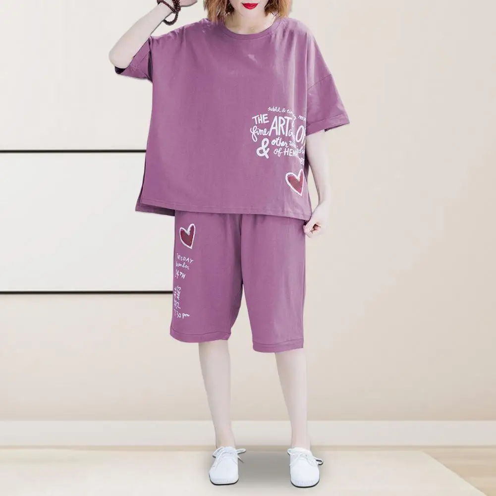 Loose Fit Women Suit Women's Casual Tracksuit Set Letter Print T-shirt Knee Length Shorts with Elastic Waist Comfortable Daily