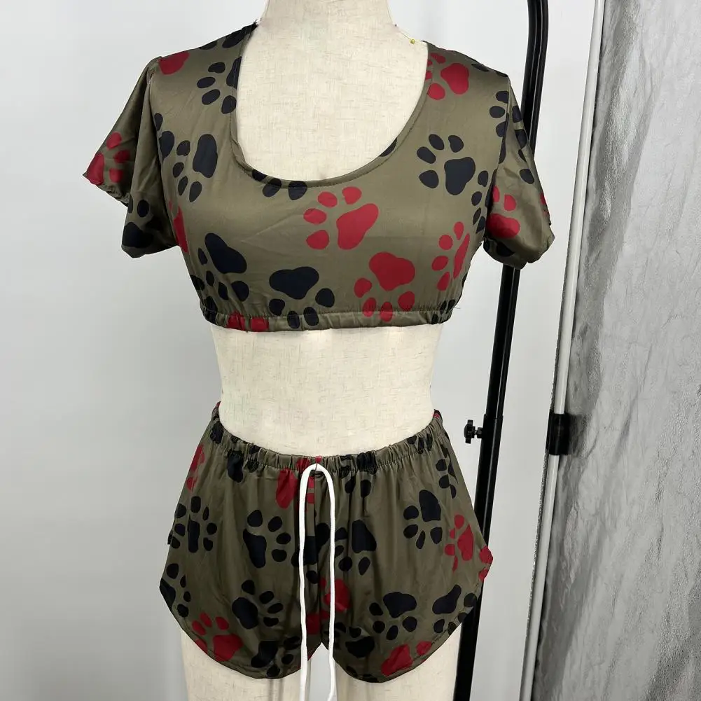 2 Pcs/Set Women Pajamas Set V Neck Cartoon Paw Print Drawstring Slim Fit Outfit Short Sleeve Sleepwear Homewear Top Shorts Set