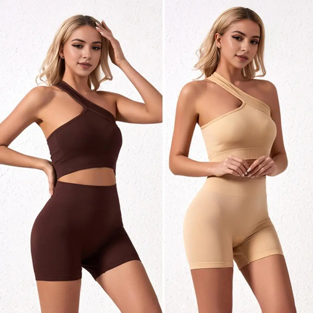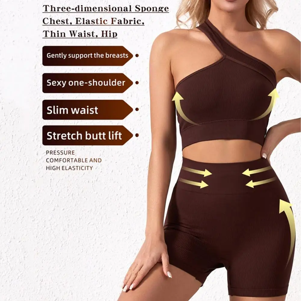Fitness Vest Shorts Set Sponge Cup Off Shoulder Yoga Outfit High Waist Tummy Control Shorts One-piece Butt-lifted Sportswear