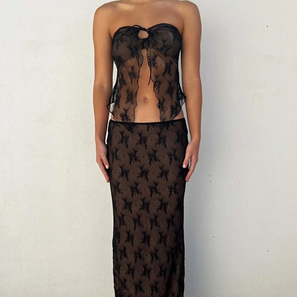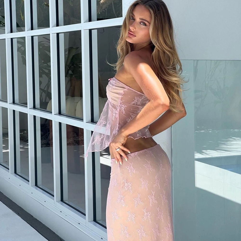 Combhasaki Womens Summer 2Pcs Outfits Strapless Drawstring Lace Split Front Irregular Tube Tops+ Low Waist Long Pencil Skirt Set