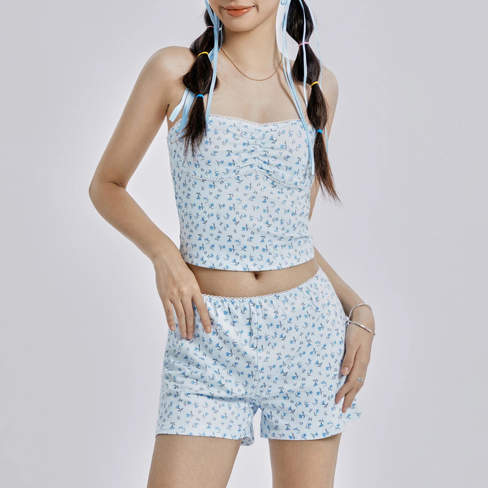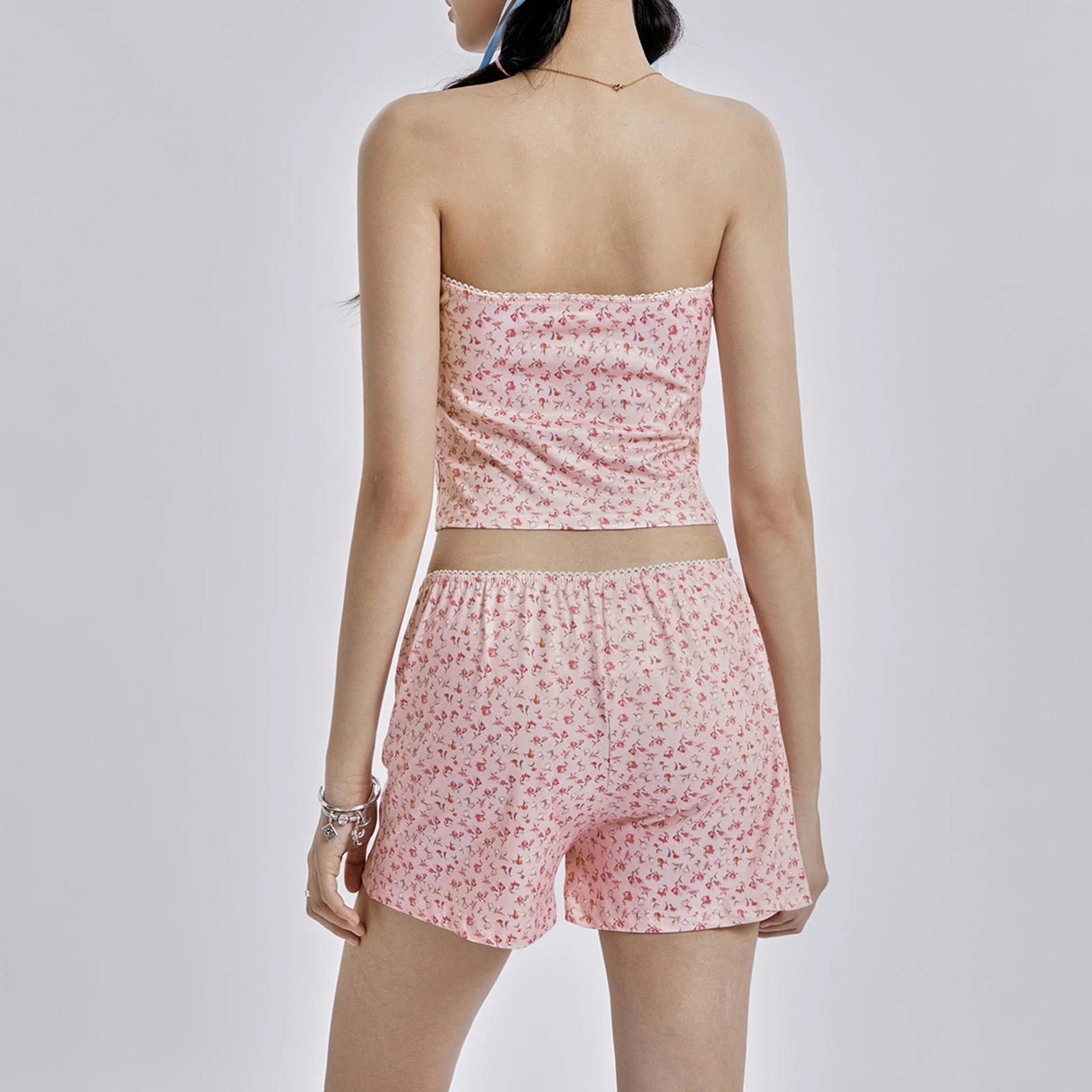 Women Summer Two Pieces Set Floral Print Lace Trim Strapless Chest Wrap Tube Top + Shorts Vintage Chic Outfits Streetwear